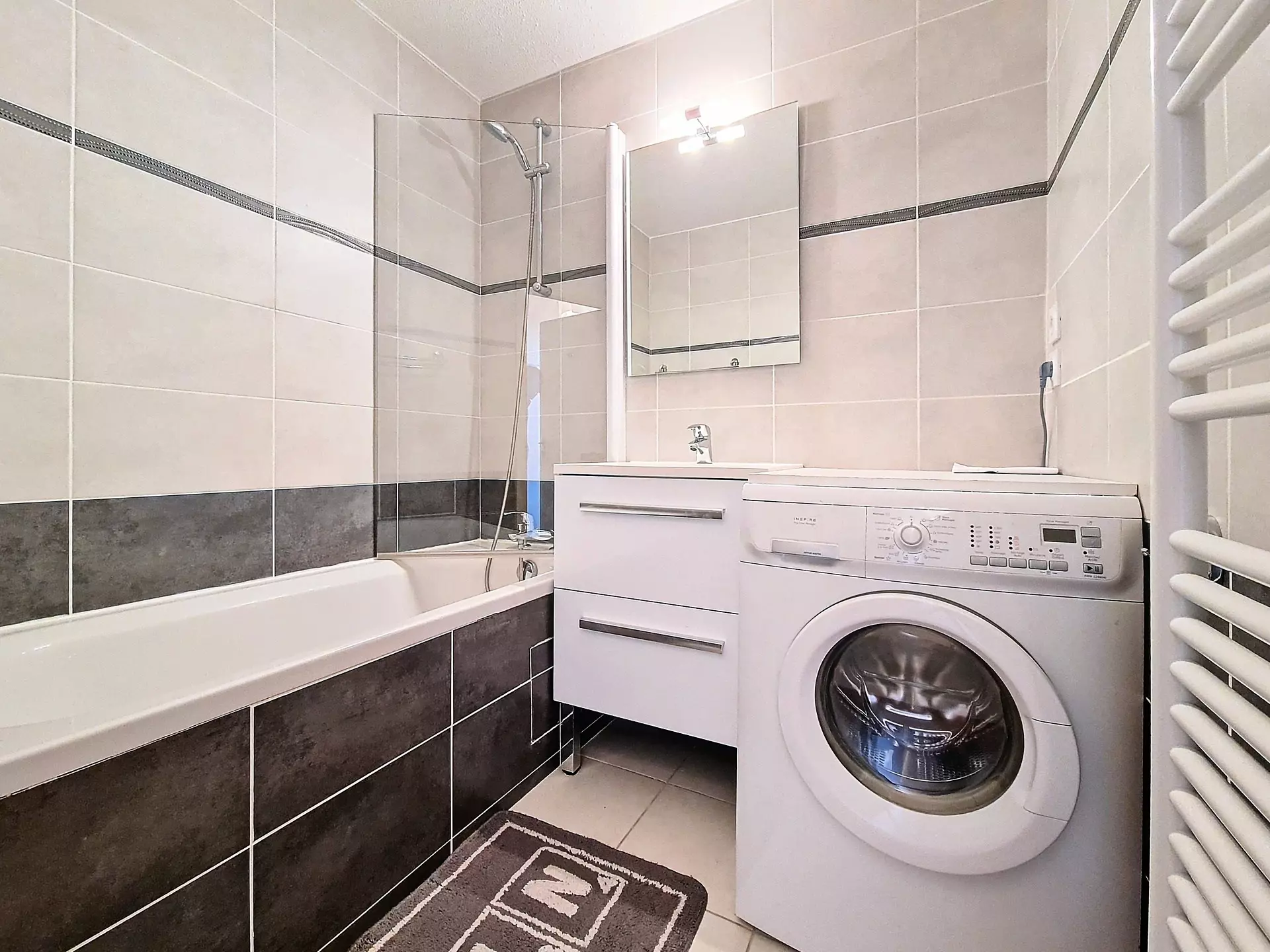Salle de bains avec baignoire et lave linge.