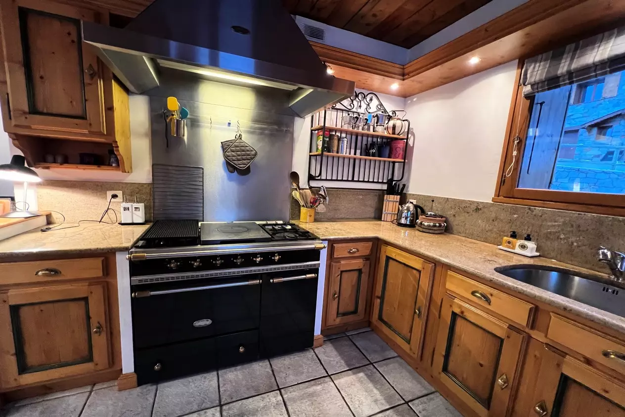 Cuisine ouverte avec 2 plaques à gaz, plancha, réfrigérateur, four traditionnel, lave-vaisselle, bouilloire, cafetière électrique