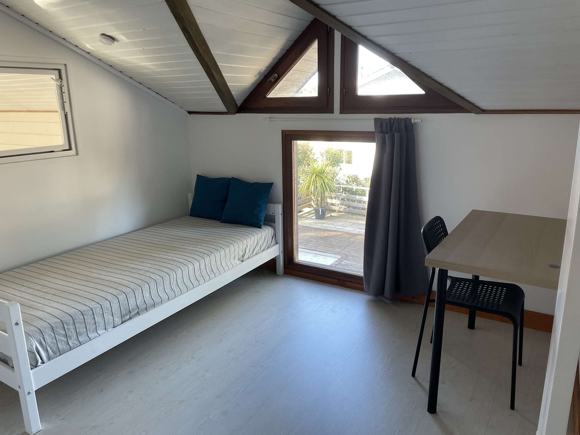 Un salon avec petite cuisine séparé par un rideau peut accueillir deux couchages de plus avec un lit gigogne