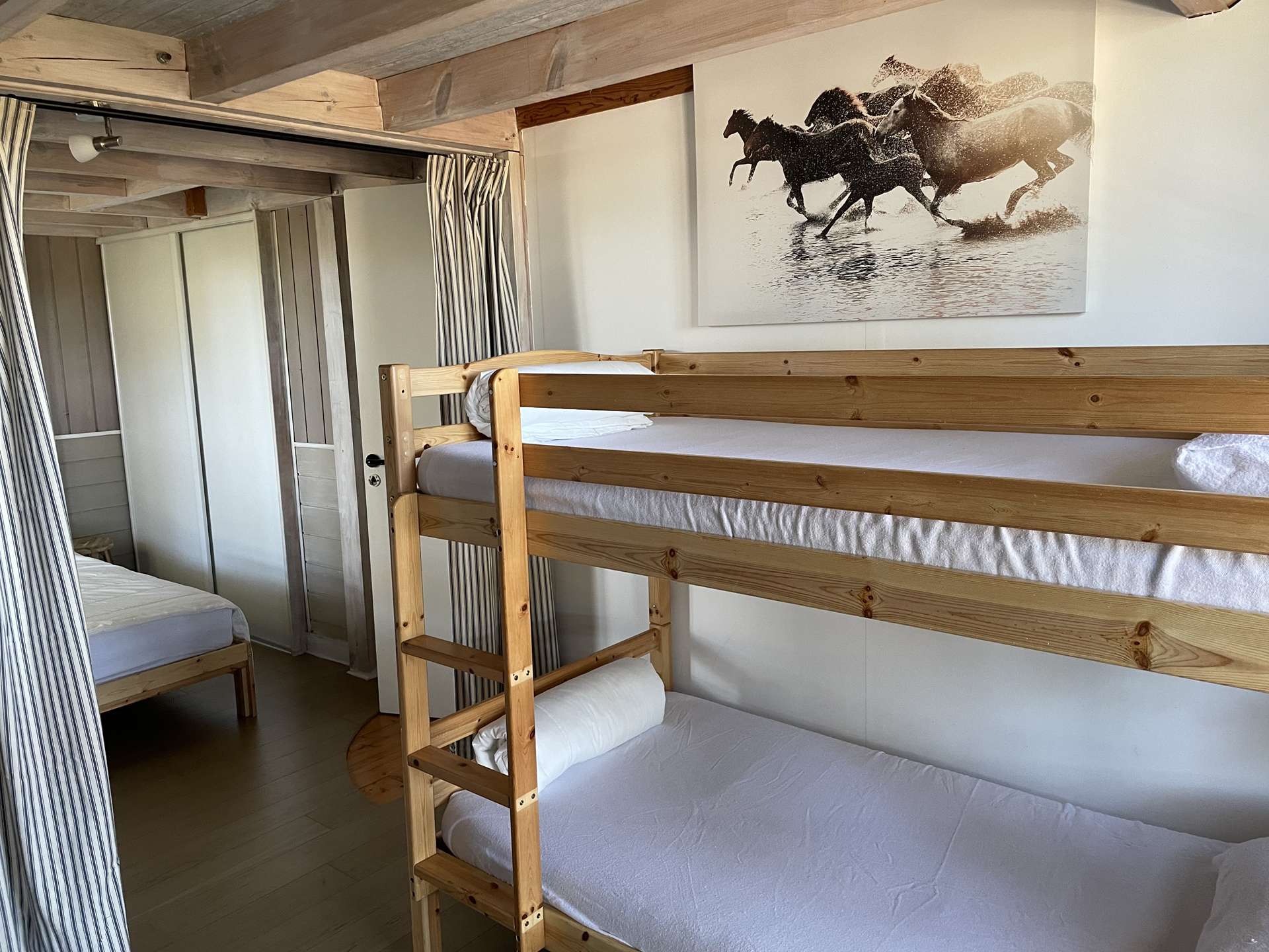 Les couchages sont répartis sur 5 chambres, 1 suite parentale avec salle de bain et wc, 2 avec des lits doubles en 160 cm, 1 chambre avec 1 lit superposé en 80cm/190cm et 2 lits simples en 90cm/200cm80cm et 2 lits simples en 90cm/200cm.