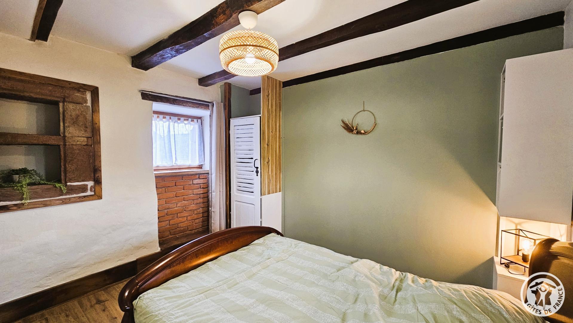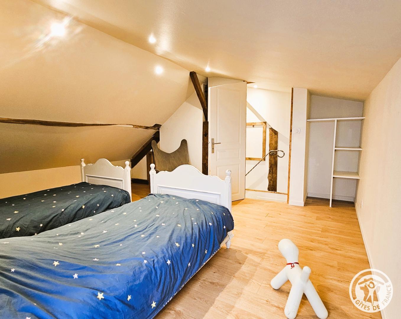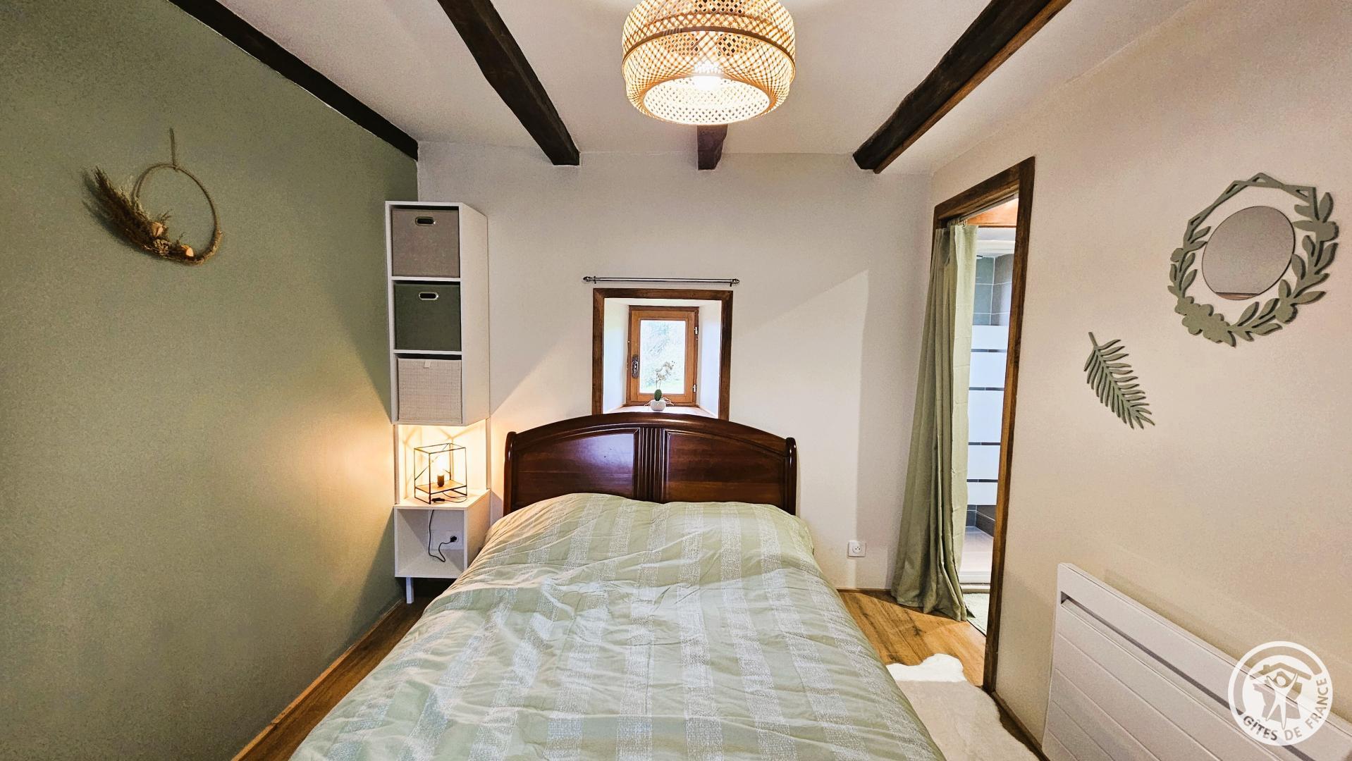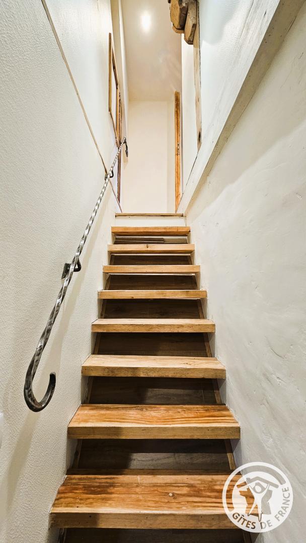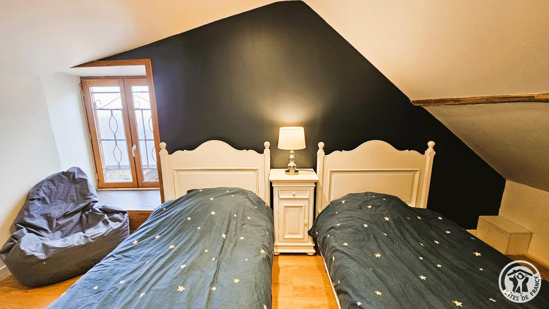 L'escalier à côté de la cuisine conduit à la troisième chambre, aménagée avec deux lits en 90 cm. Depuis le salon, un escalier à pente prononcée donne enfin accès à une mezzanine avec un canapé-lit, parfait pour un couchage d'appoint.