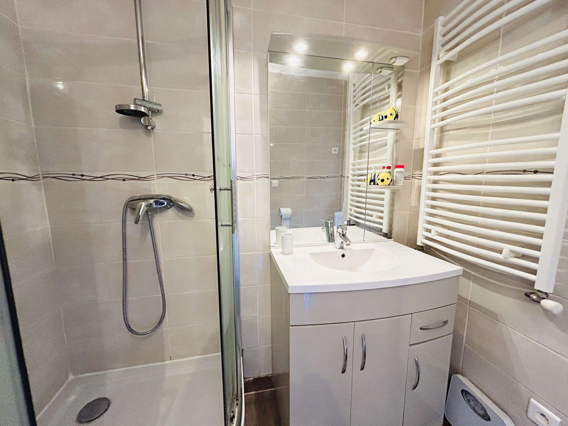 L’appartement dispose également d’une salle de douche avec WC et d’une chambre confortable avec un lit en 140, parfaite pour se reposer après une journée à la plage ou au port.