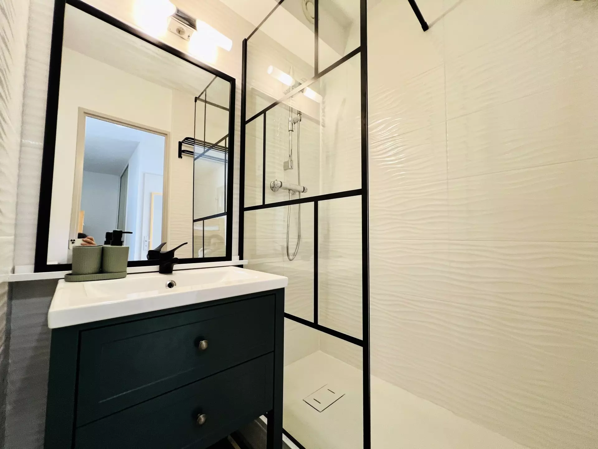 La salle d’eau dispose d’une douche avec toilettes.