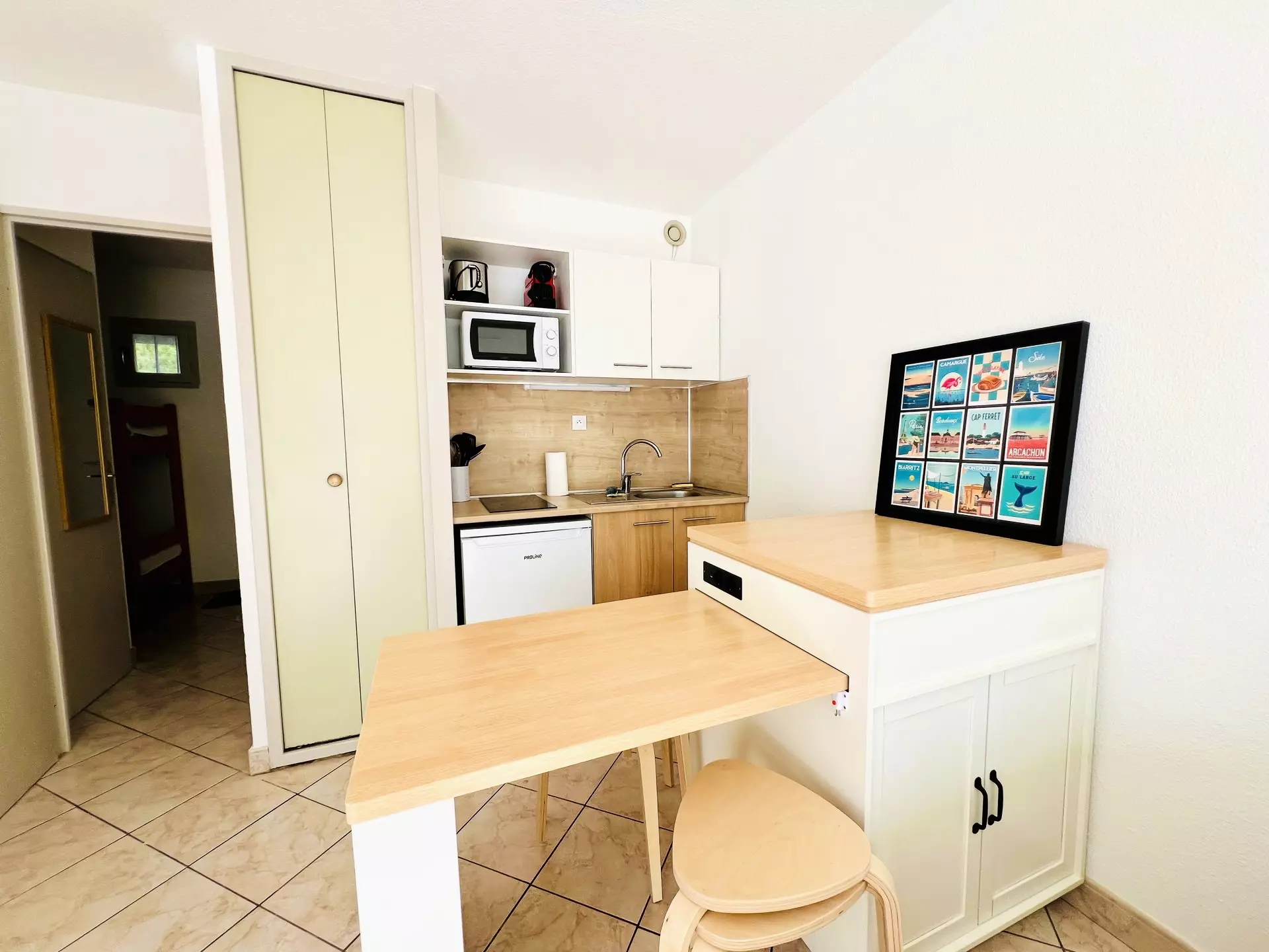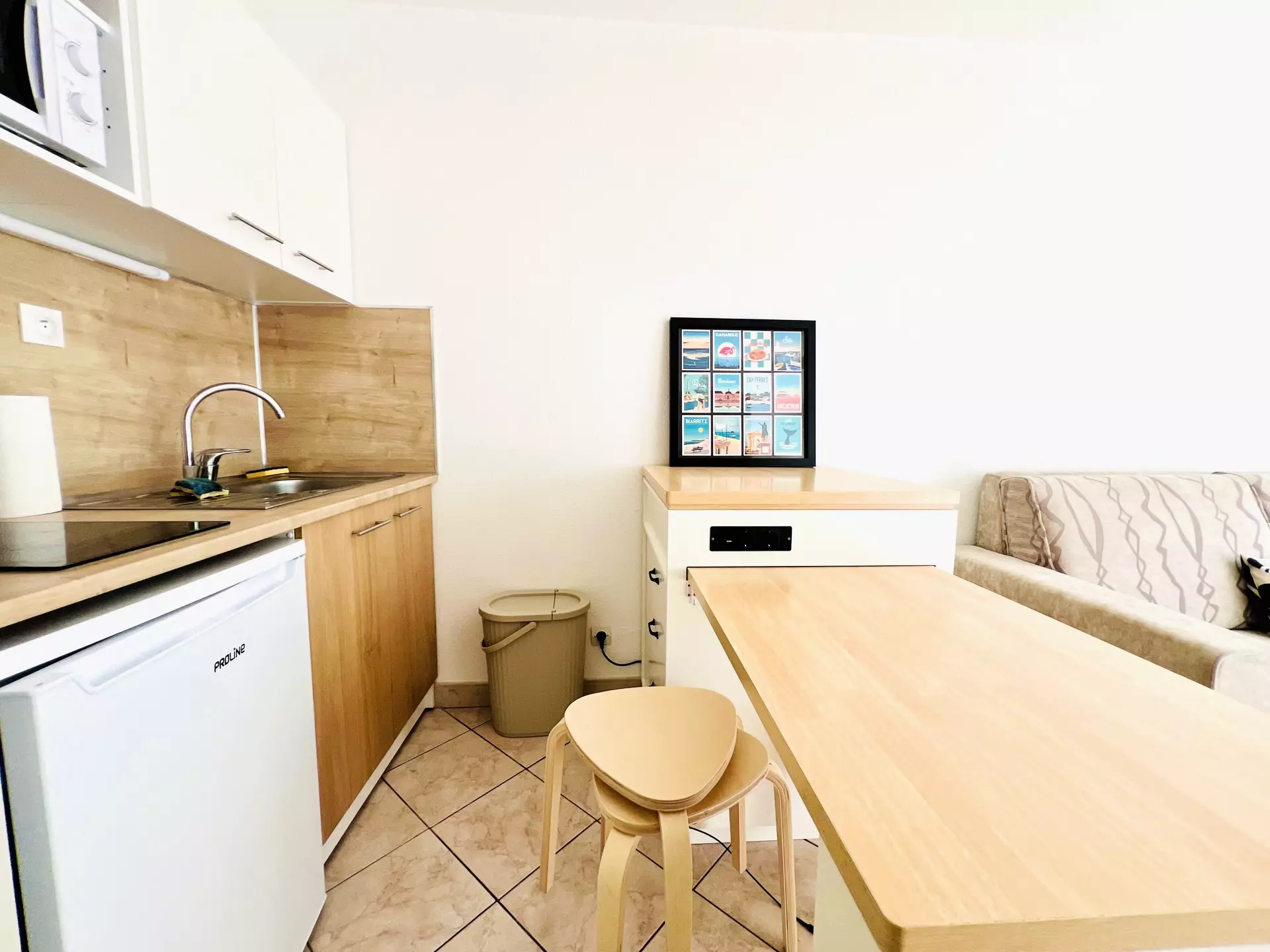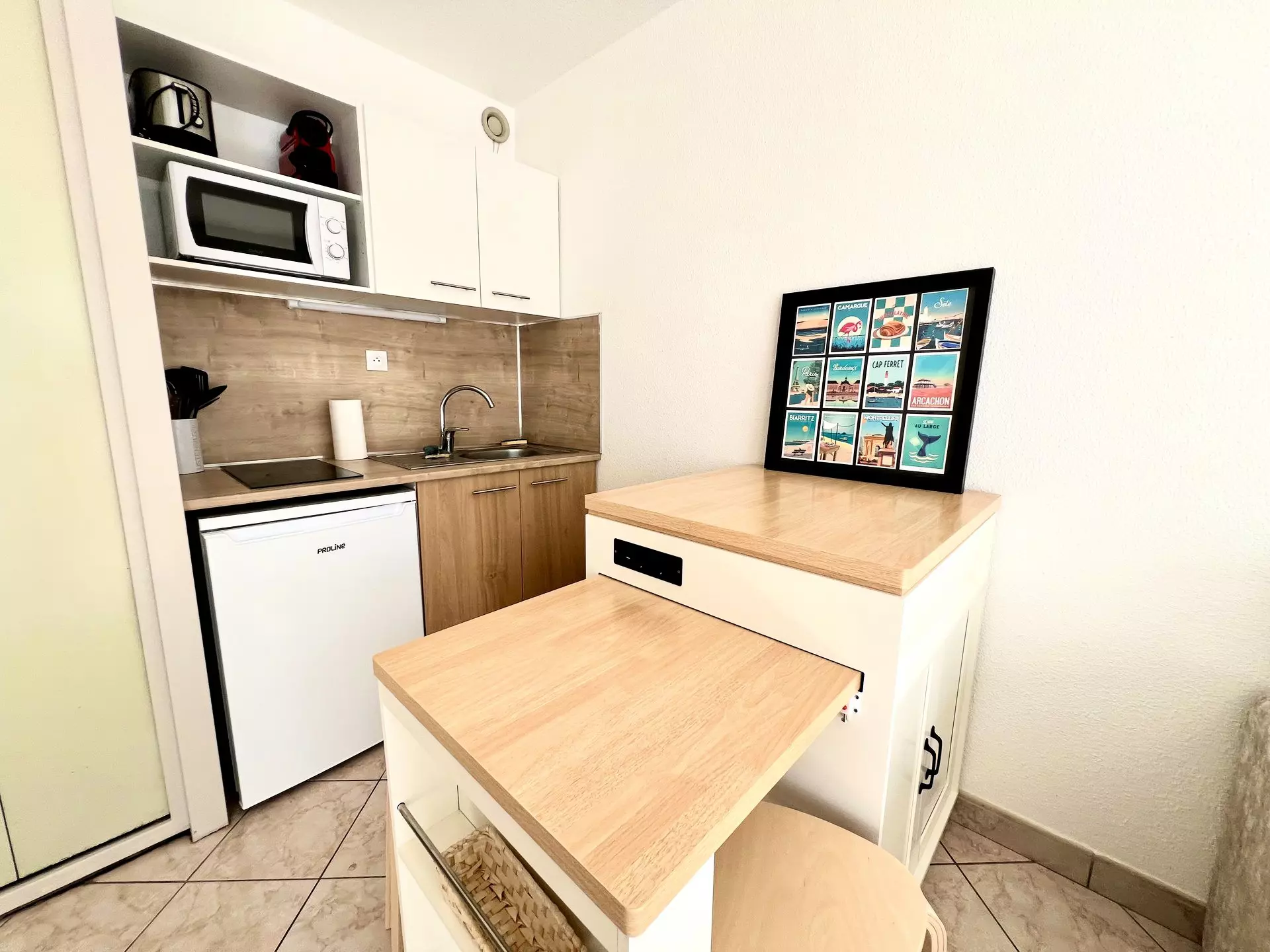 L’espace de vie se compose d’une cuisine ouverte, récente, équipée d’un micro-ondes, d’une cafetière Nespresso, d’un grille-pain