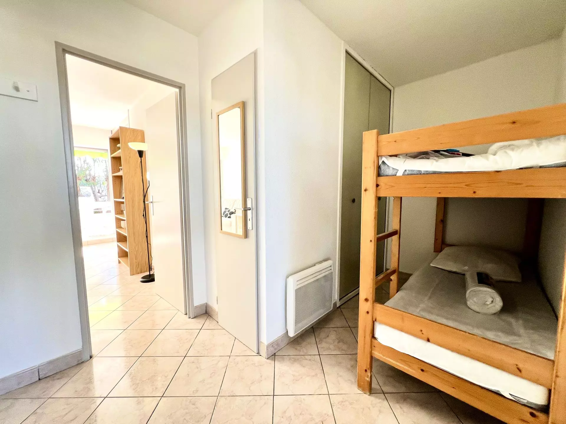 La cabine à l’entrée possède deux lits simples superposés, le lit supérieur n’étant pas adapté aux enfants de moins de 6 ans (article 6 du Décret n°95-949 du 25 août 1995).