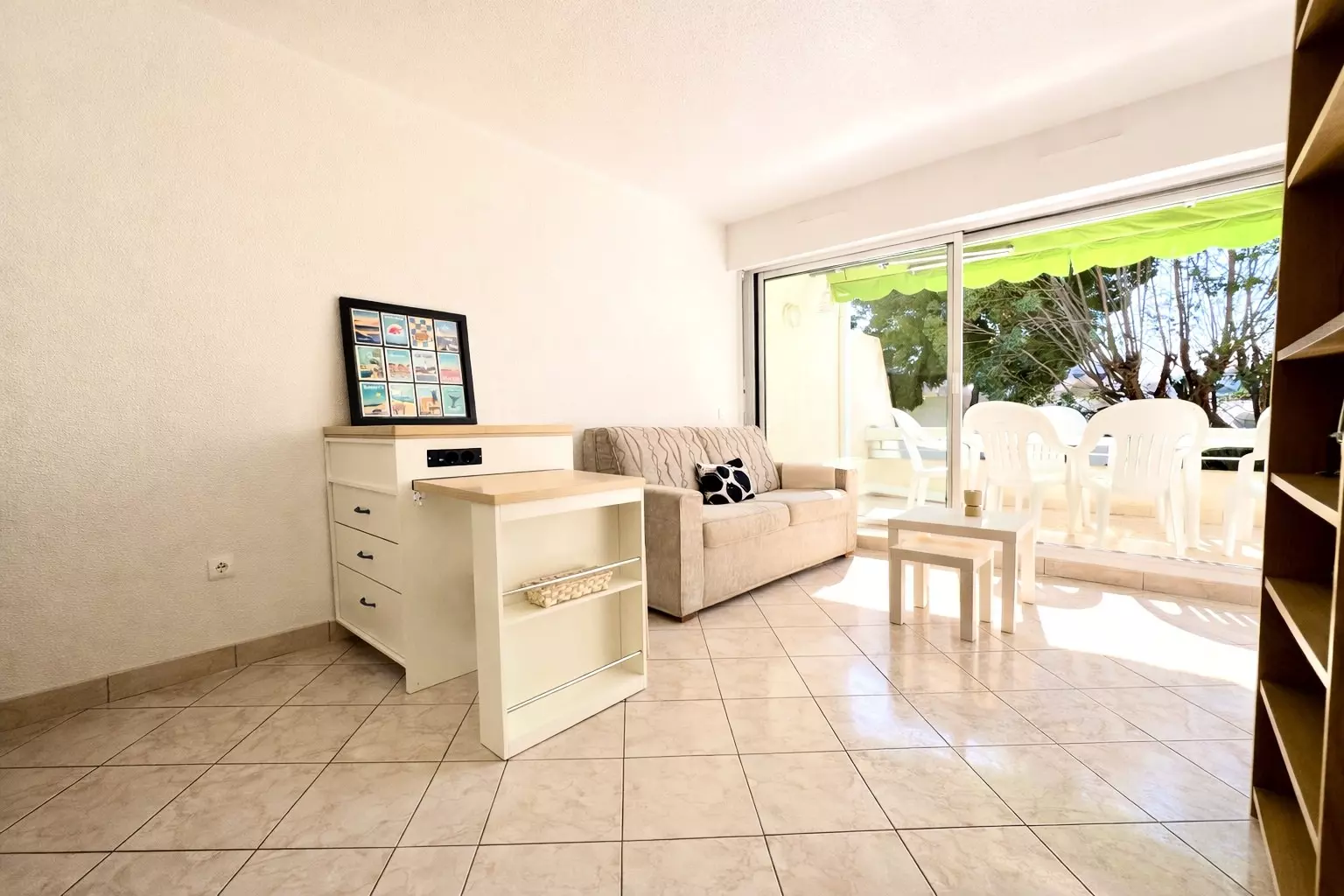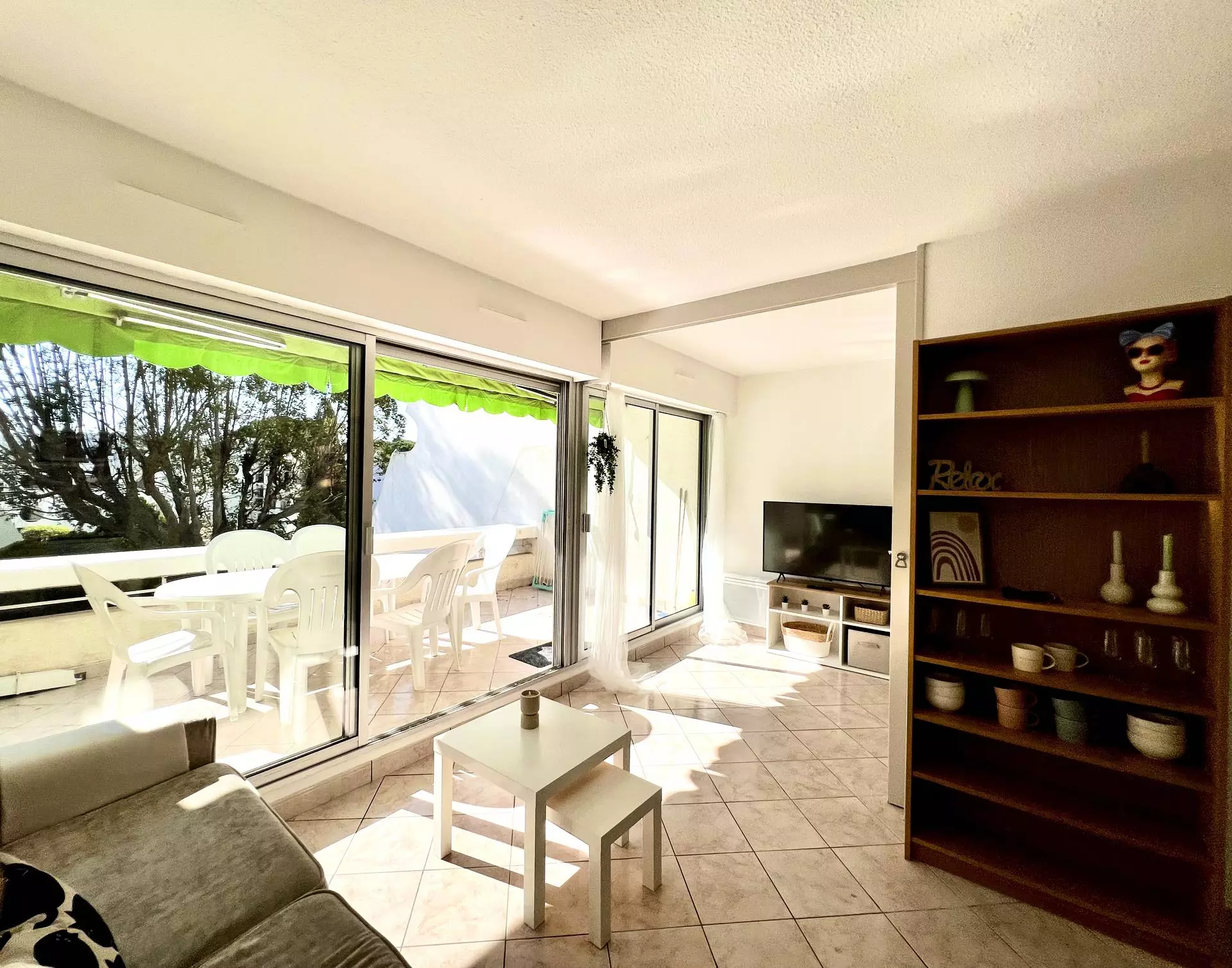 Le séjour, qui s’ouvre sur une belle terrasse exposée sud, dispose d’un canapé convertible et d’une télévision écran plat, idéal pour profiter des beaux jours.