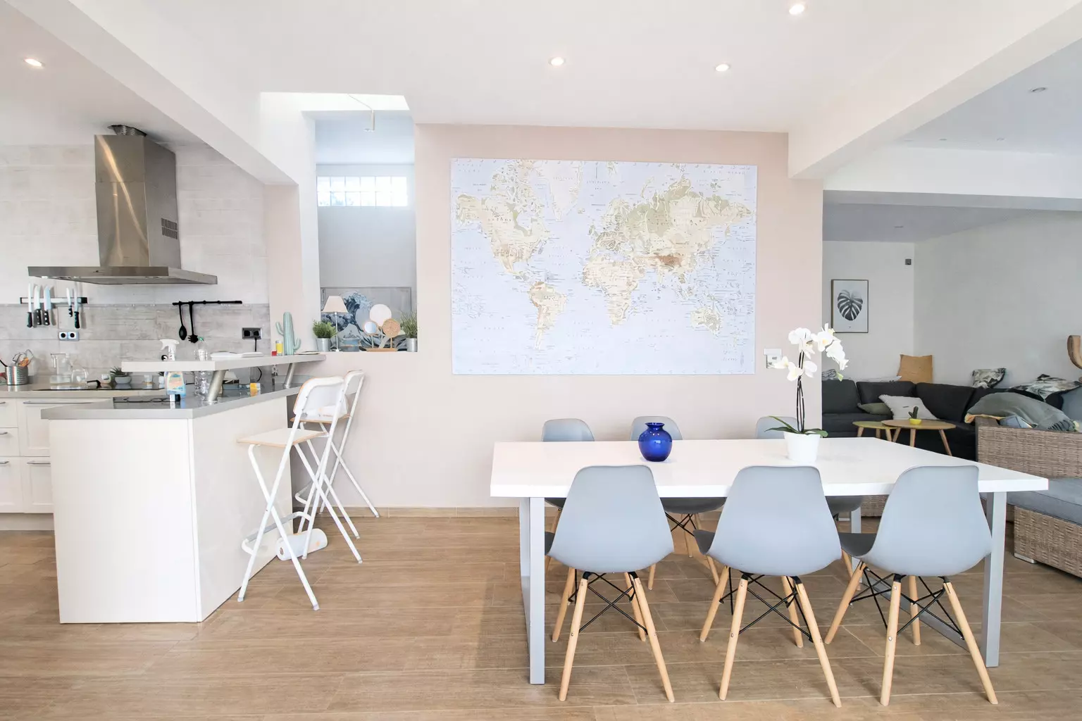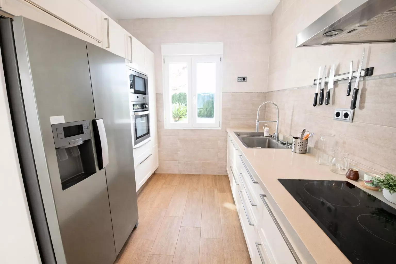 La cuisine américaine, à vitrocéramique, est équipée avec réfrigérateur, micro-ondes, four, congélateur, lave-vaisselle, vaisselle/couverts, ustensiles/cuisine et cafetière.