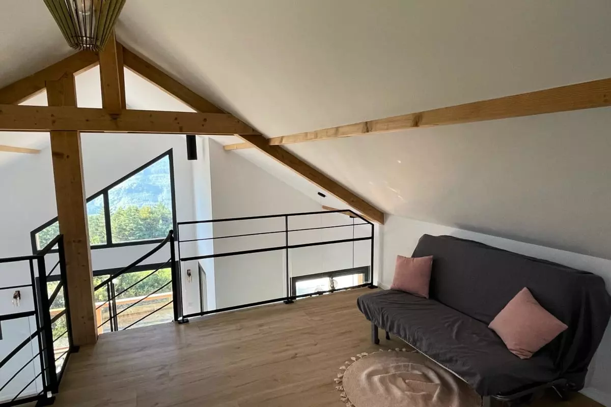 Dans le salon, un canapé relax électrique est à disposition, et dans la mezzanine, un canapé BZ de taille 120x190 pouvant faire office de 4ᵉ chambre, ainsi qu’un espace de travail confortable.