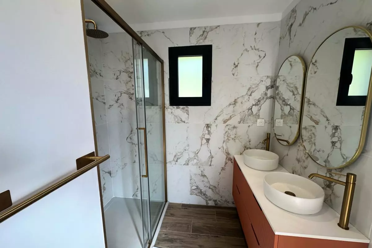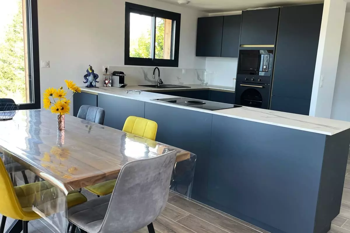 Cette maison comprend une chambre avec deux lits simples de taille 80x200, une deuxième chambre avec un lit double de taille 160x200, et une troisième chambre avec un lit double de taille 140x200. Vous y trouverez également une cuisine toute équipée et deux salles de douche.