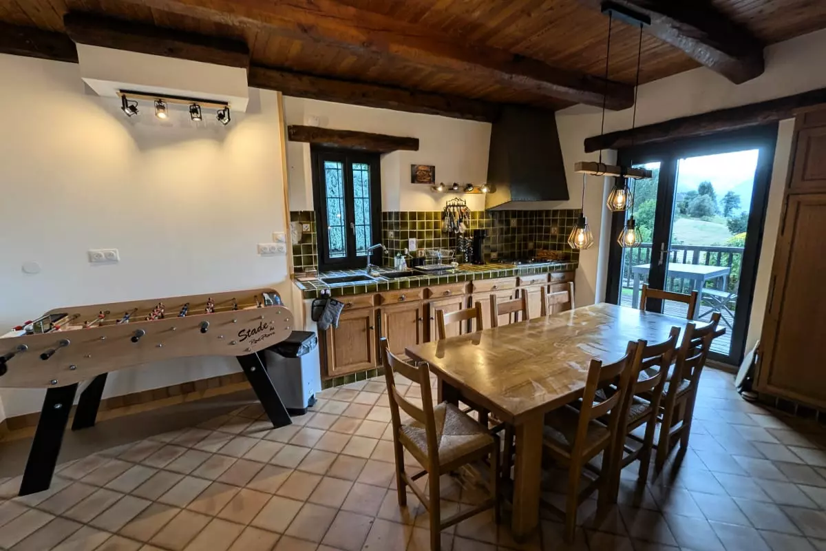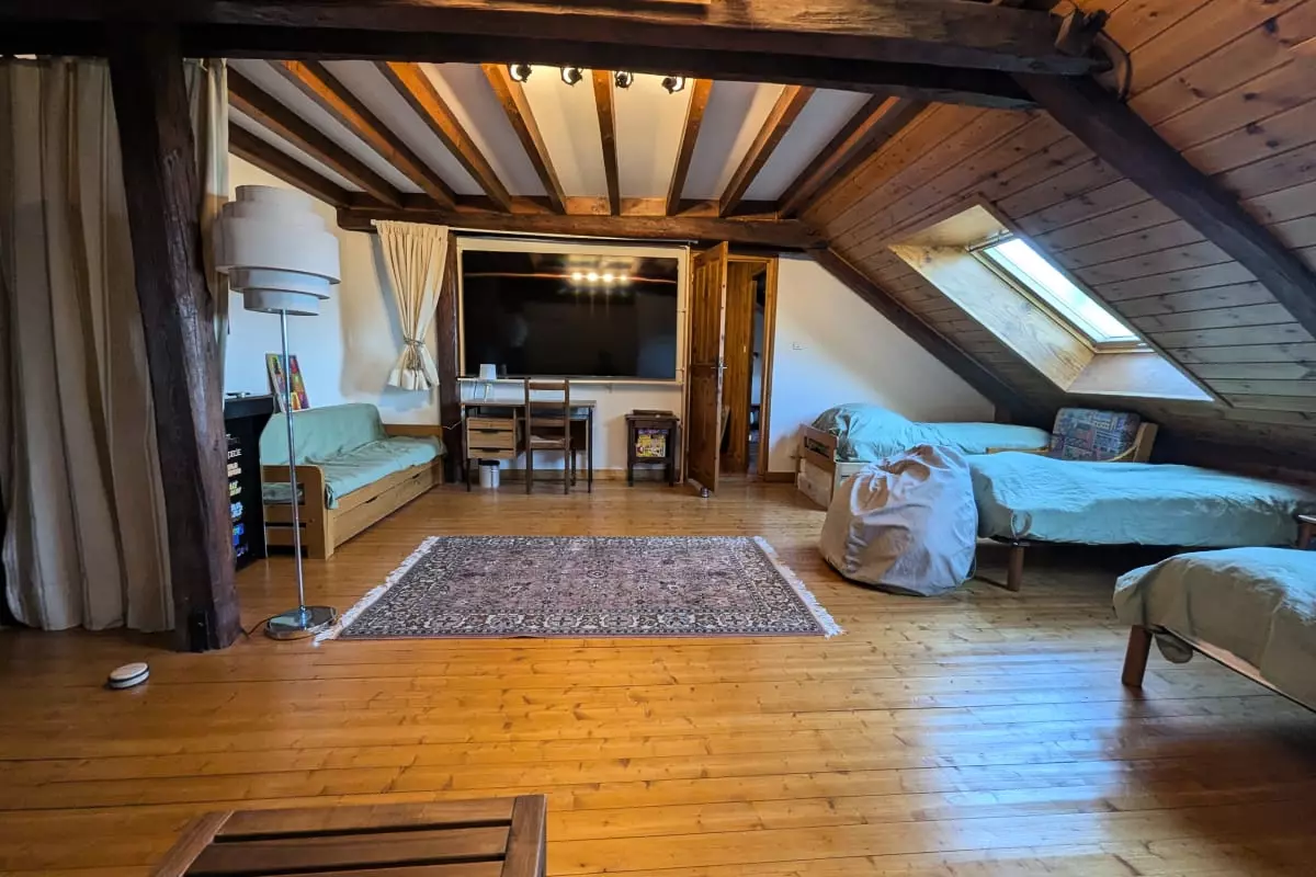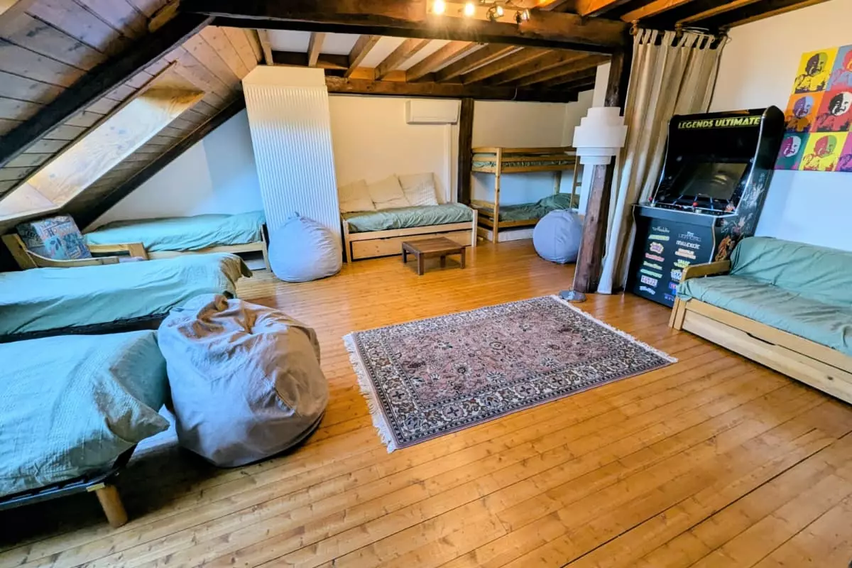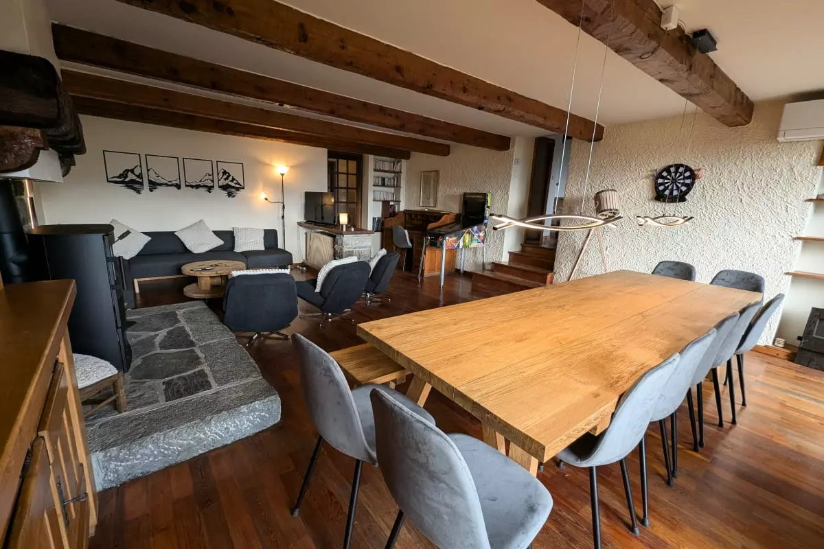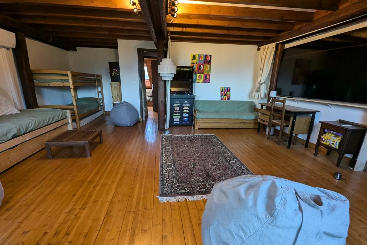 Pour vos moments de détente et de divertissement, poele à bois inclus (bois en option), ainsi qu’un flipper, une borne arcade, un baby-foot, et de nombreux jeux de société. De plus, un écran de 85 pouces vous attend pour des soirées cinéma inoubliables. Une table de jeux pour le poker ou les cartes vient compléter cet espace ludique.