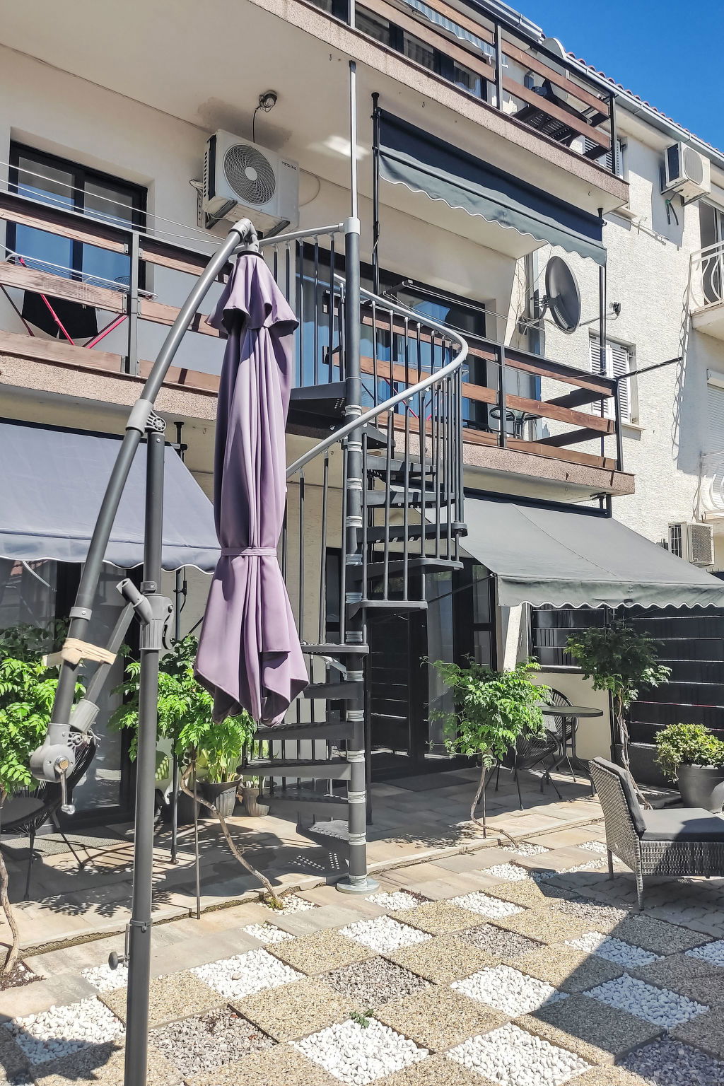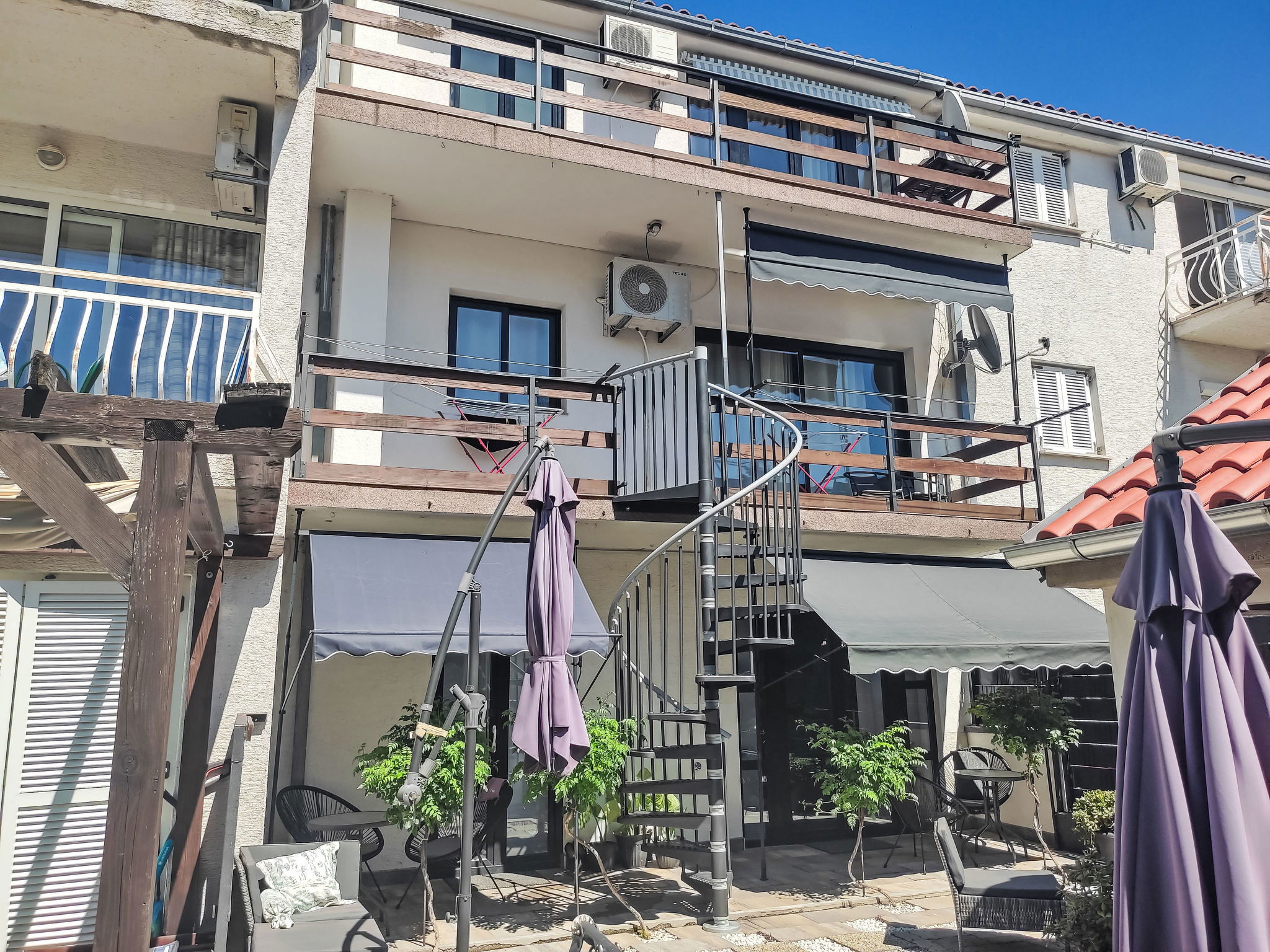 Novi Vinodolski: Immeuble "Deleut", de 3 étages. À 1 km du centre de Novi Vinodolski, à 1.8 km de la mer, à 1.8 km de la plage. En commun: terrain 400 m2 (clôturé). Terrasse (50 m2), barbecue, espace barbecue. Infrastructures de la Maison: accès internet, lave-linge. Place de parking près de la maison sur le terrain. Magasins, restaurant 800 m, arrêt de bus 1 km, plage de graviers 1.8 km. Veuillez noter: le propriétaire habite sur le même terrain.