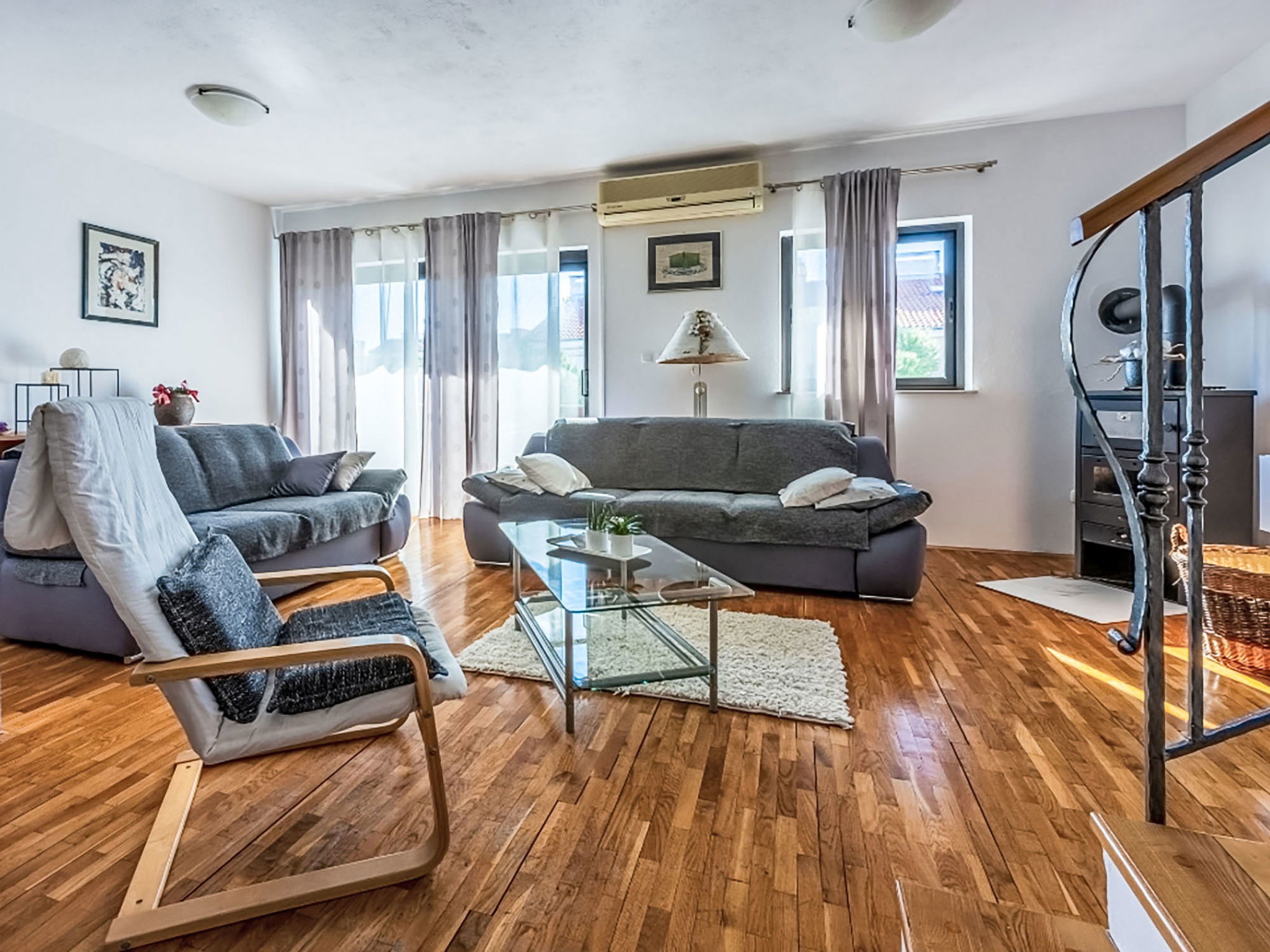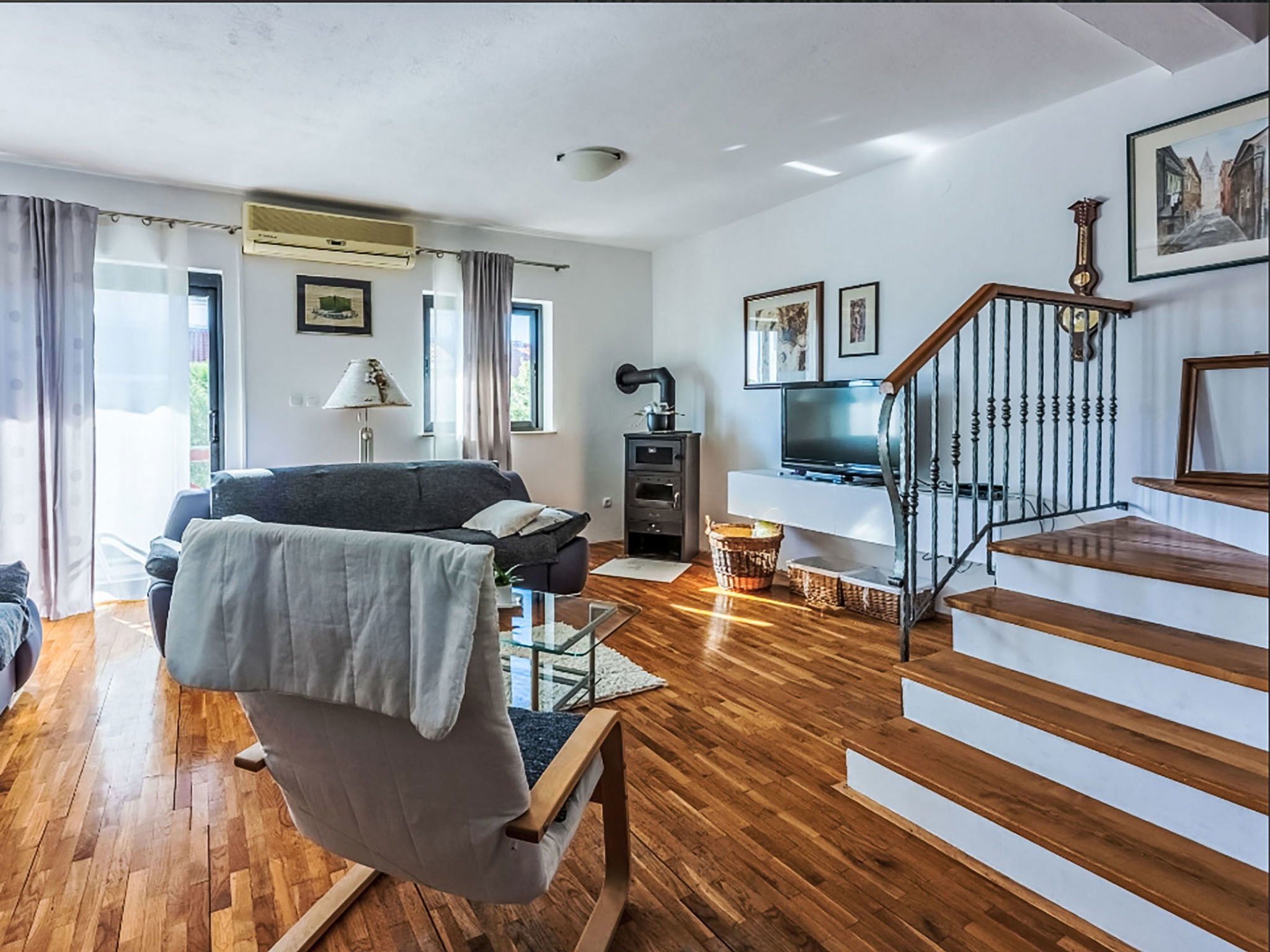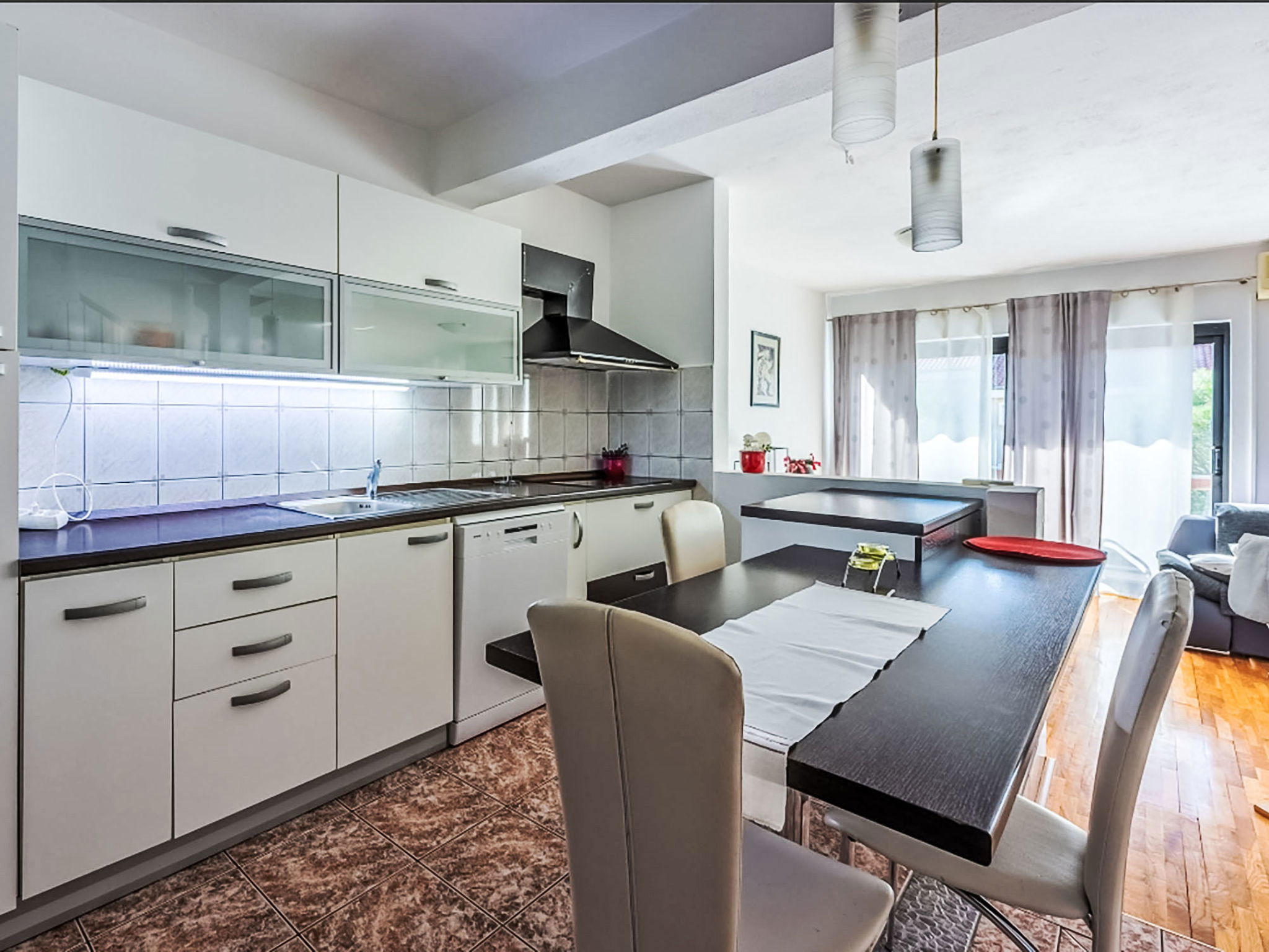 Novi Vinodolski: Immeuble "Deleut", de 3 étages. À 1 km du centre de Novi Vinodolski, à 1.8 km de la mer, à 1.8 km de la plage. En commun: terrain 400 m2 (clôturé). Terrasse (50 m2), barbecue, espace barbecue. Infrastructures de la Maison: accès internet, lave-linge. Place de parking près de la maison sur le terrain. Magasins, restaurant 800 m, arrêt de bus 1 km, plage de graviers 1.8 km. Veuillez noter: le propriétaire habite sur le même terrain.