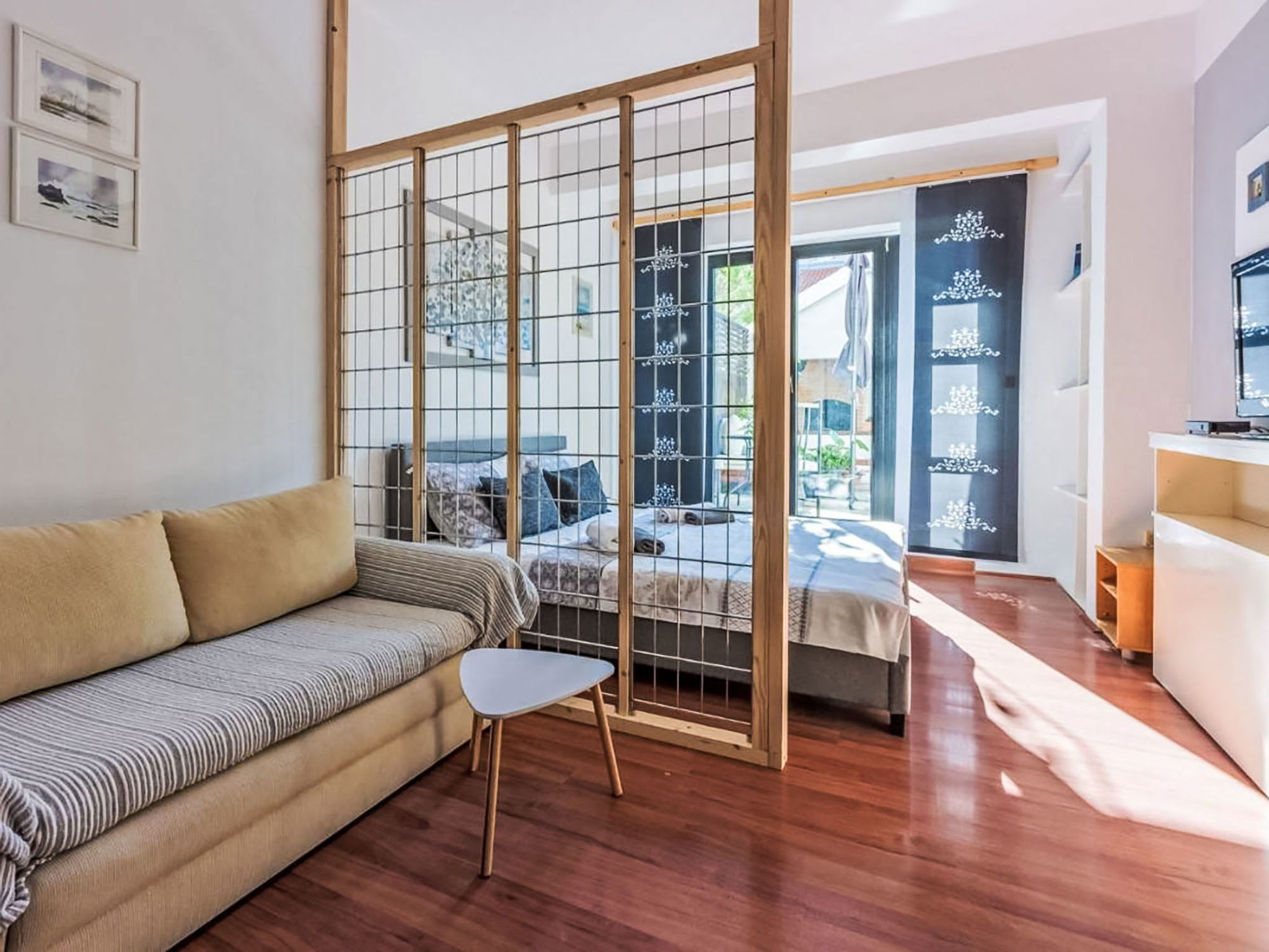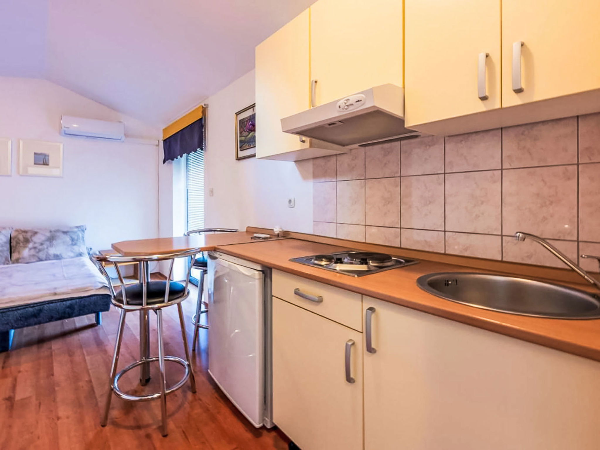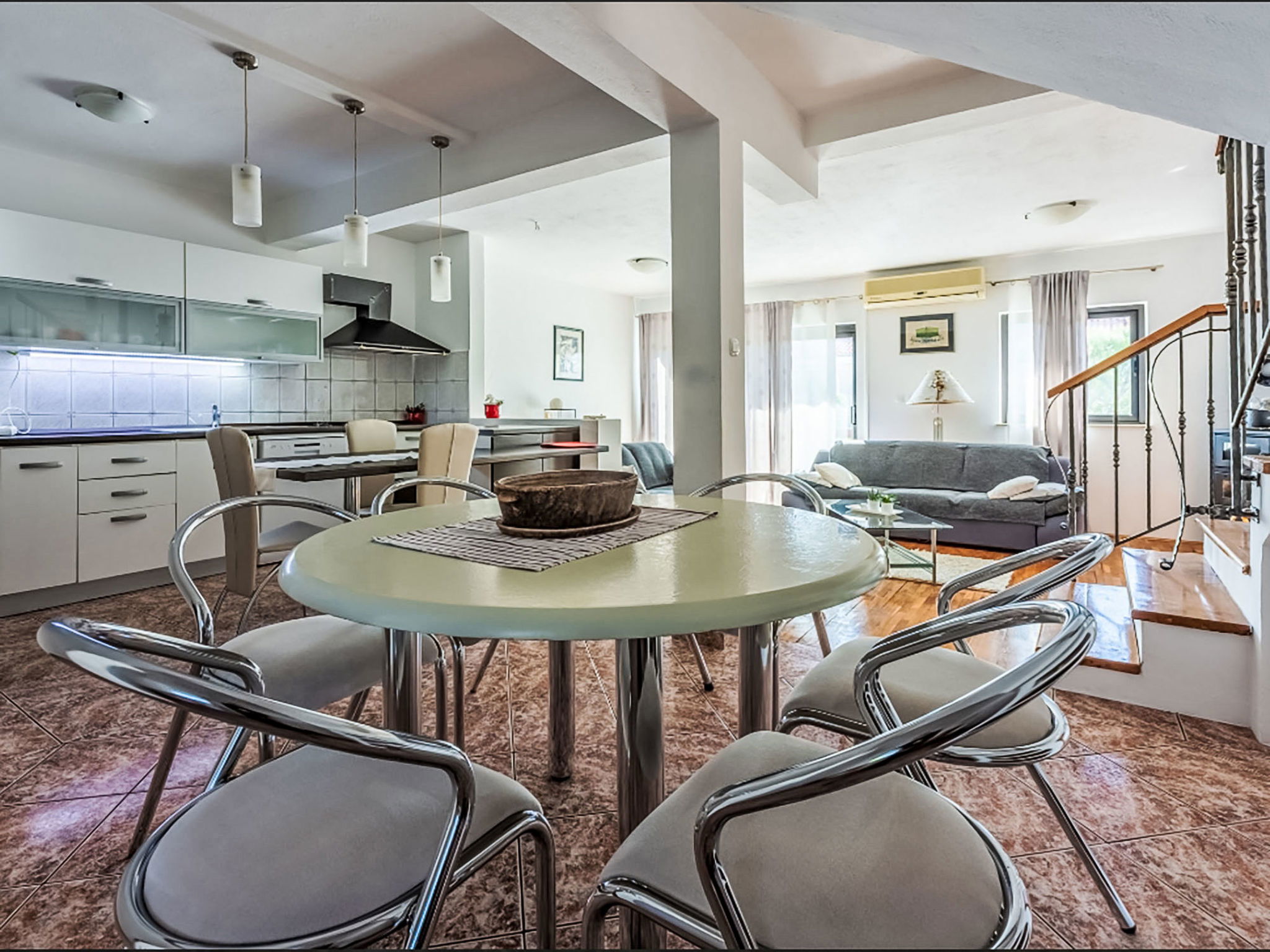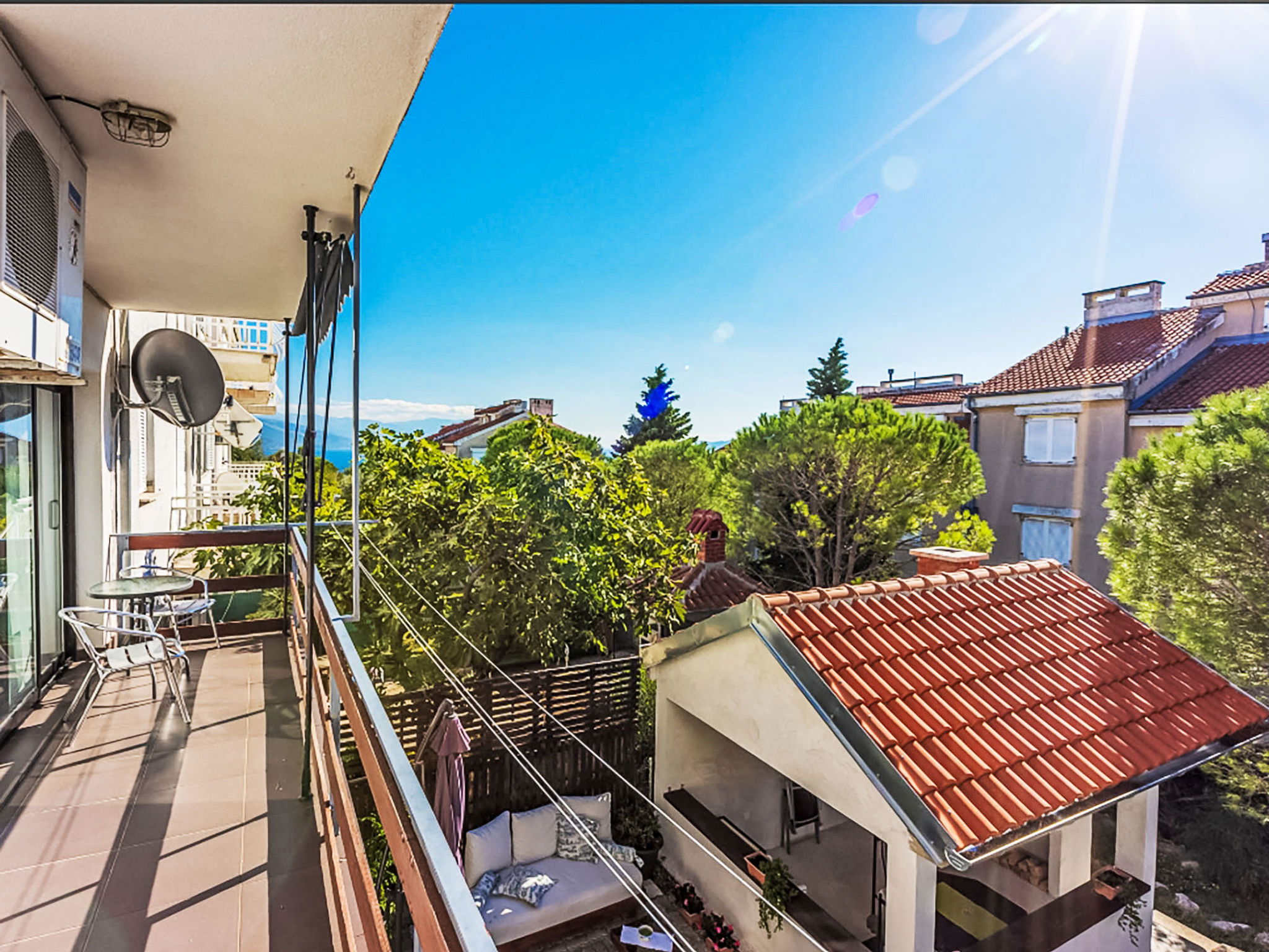 Maison 6 pièces 150 m2 sur 3 niveaux. Séjour/salle à manger avec cheminée, TV (satellite) et air-conditionné. Sortie sur le balcon. Cuisine ouverte (four, lave-vaisselle, 4 plaques à induction, grille-pain, bouilloire électrique, micro-ondes, congélateur, cafetière électrique). Douche/bidet/WC. À l'étage inférieur: 2 chambres, chaque chambre avec: 1 grand-lit (160 cm, longueur 200 cm), douche/WC, TV (satellite) et air-conditionné. Sortie sur la terrasse. À l'étage supérieur: 1 chambre avec 1 grand-lit (160 cm, longueur 200 cm), TV (satellite). Sortie sur le balcon. 1 chambre avec 1 grand-lit (160 cm, longueur 200 cm). 1 chambre avec 1 grand-lit (160 cm, longueur 200 cm), douche/WC, TV (satellite) et air-conditionné. Sortie sur le balcon. Bain/WC. Chauffage au bois, chauffage à air chaud. Balcon 14 m2, balcon 14 m2, terrasse 16 m2. Mobilier de balcon. A disposition: fer à repasser, lit bébé, sèche-cheveux, bois (gratuit). Internet (Connexion WIFI, gratuit). Maximum 2 animaux/ chiens autorisés.