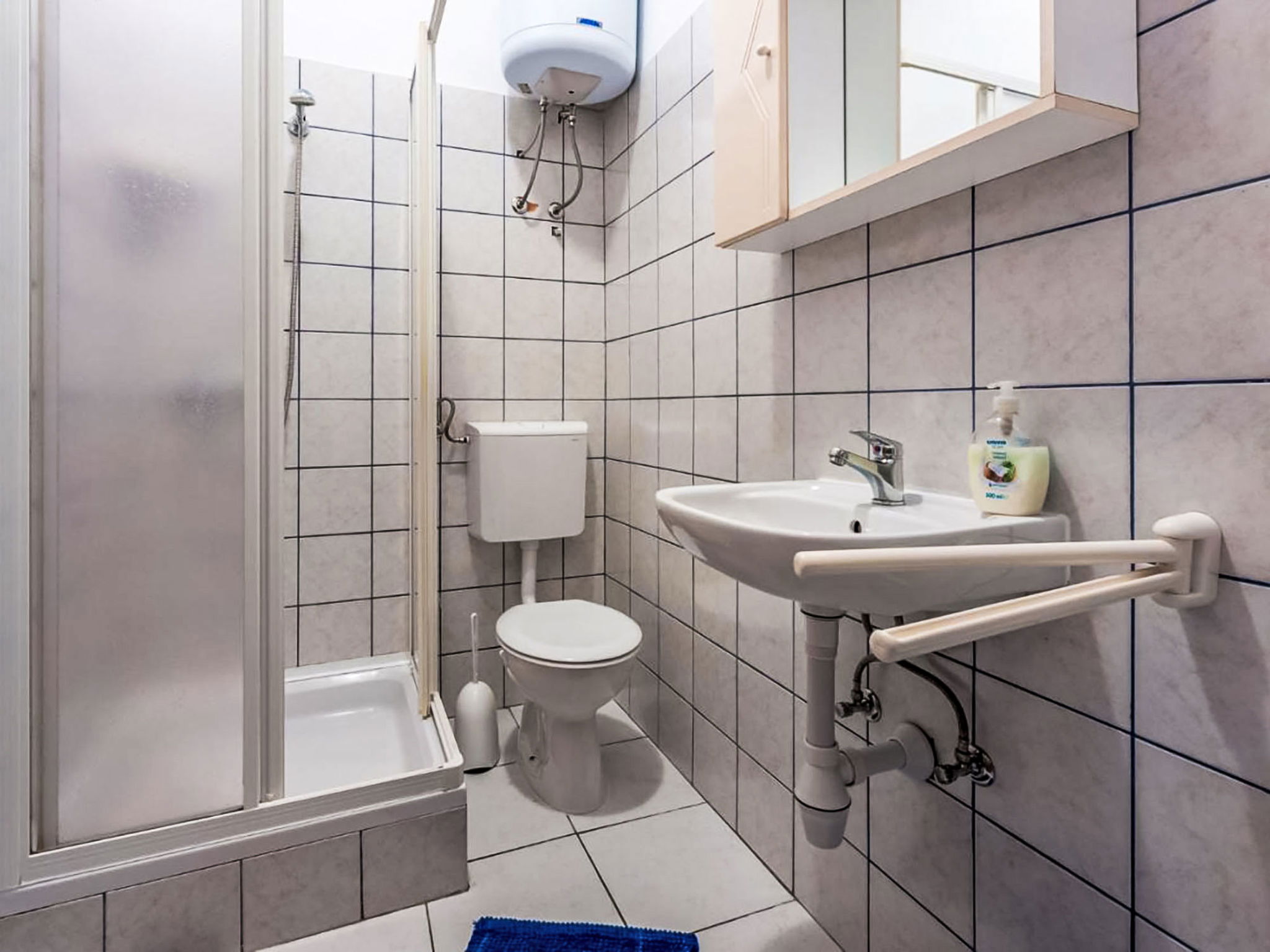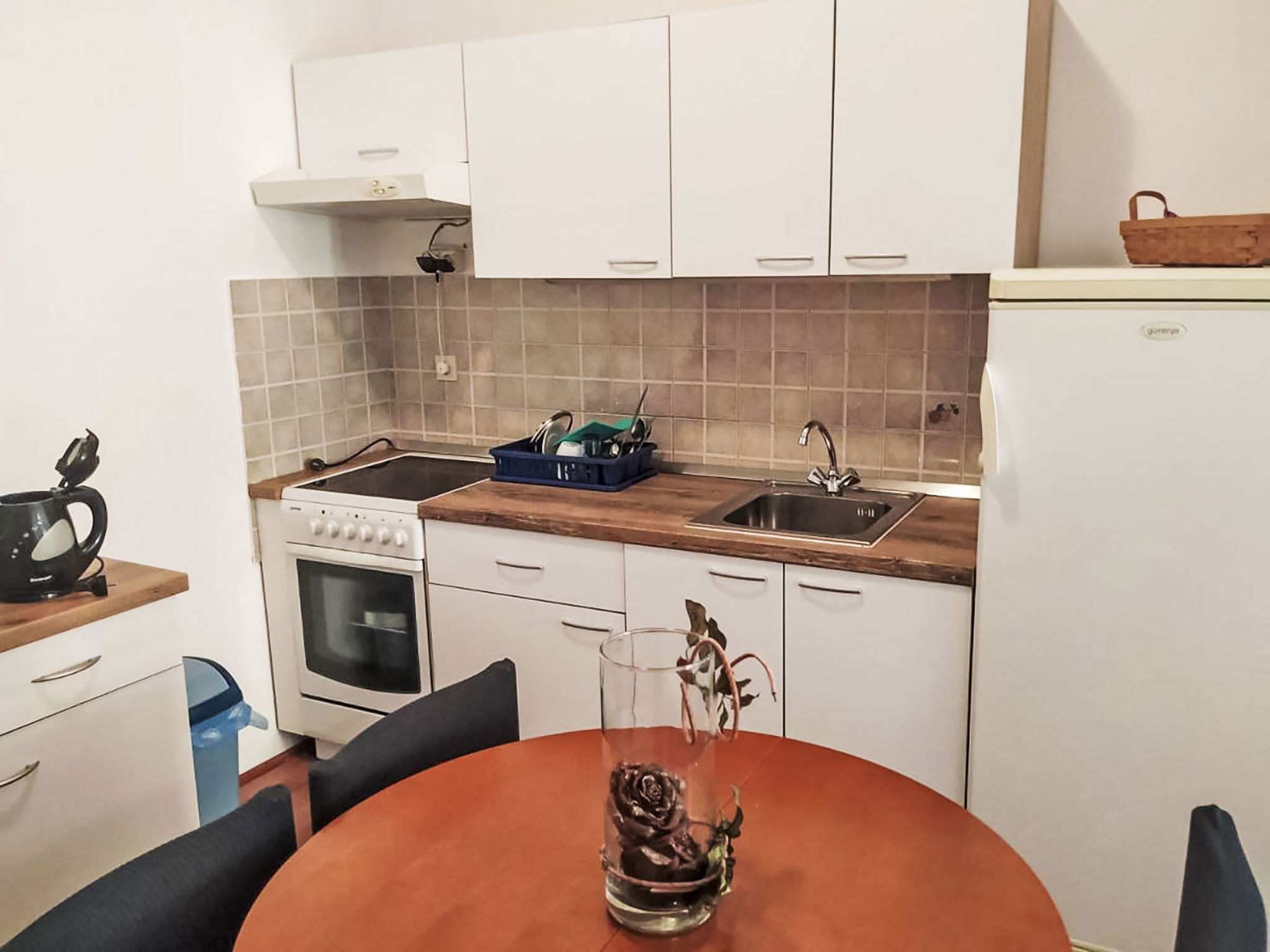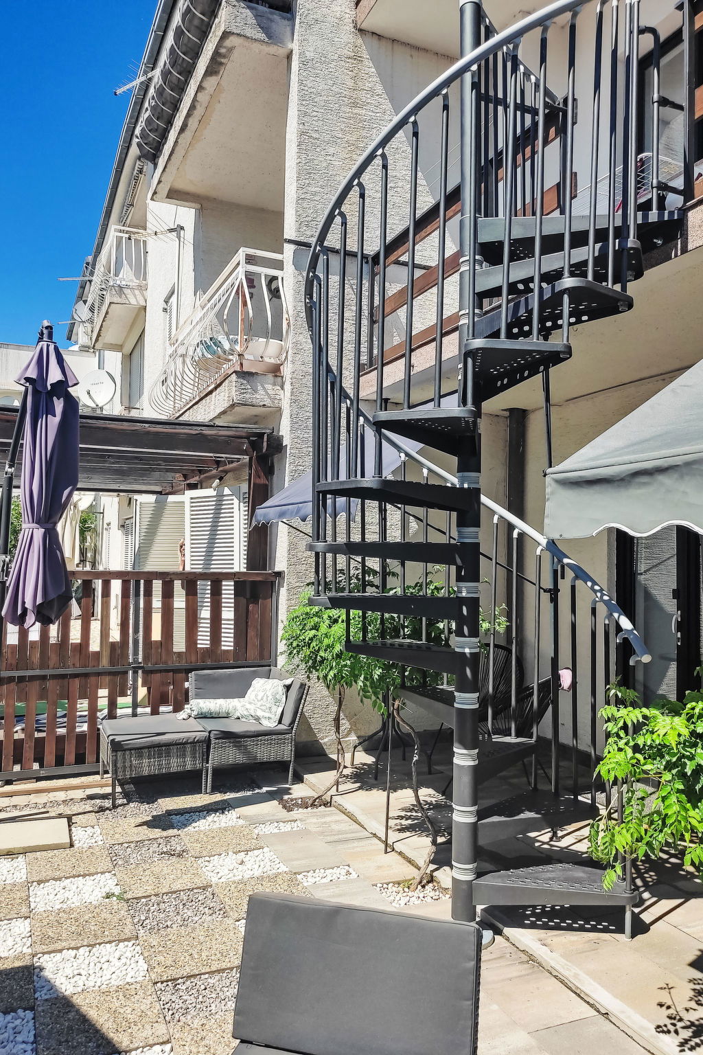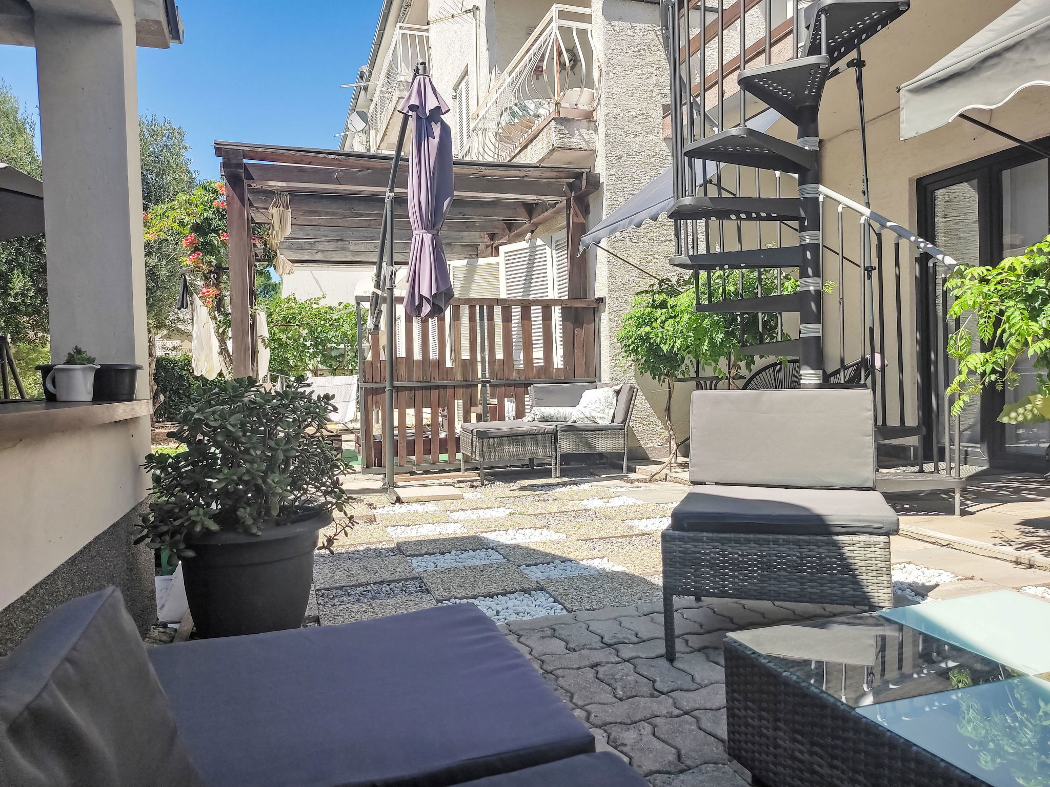 Novi Vinodolski: Immeuble "Deleut", de 3 étages. À 1 km du centre de Novi Vinodolski, à 1.8 km de la mer, à 1.8 km de la plage. A usage privé: terrain 400 m2 (clôturé). Pergola, terrasse (50 m2), barbecue, espace barbecue. Infrastructures de la Maison: accès internet, lave-linge. Place de parking près de la maison sur le terrain. Magasins, restaurant 800 m, arrêt de bus 1 km, plage de graviers 1.8 km. Veuillez noter: le propriétaire habite sur le même terrain.