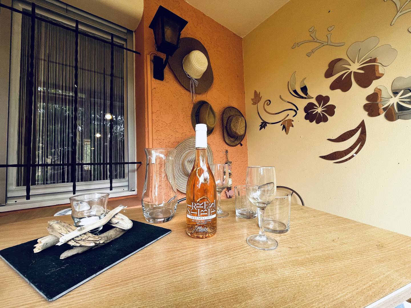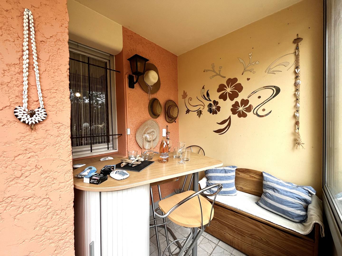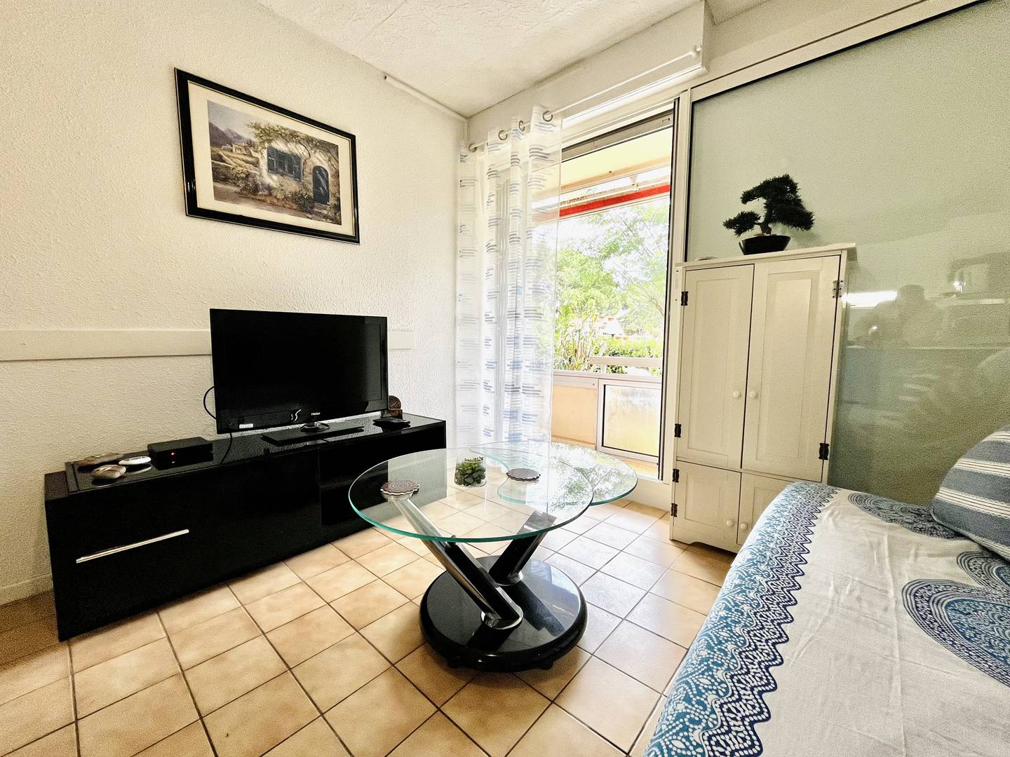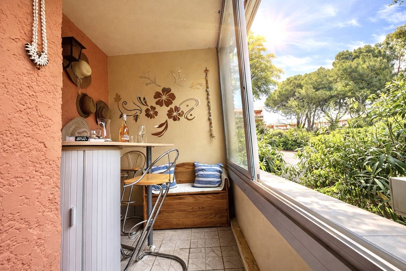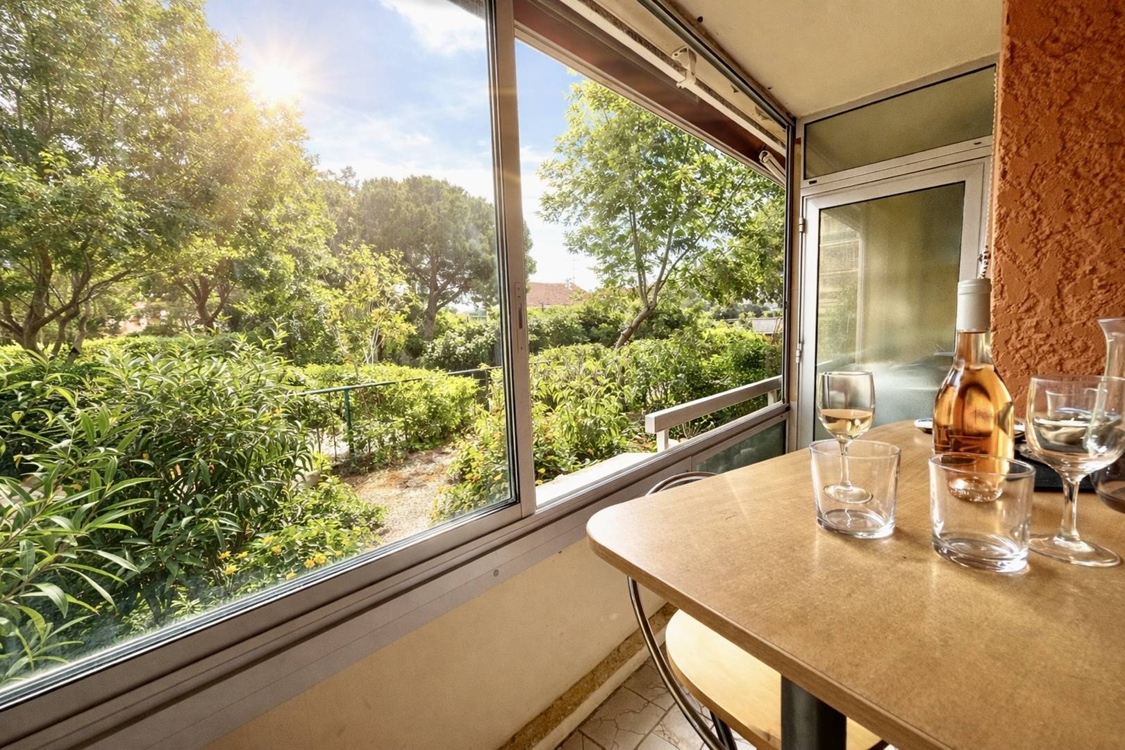 L’œil du professionnel : la véranda qui s'ouvre entièrement sur une jolie vue sur les jardins de la résidence, la verdure, un petit coin de paradis au calme mais non loin de l'effervescence de la vie estivale.