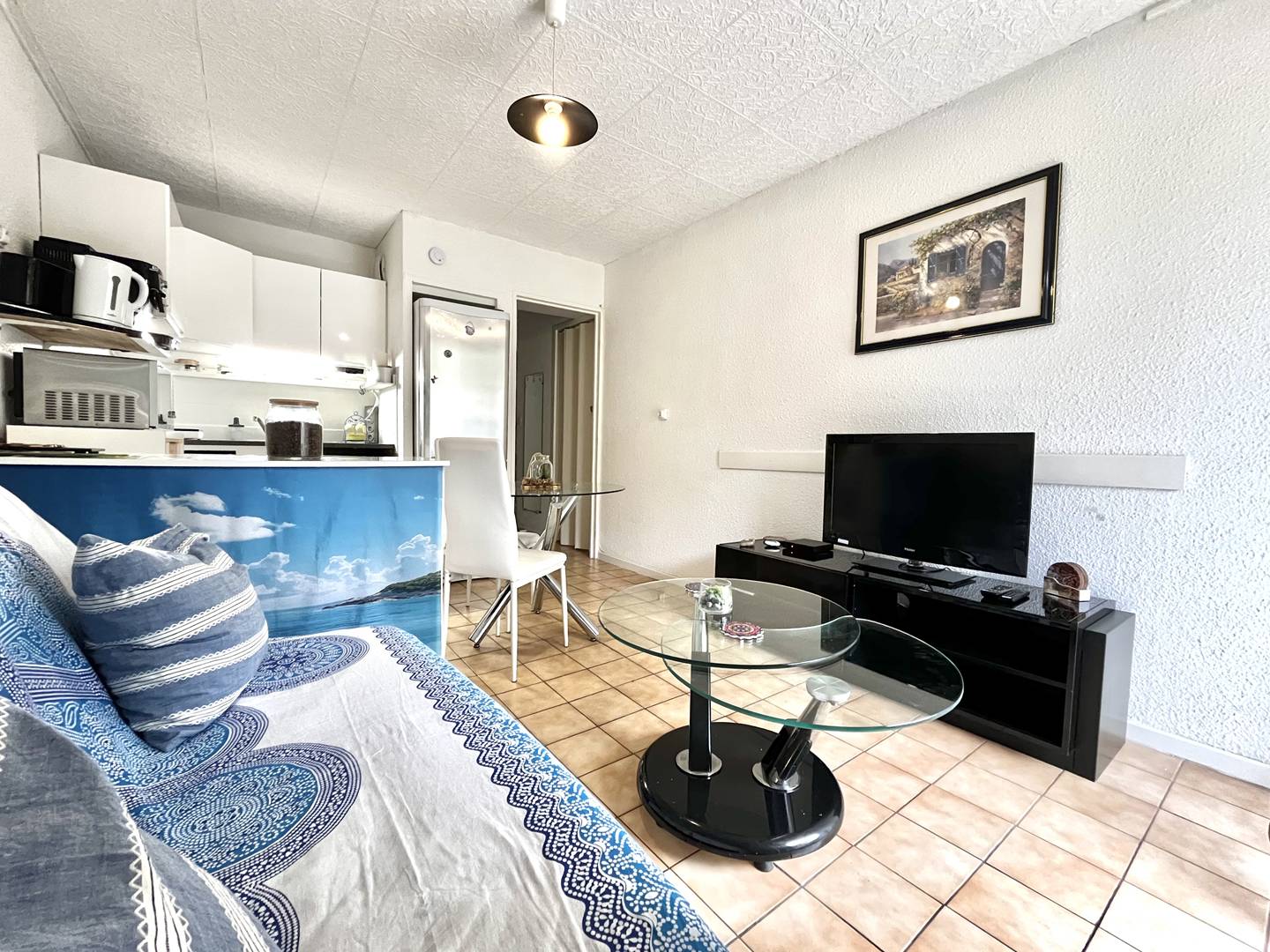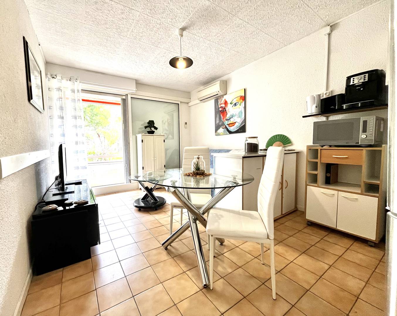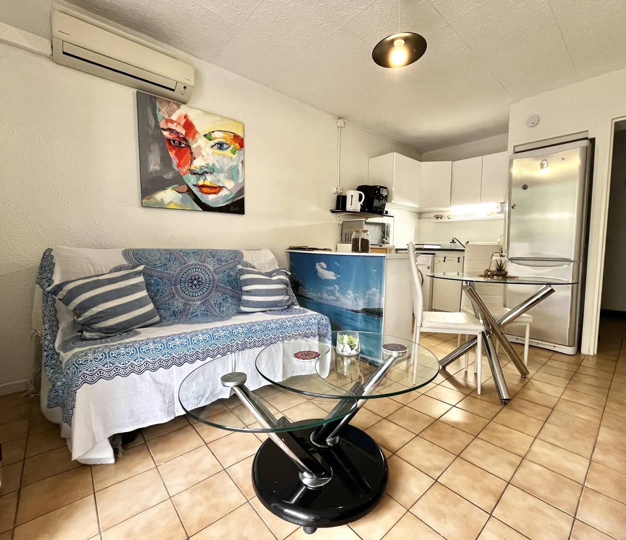 En rez d'immeuble, dans une résidence calme et sécurisé, nous vous proposons cet appartement climatisé disposant d'un séjour avec canapé fixe ouvrant sur une véranda orientée Est, pouvant s'ouvrir entièrement , un coin cuisine équipée ouvert sur le séjour, une chambre avec un lit en 140x190 et un coin nuit avec lits superposés 2x80/190 et enfin une salle d'eau avec wc. Entièrement rénové ce logement est classé 2 étoiles en catégorie des meublés de tourisme.