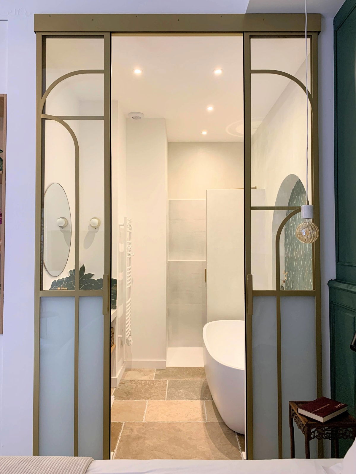 La Suite 3 dispose d'une chambre séparée du salon par une verrière atelier, équipée d'un lit Queen Size (160 x 200 cm) et d'une literie haut de gamme, ainsi que de rangements intégrés et d'un grand bureau équipé d'un écran.