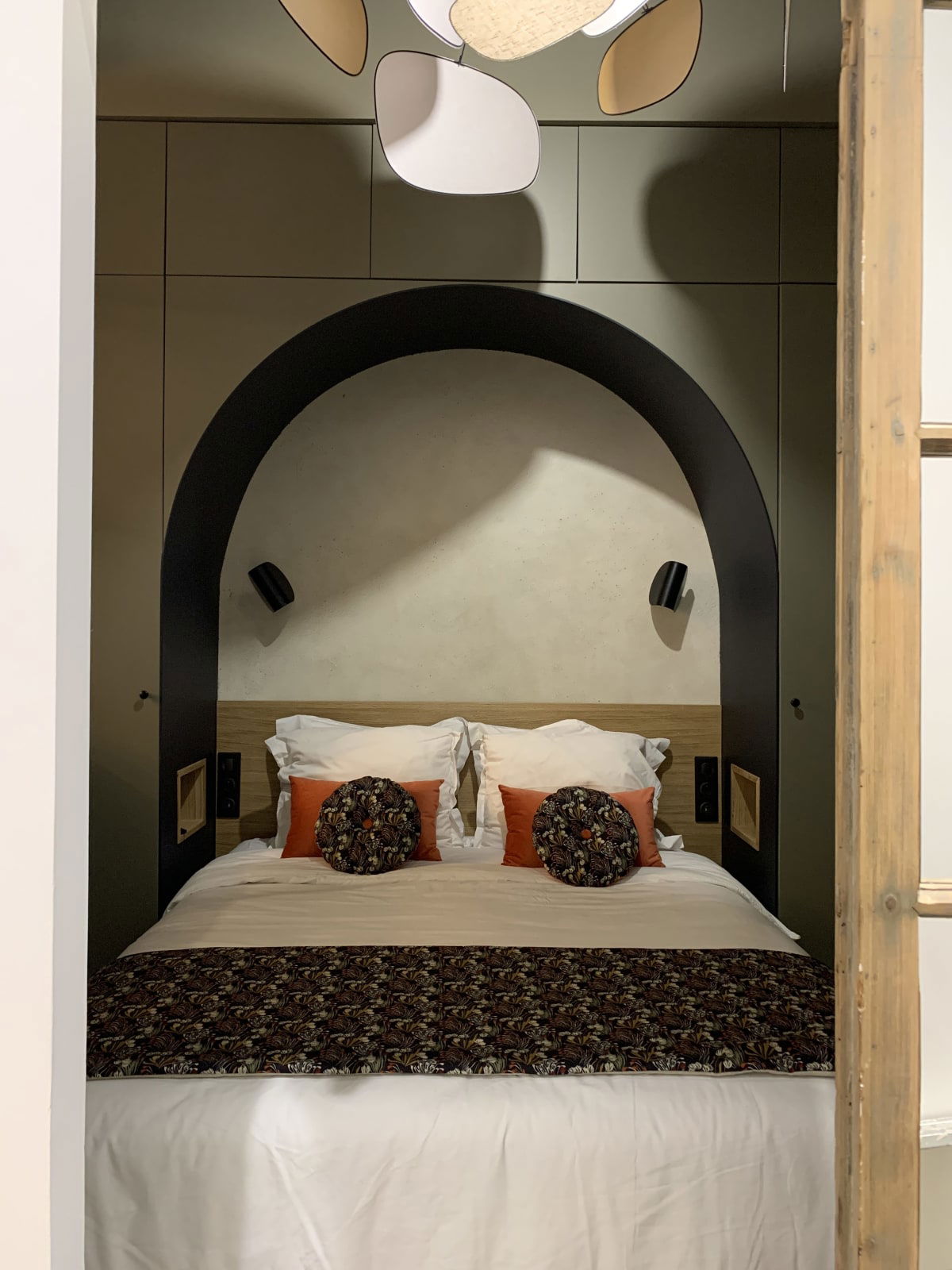La Suite 4 est un grand studio organisé de façon fluide, avec une zone nuit équipée d'un lit Queen Size (160 x 200 cm) et d'une literie haut de gamme, un coin salon avec canapé, un espace repas et un coin bureau discret.