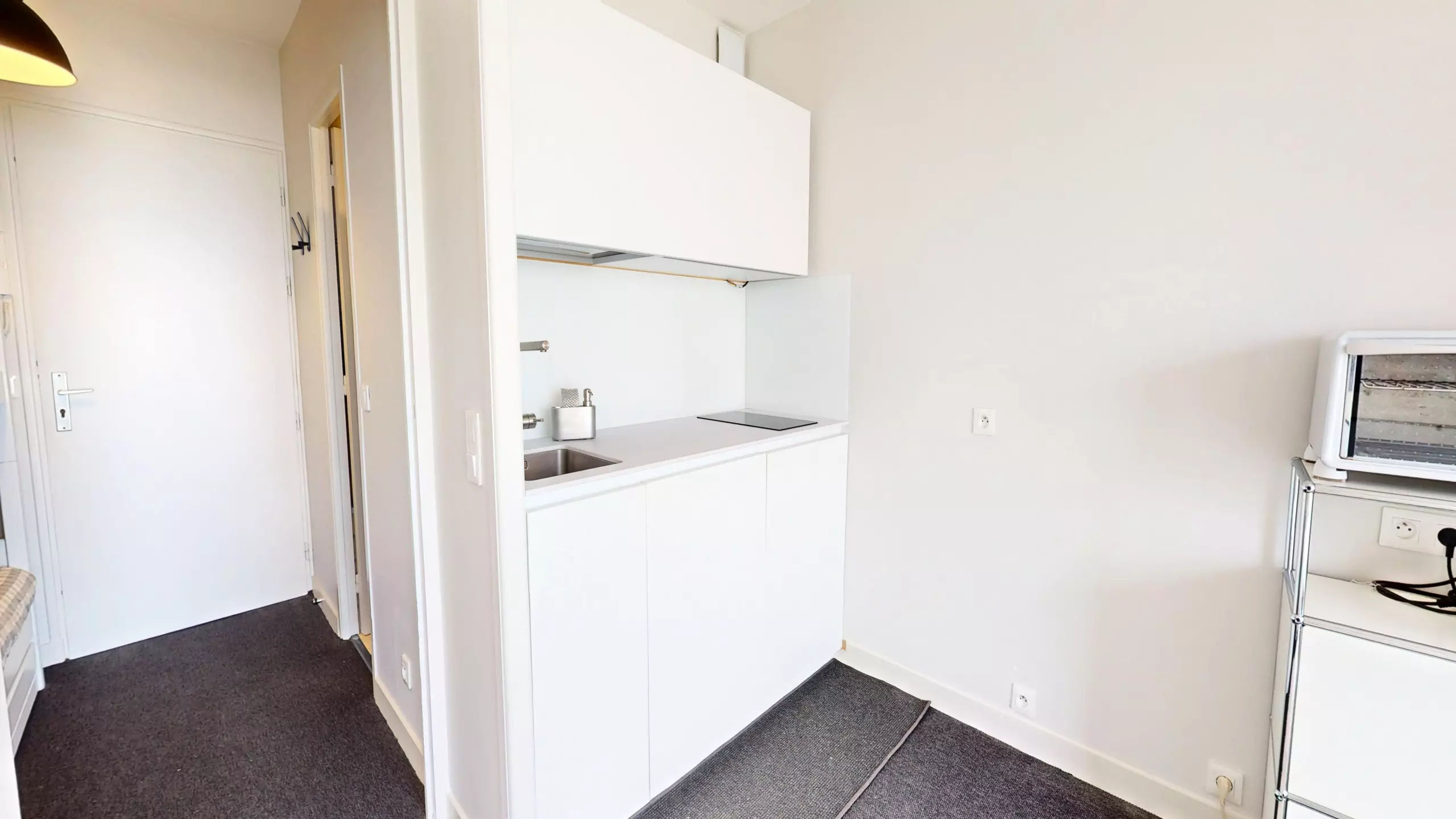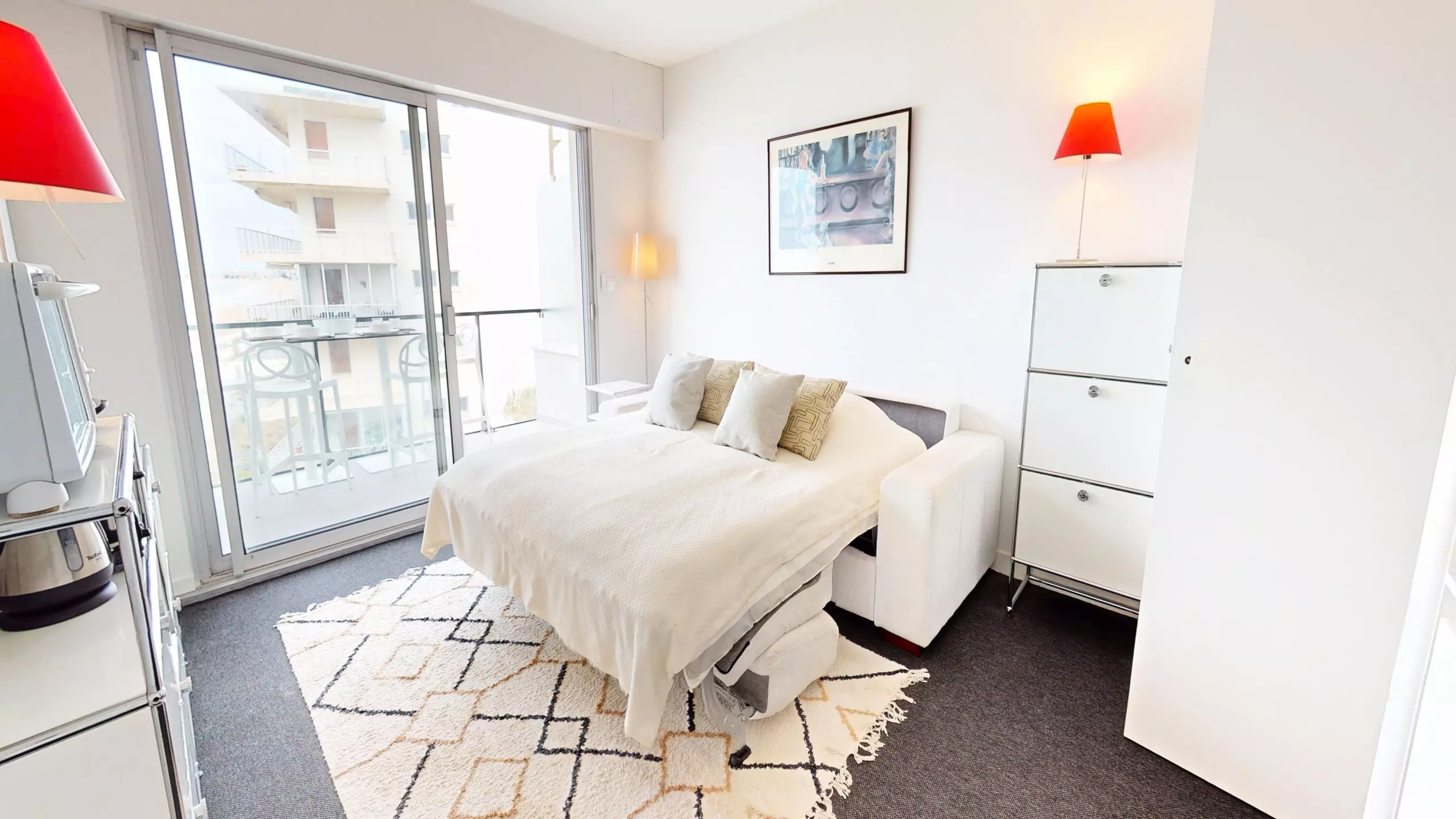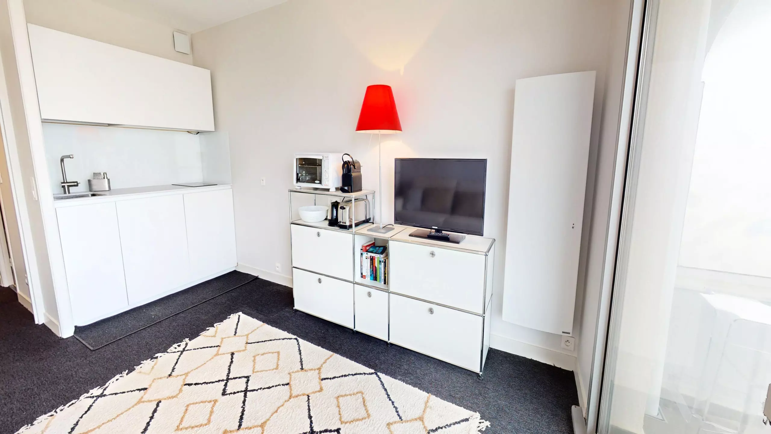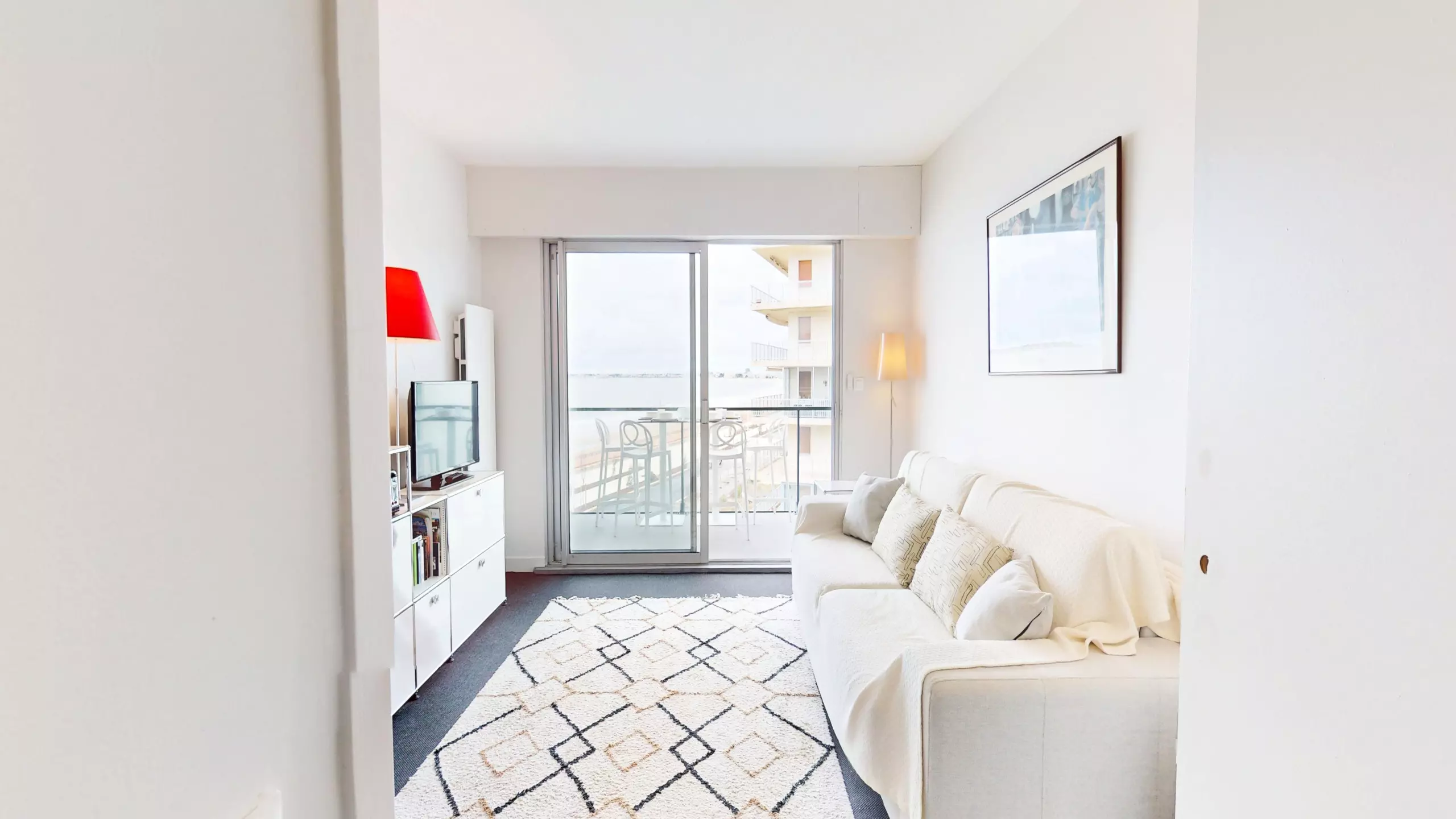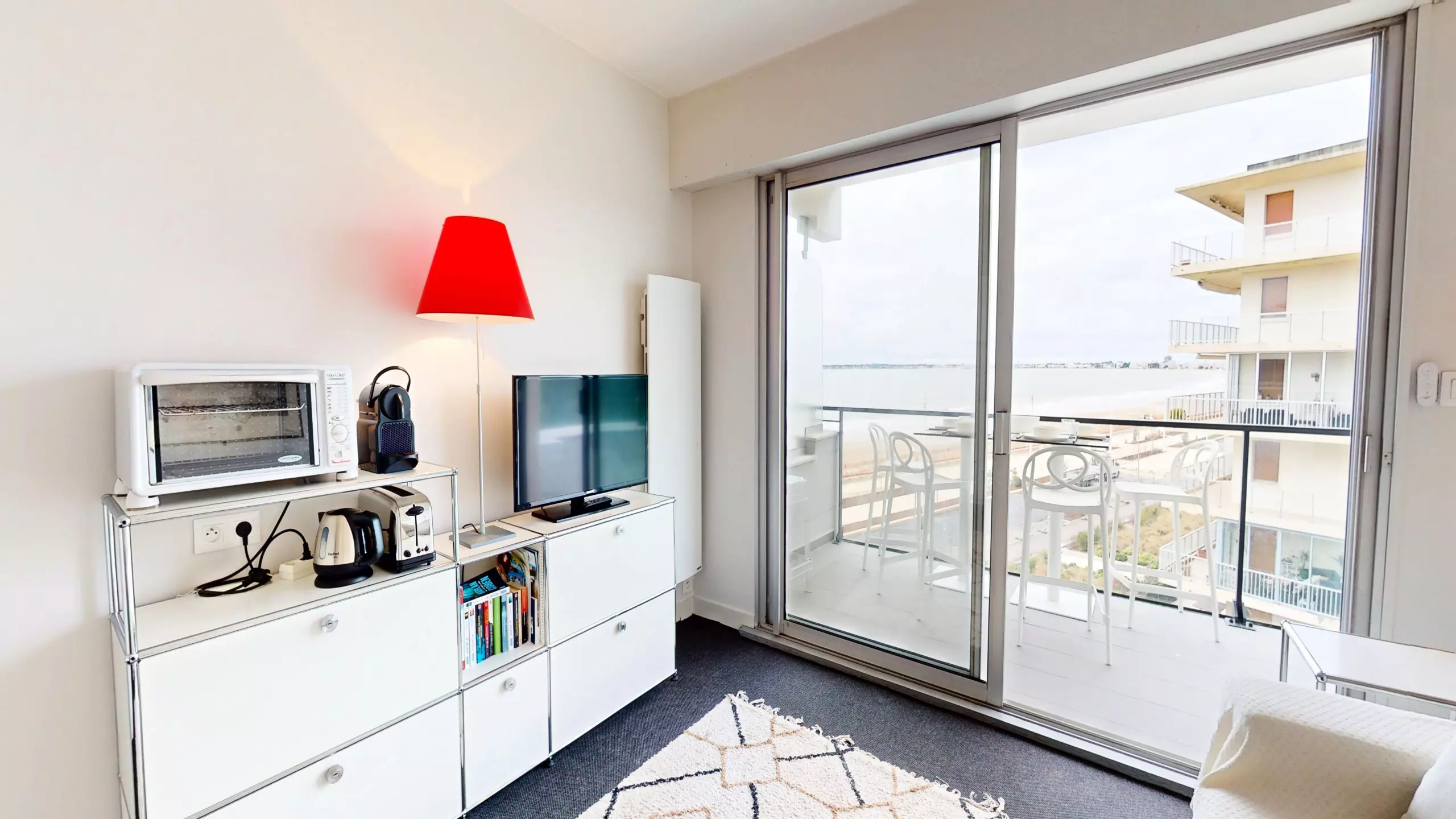 En avançant vers la pièce de vie, vous êtes immédiatement frappé par la clarté exceptionnelle du lieu. Avant même d’atteindre le balcon, la mer s’invite déjà dans votre regard. Le salon cosy dispose d'une télévision et d'un canapé-lit double (140x190), vous permettant de vous réveiller chaque matin face au bleu de l'horizon. Juste derrière, la cuisine moderne et entièrement ouverte est équipée de tout le nécessaire pour cuisiner en toute convivialité.