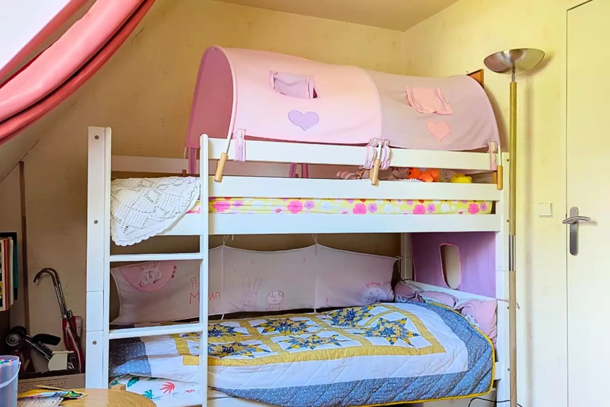 Côté nuit, la chambre principale dispose d’un lit double de 140x190, offrant un espace confortable pour se reposer. Une seconde chambre est équipée d’un lit superposé composé de deux lits simples de 90x190, idéal pour les enfants ou les amis.