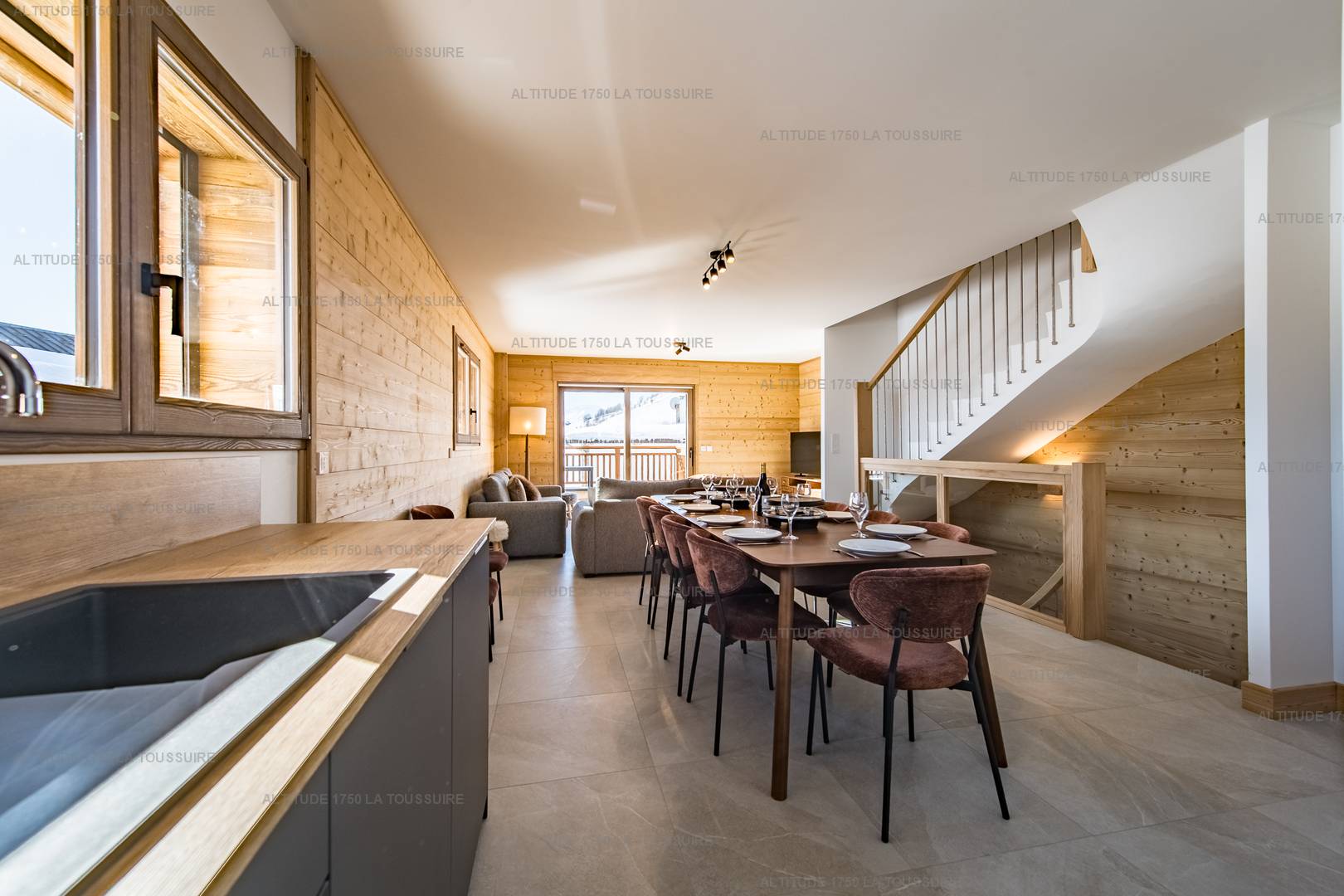 A l'étage, vous retrouverez une grande pièce de vie ouvrant sur une terrasse et sur l'époustouflante vue des Aiguilles d'Arves. La pièce de vie propose un coin salon, une salle à manger et une cuisine équipée. La cuisine est équipée de tout le confort nécessaire (lave vaisselle, plaque à induction, four, four micro-onde,...) tandis que le salon propose un espace TV.