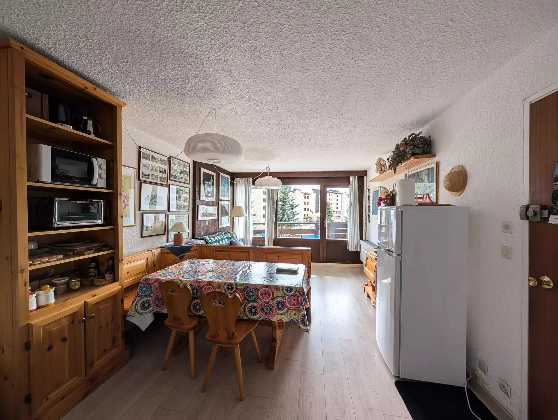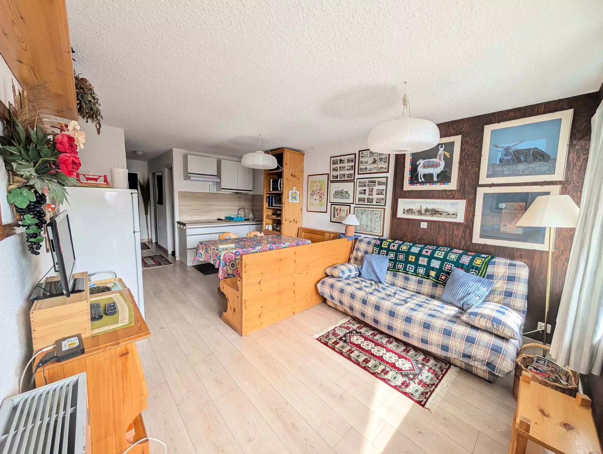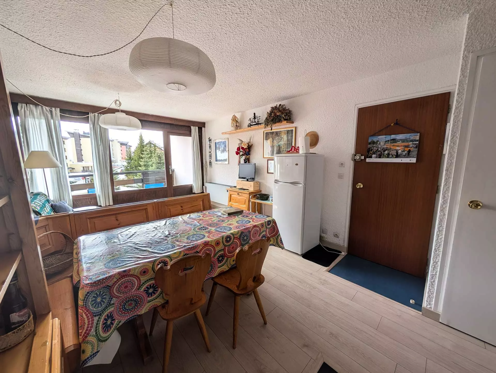 Séjour : TV, canapé, table basse, accès au balcon avec baie votrée et vue sur le Janus. Coin repas avec table et chaises pour 6 pers.