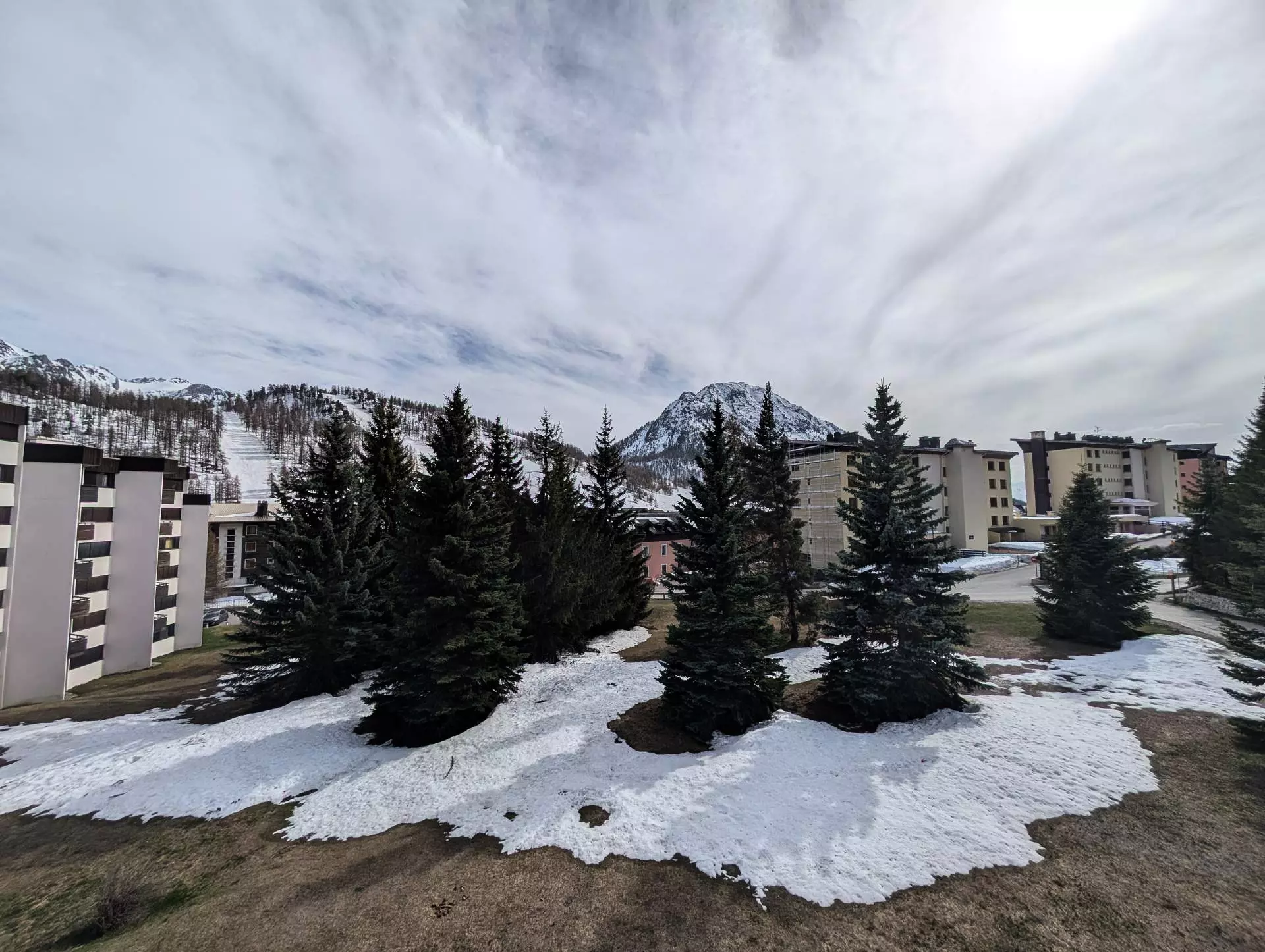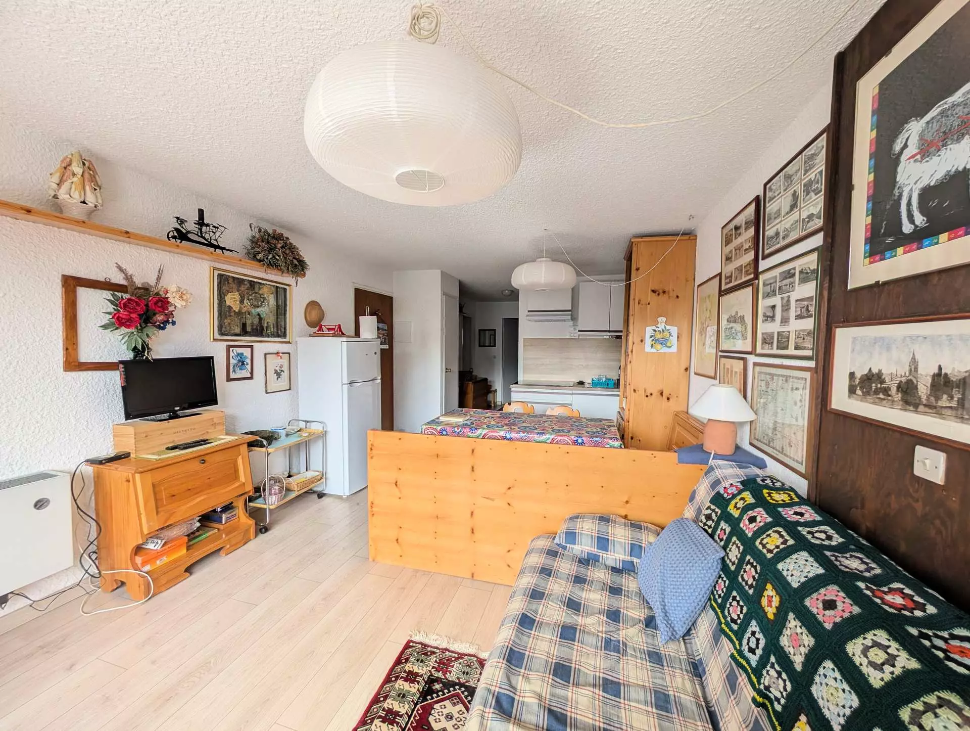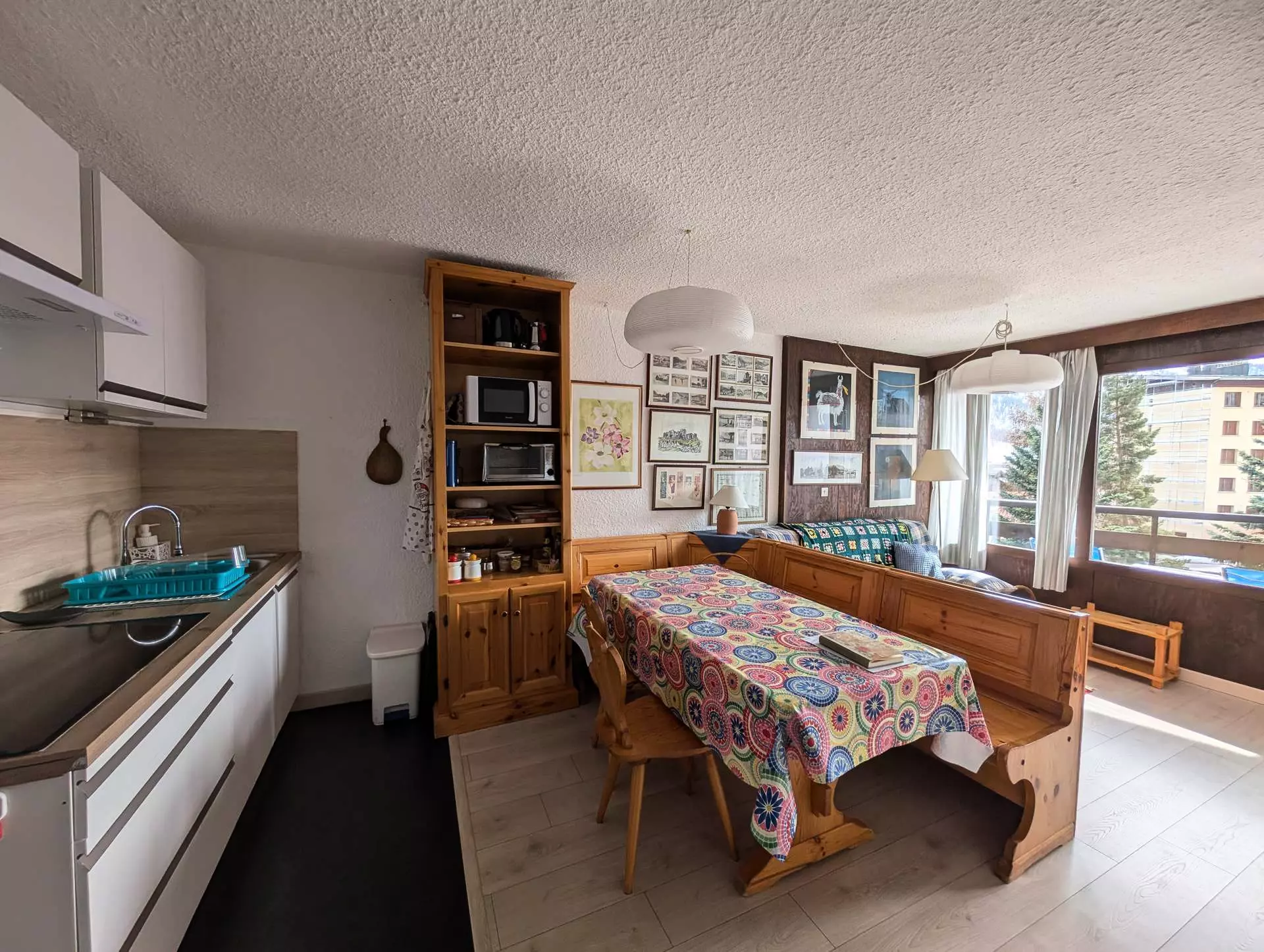 Séjour : TV, canapé, table basse, accès au balcon avec baie votrée et vue sur le Janus. Coin repas avec table et chaises pour 6 pers.