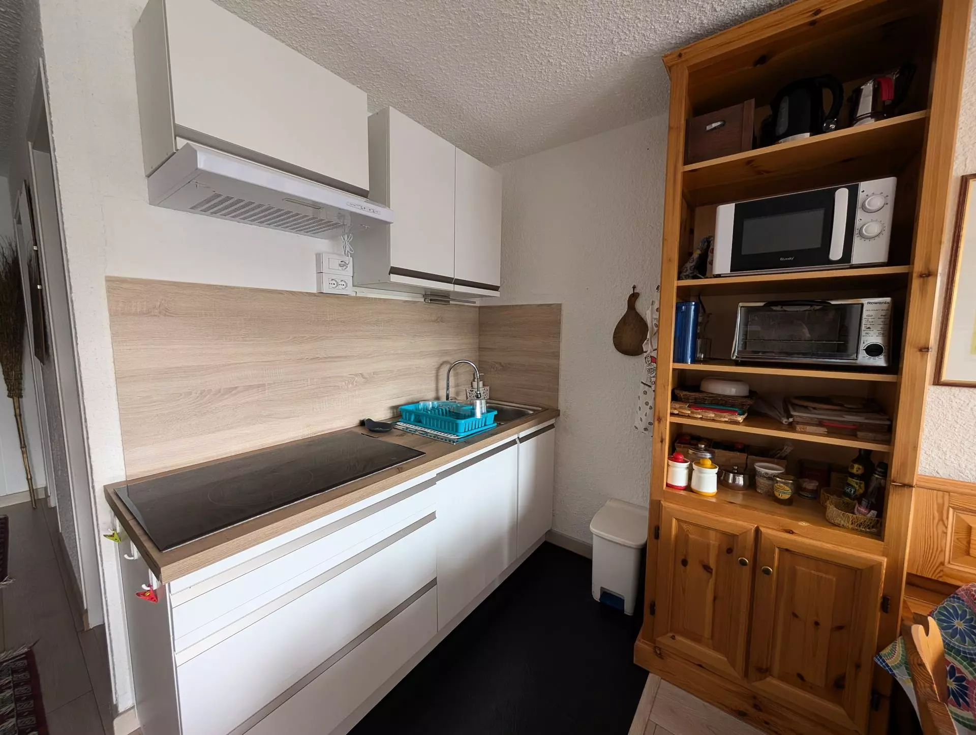 Coin cuisine : 4 plaques électriques, lave-vaisselle, petit four, micro-ondes, réfrigérateur avec compartiment congélateur, cafetière, grille-pain, bouilloire.