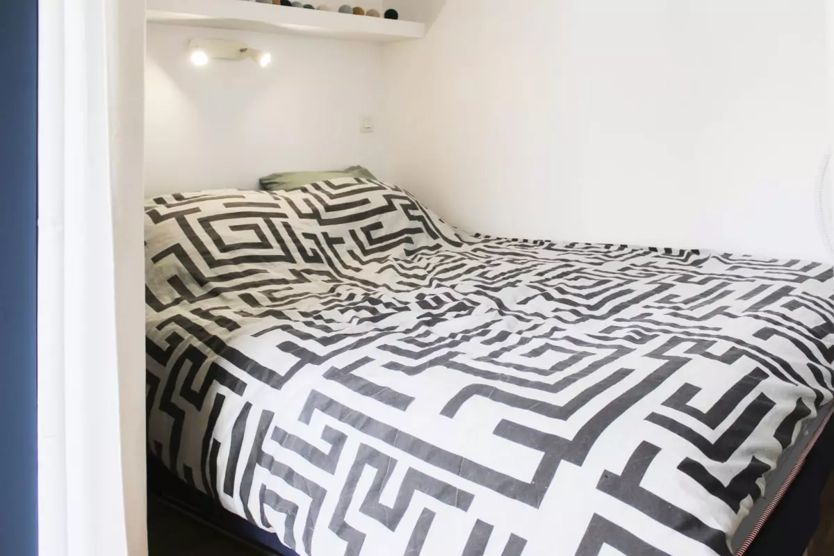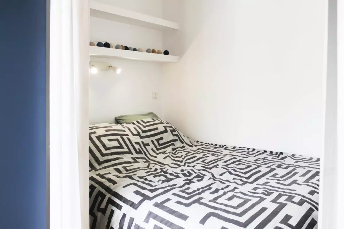 Côté repos, vous disposerez d'un espace nuit élégamment séparé du reste de la pièce par un rideau, garantissant votre intimité. Vous y trouverez un lit double (160*200) doté d'une literie très confortable, sélectionnée pour vous offrir des nuits des plus reposantes.