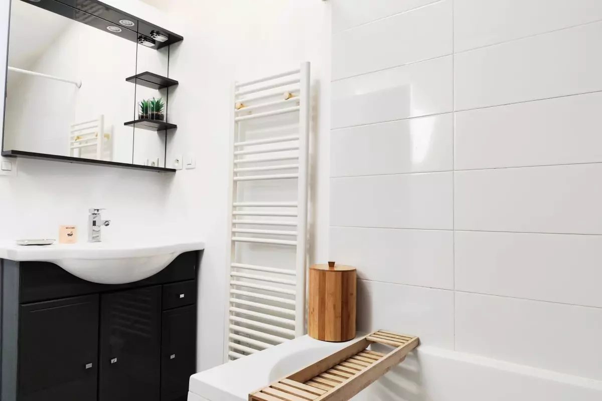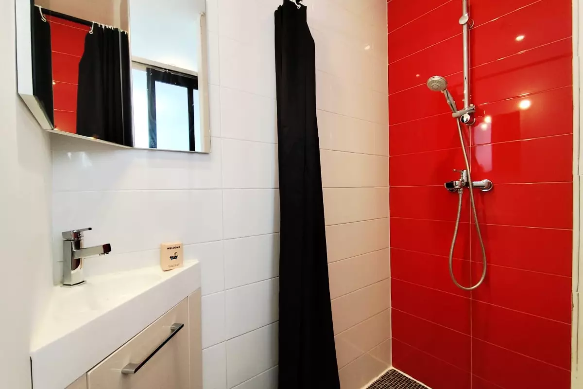 Pour cette surface, l’appartement dispose de deux salles d’eau – une douche au rez-de-chaussée et une baignoire à l’étage – idéal pour les séjours en groupe ou en famille.