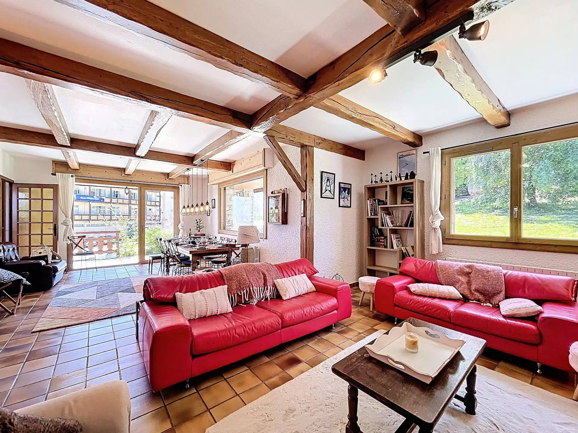 Séjour cosy et baigné de lumière avec TV, prolongé par une salle à manger conviviale, ouvrant sur une terrasse plein sud, promesse de moments suspendus face aux montagnes.