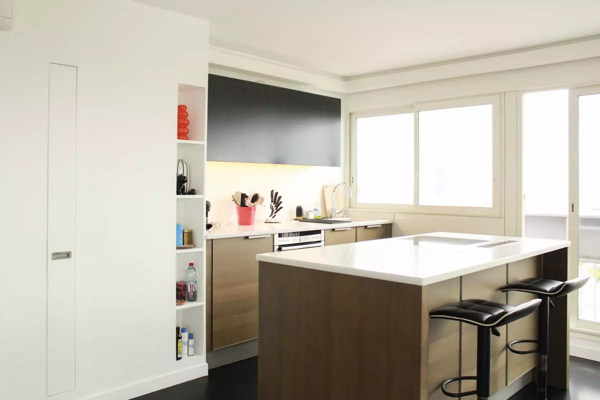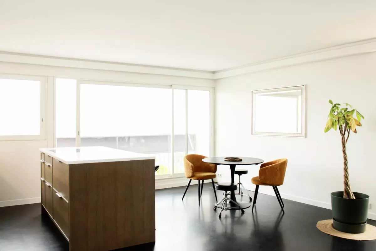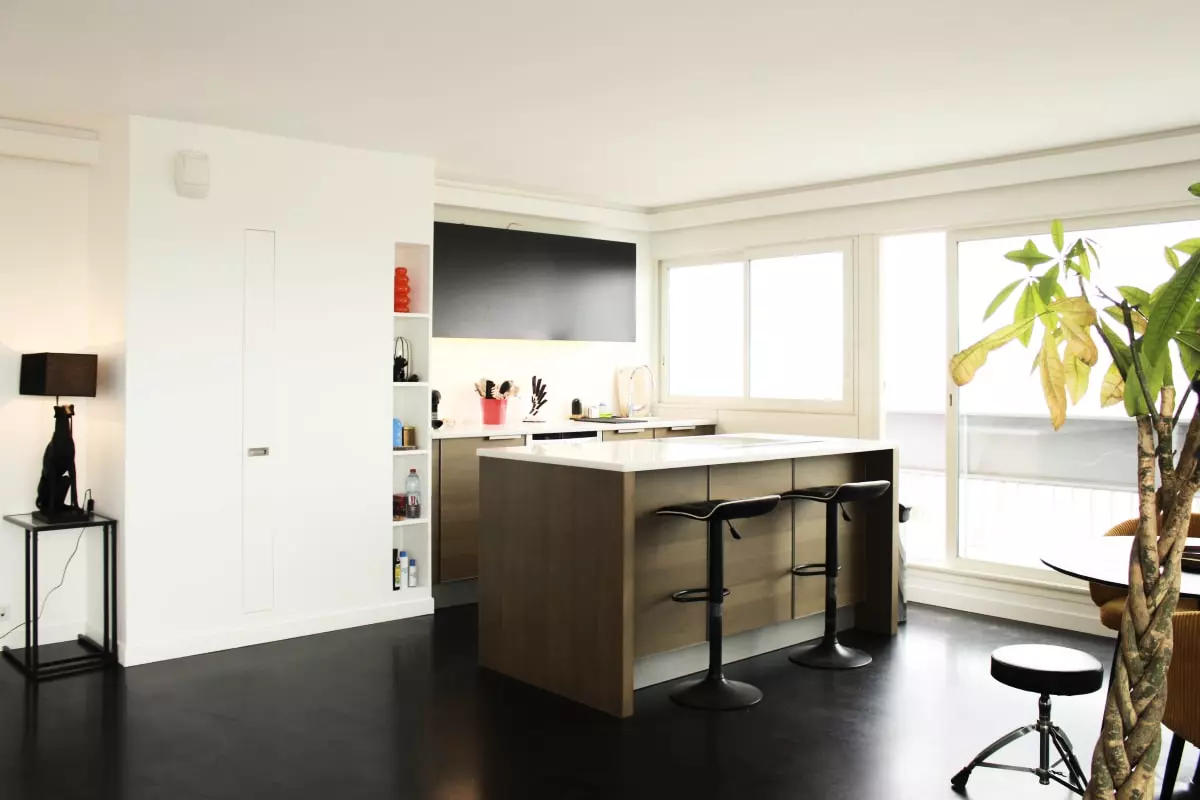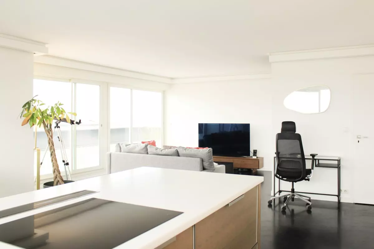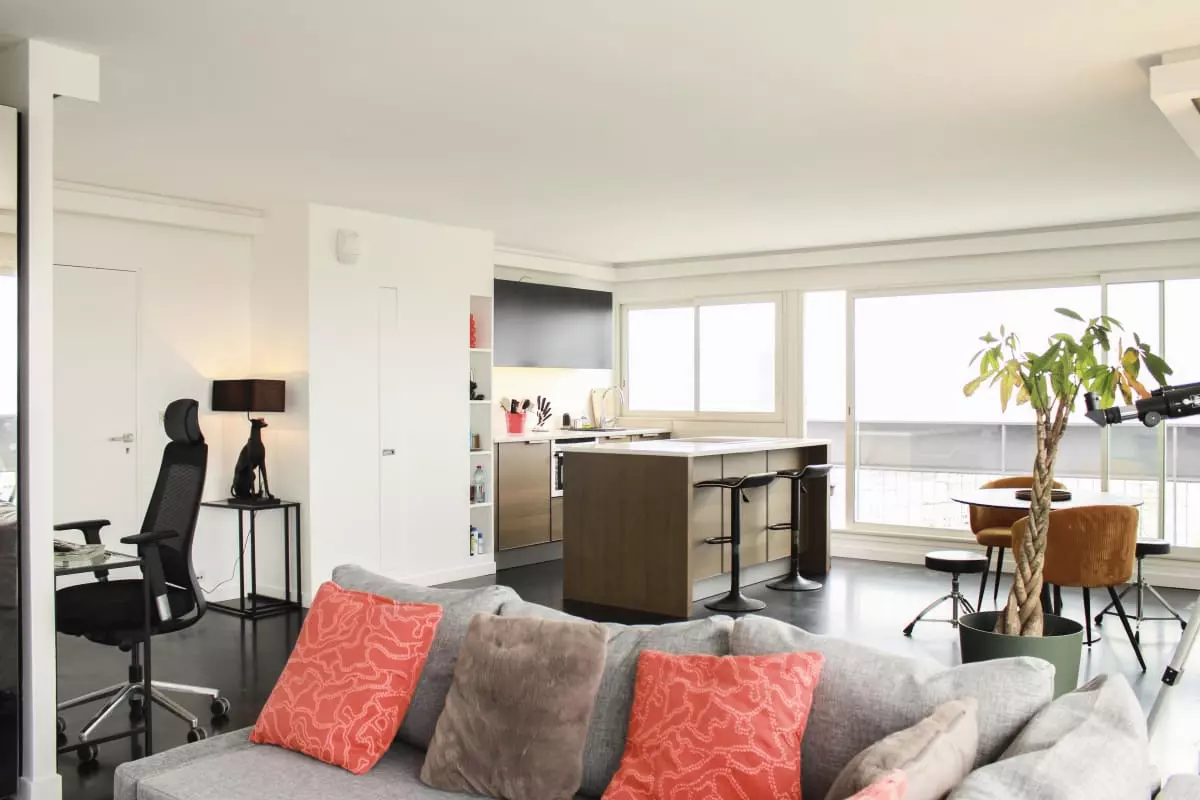 L'immense salon, avec sa cuisine ouverte, sa vue panoramique sur Paris et ses 2 balcons offrent un cadre unique et intime en plein Paris.