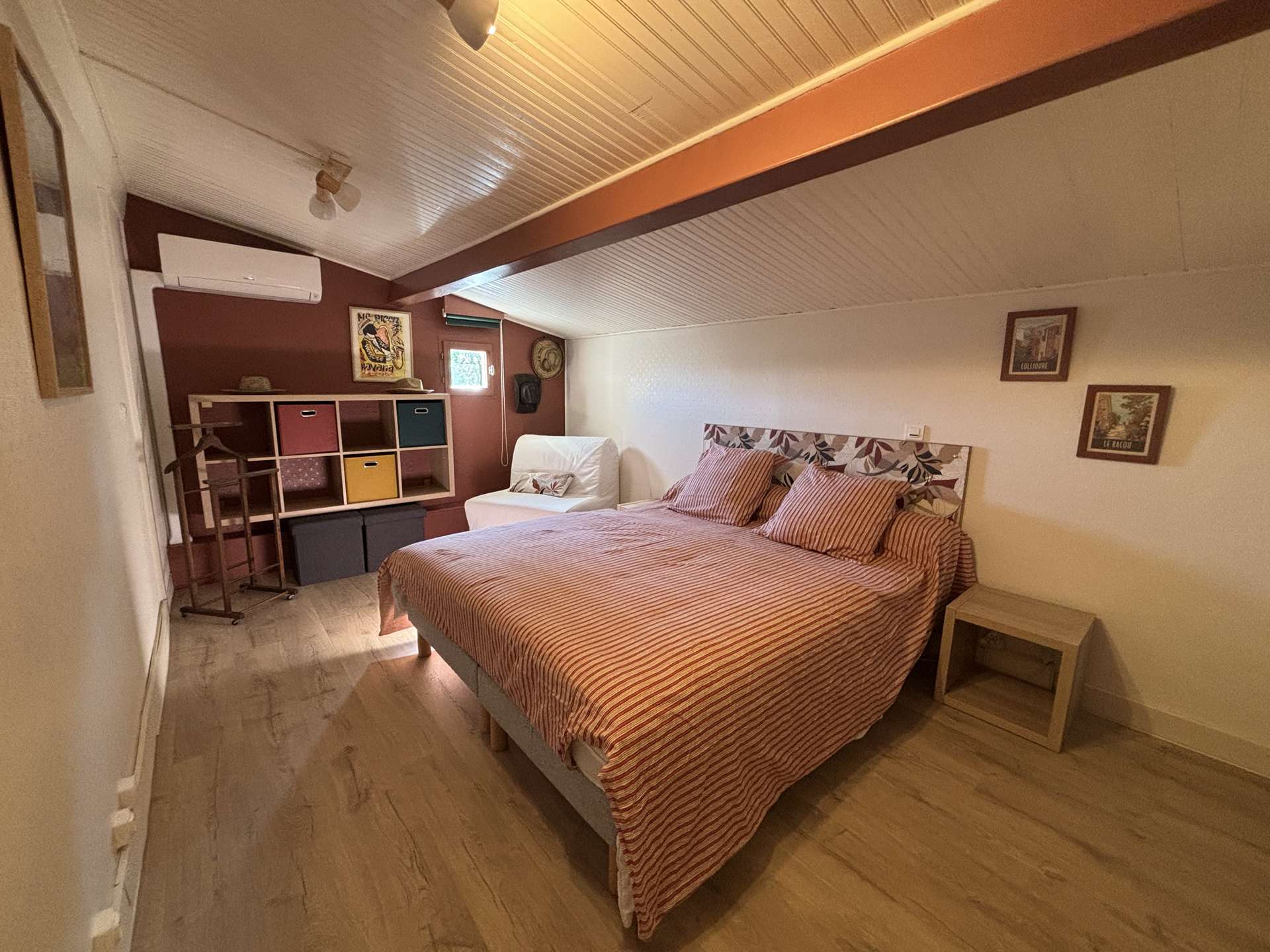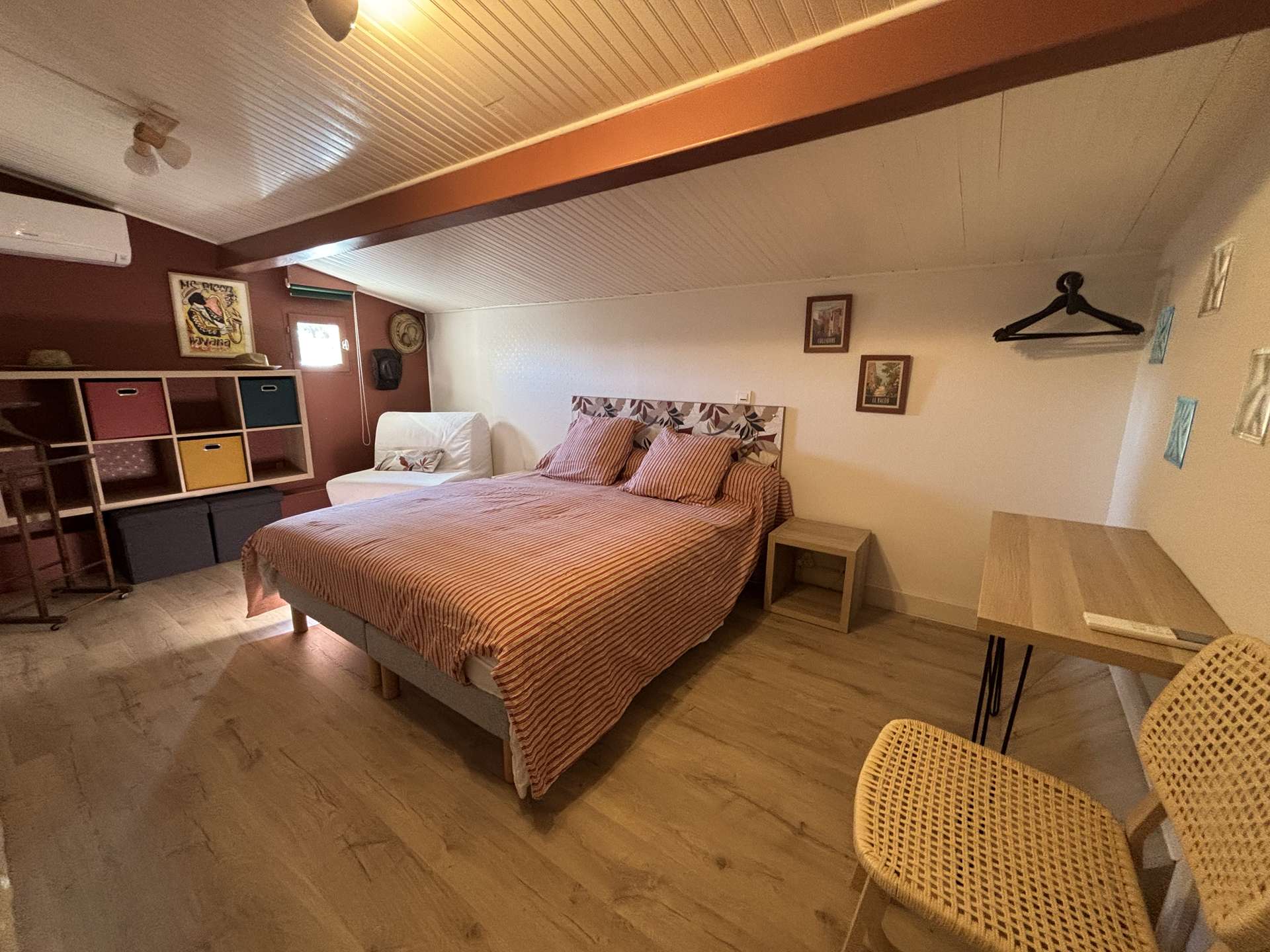 À l’étage, l’espace nuit se compose de deux chambres avec lits doubles et 2 chauffeuses, ainsi que d’une salle de bains avec WC.