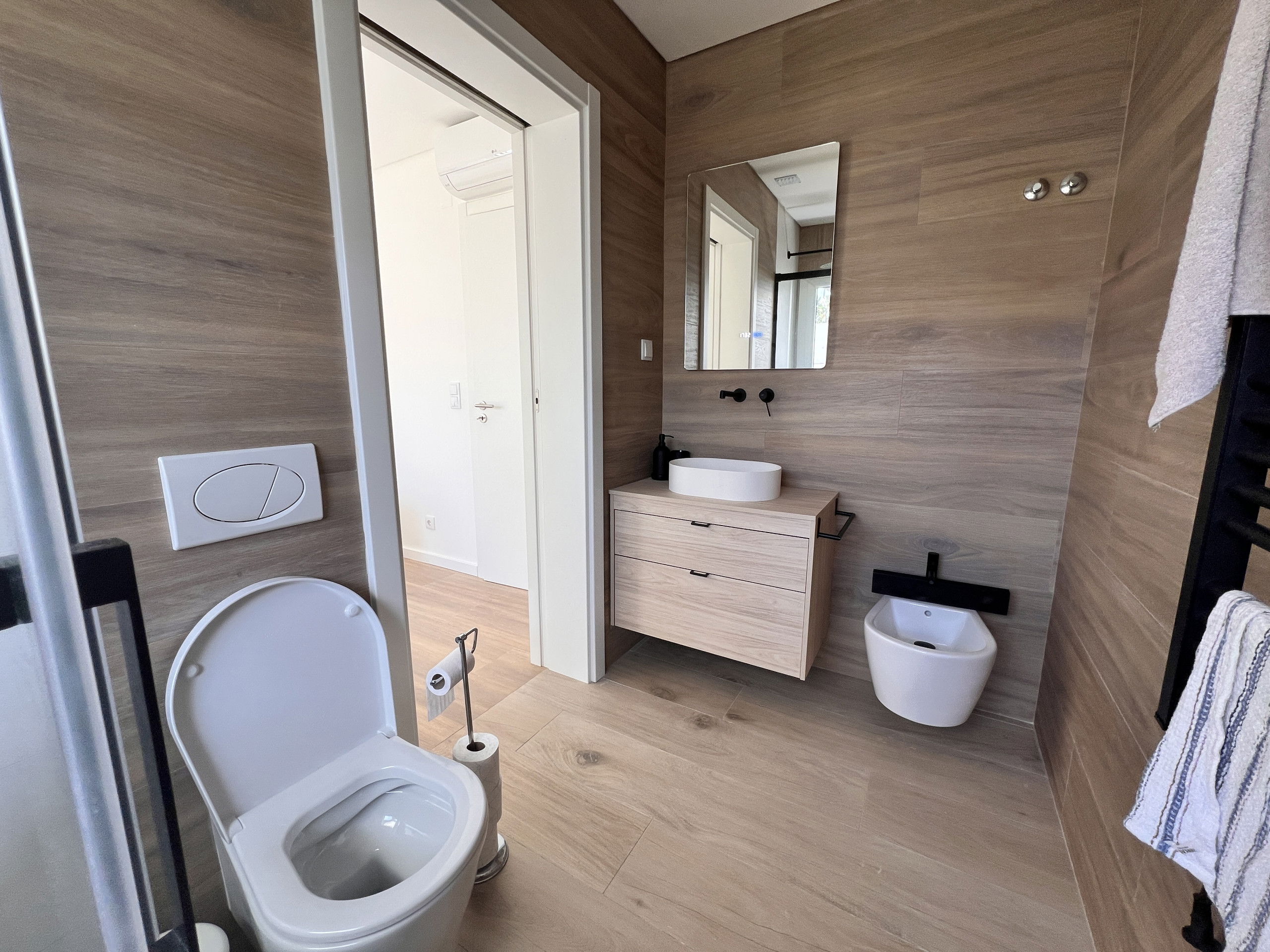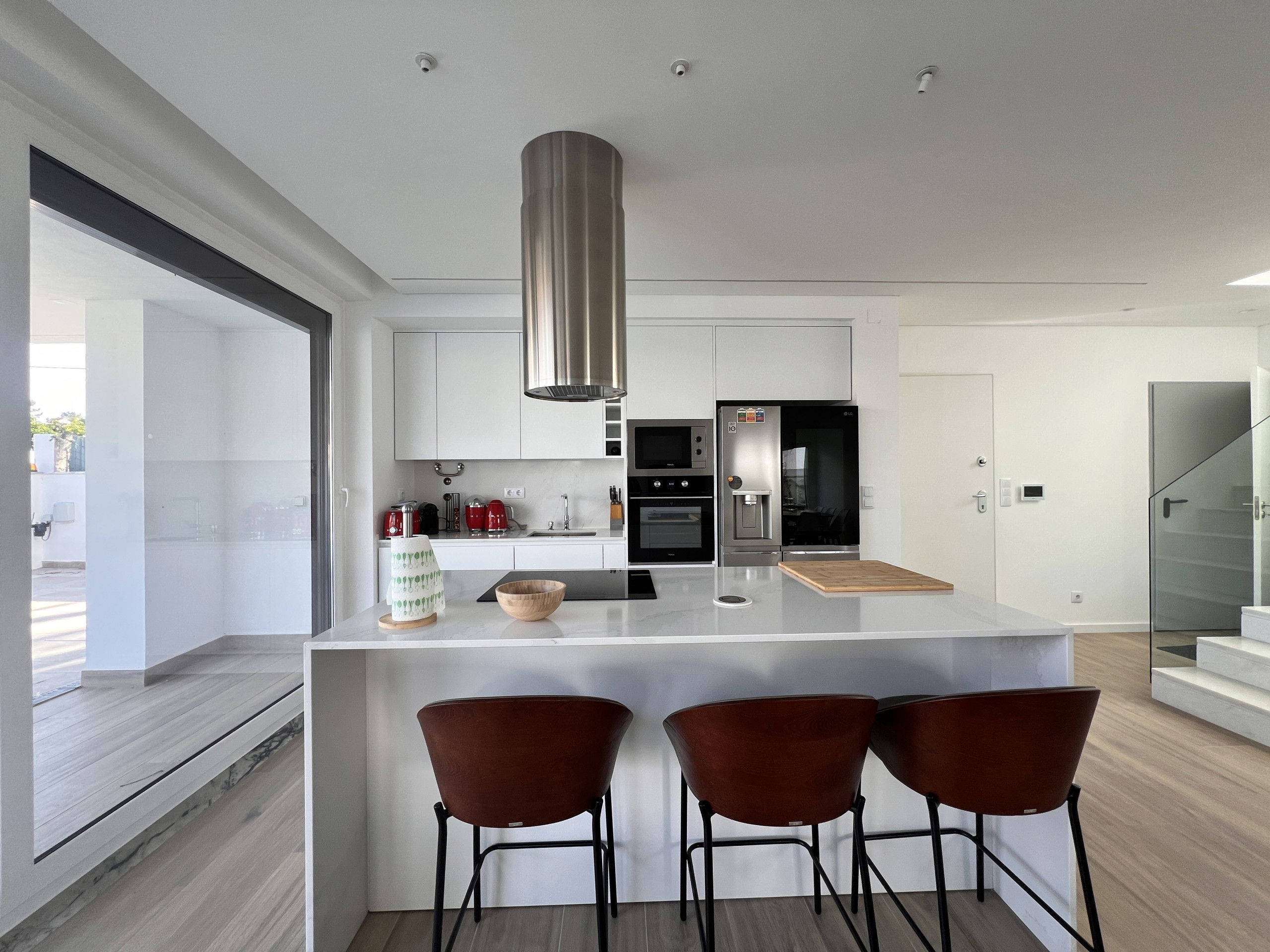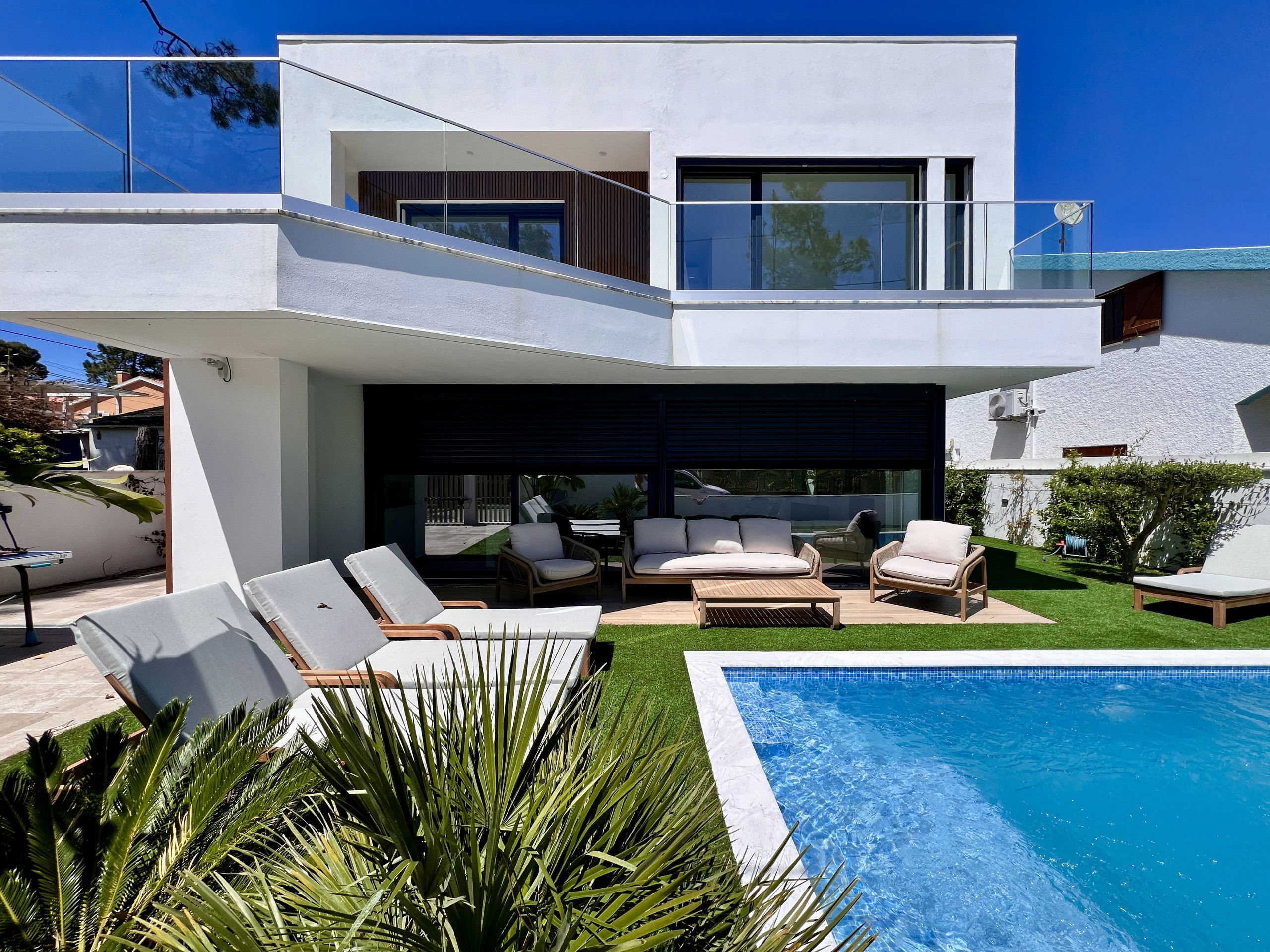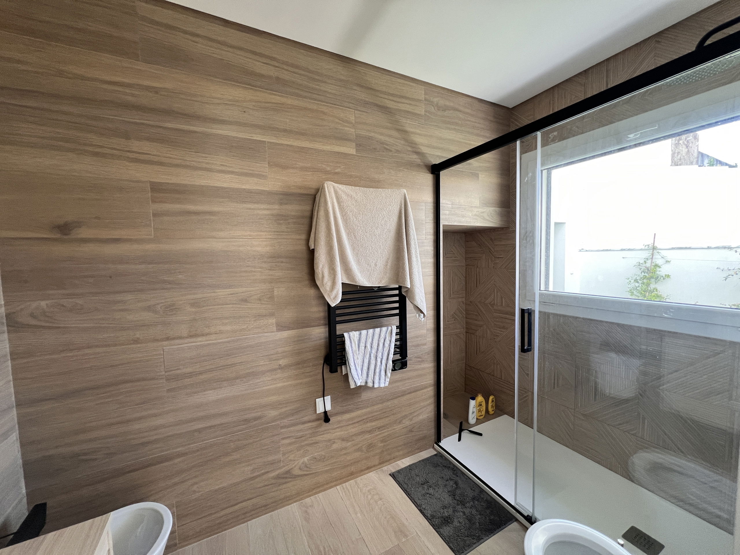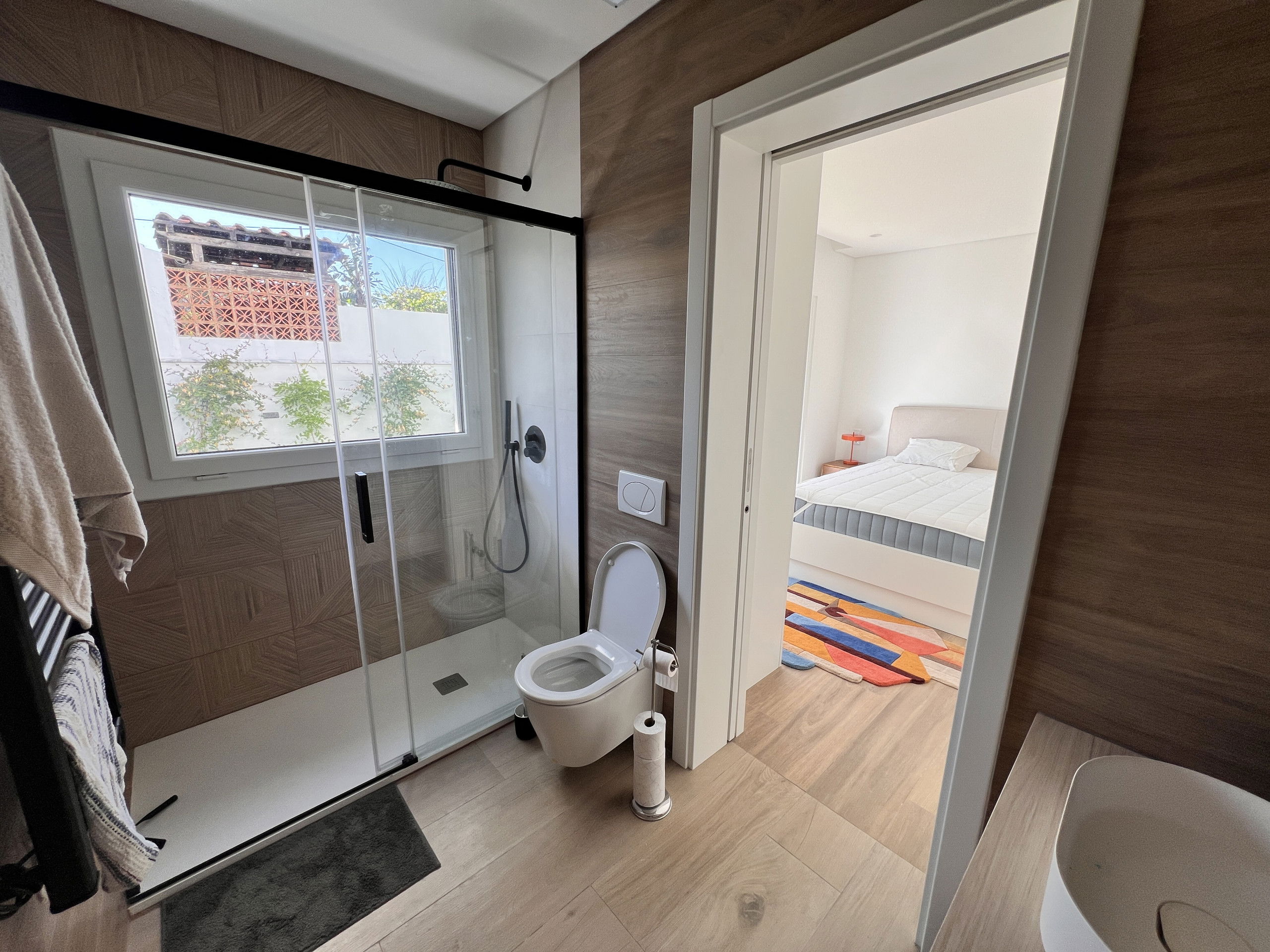 La maison se déploie sur deux niveaux, avec un rez-de-chaussée et un étage, et dispose de la climatisation dans toutes les pièces. Vous y trouverez une suite au rez-de-chaussée, une deuxième suite à l’étage, ainsi que deux chambres supplémentaires partageant une salle de bain commune. Les espaces de vie sont lumineux et conviviaux grâce à une grande cuisine ouverte sur le salon, prolongée par de larges baies vitrées donnant directement sur le jardin.