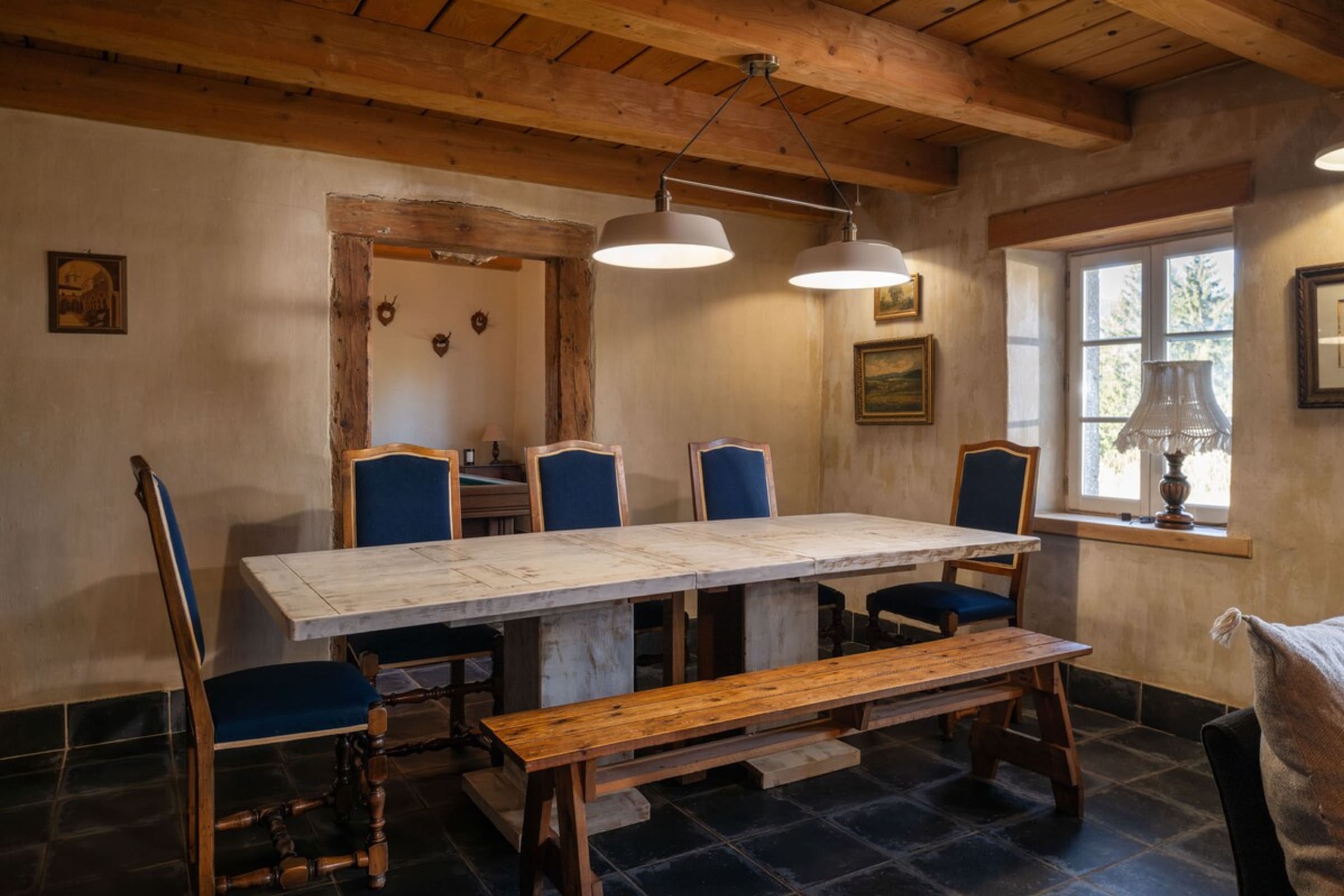 Au rez-de-chaussée : un espace de vie spacieux et chaleureux avec cheminée, coin repas et salon confortable, parfait pour partager des repas ou se détendre au coin du feu. Un espace billard et fléchettes est attenant au séjour. Un wc séparé.
