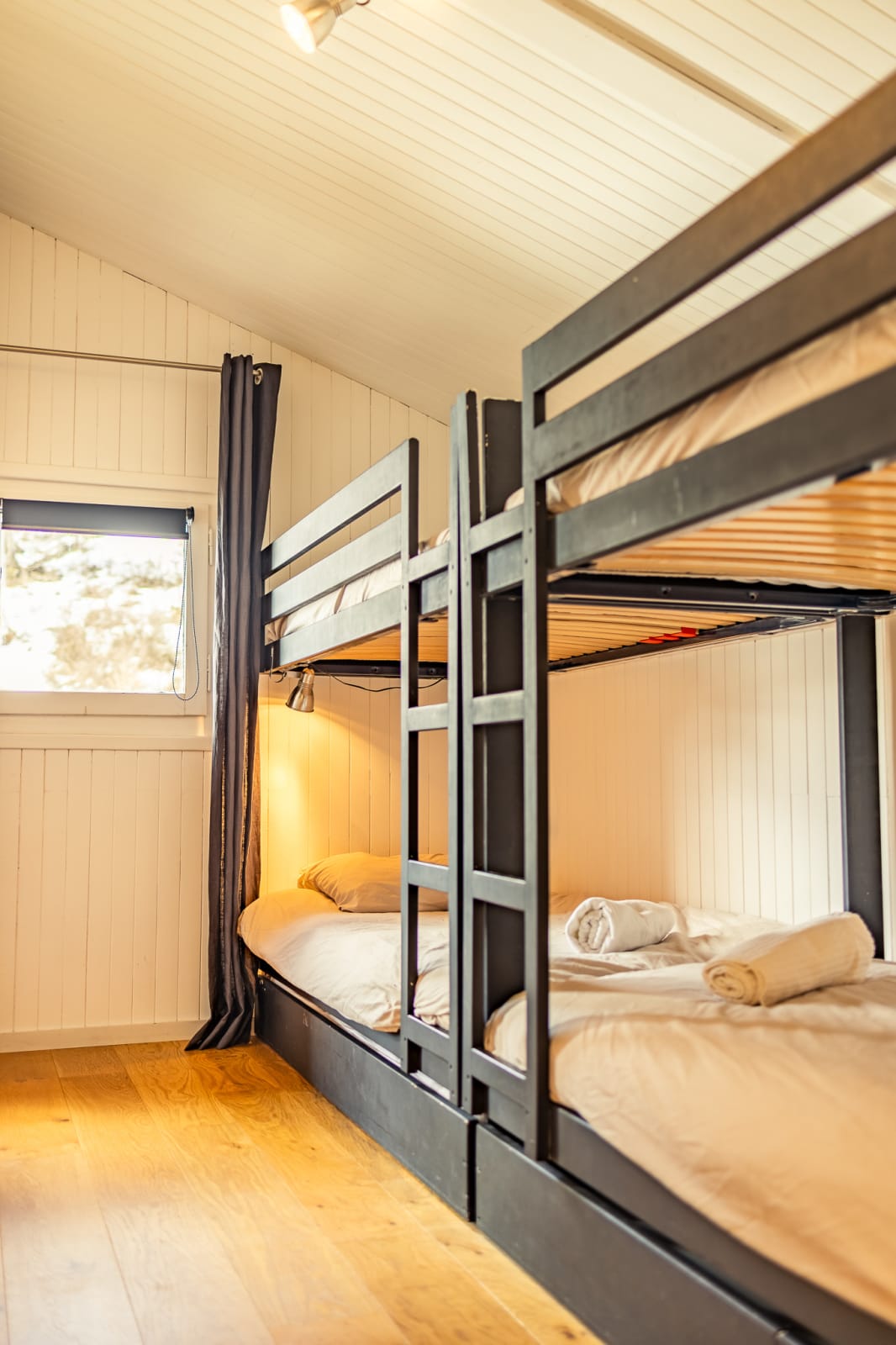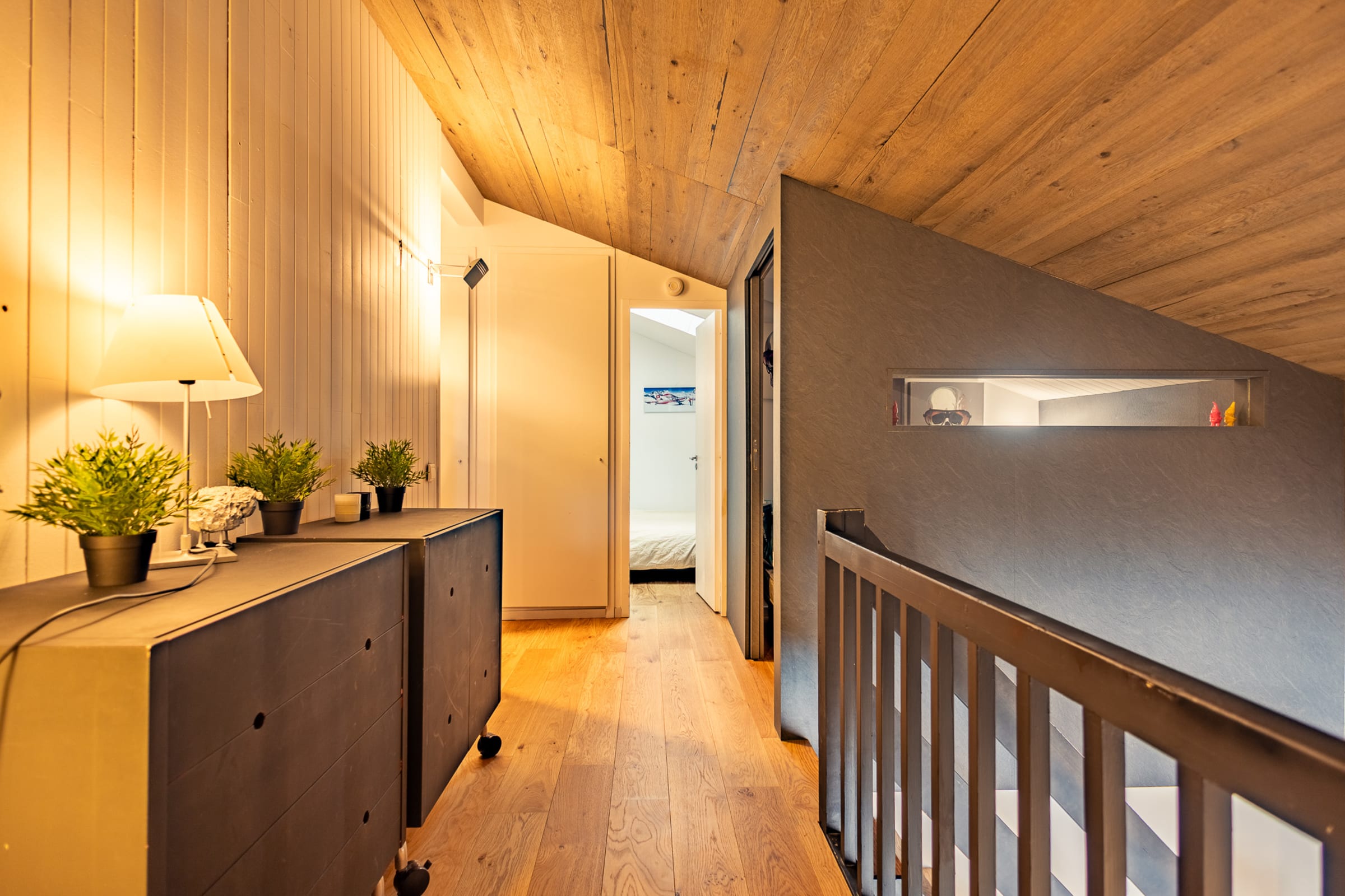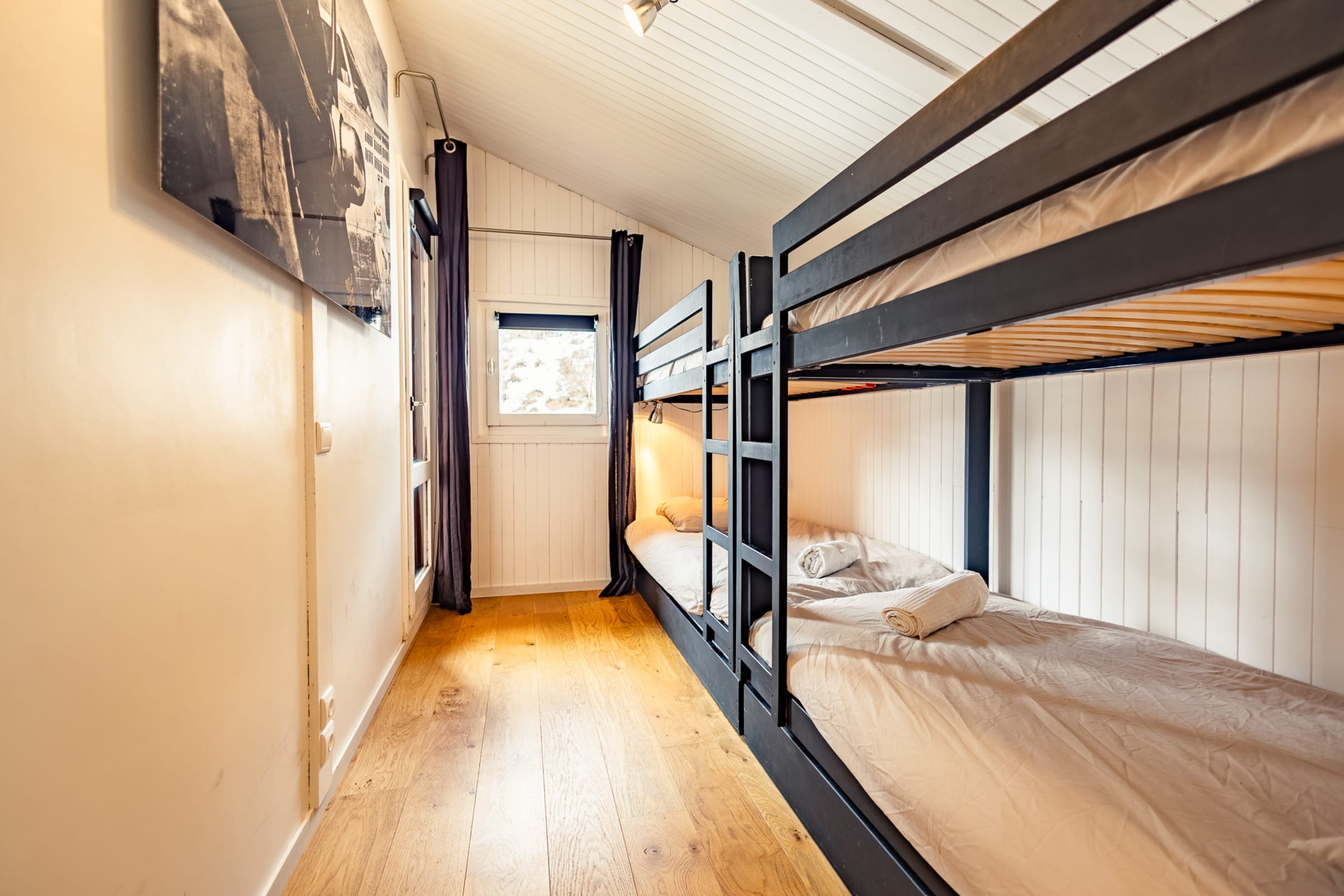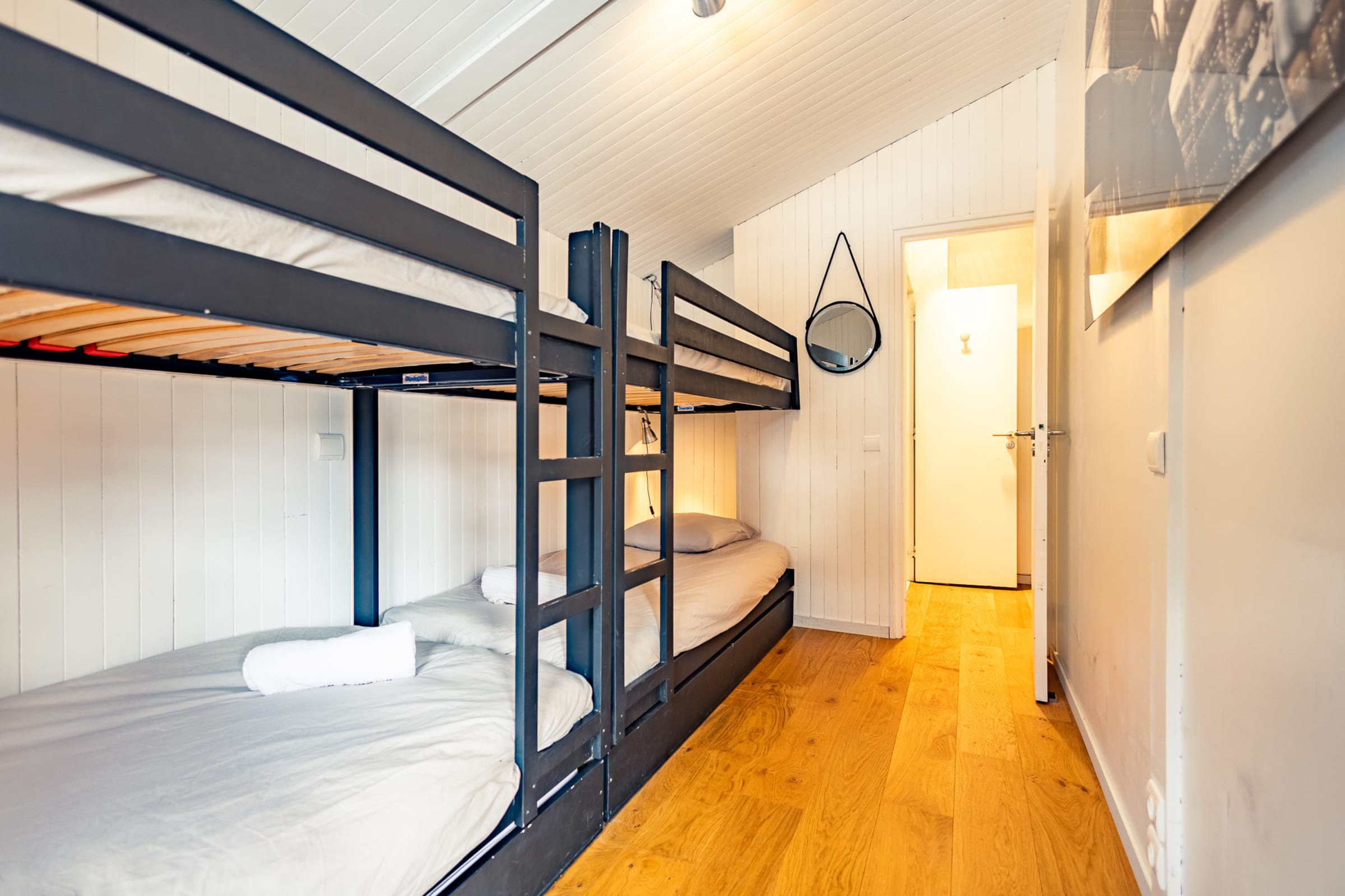 À l’étage, vous trouverez trois chambres : une chambre parentale avec un lit double en 160, une seconde chambre avec un lit double en 140, et une troisième chambre avec deux lits superposés, soit 4 couchages. Une deuxième salle de bain avec baignoire complète l’étage. L’appartement dispose également d’un second balcon, lui aussi exposé sud avec vue dégagée sur les pistes. Traversant, spacieux et baigné de lumière, il est idéal pour un séjour chaleureux à la montagne.