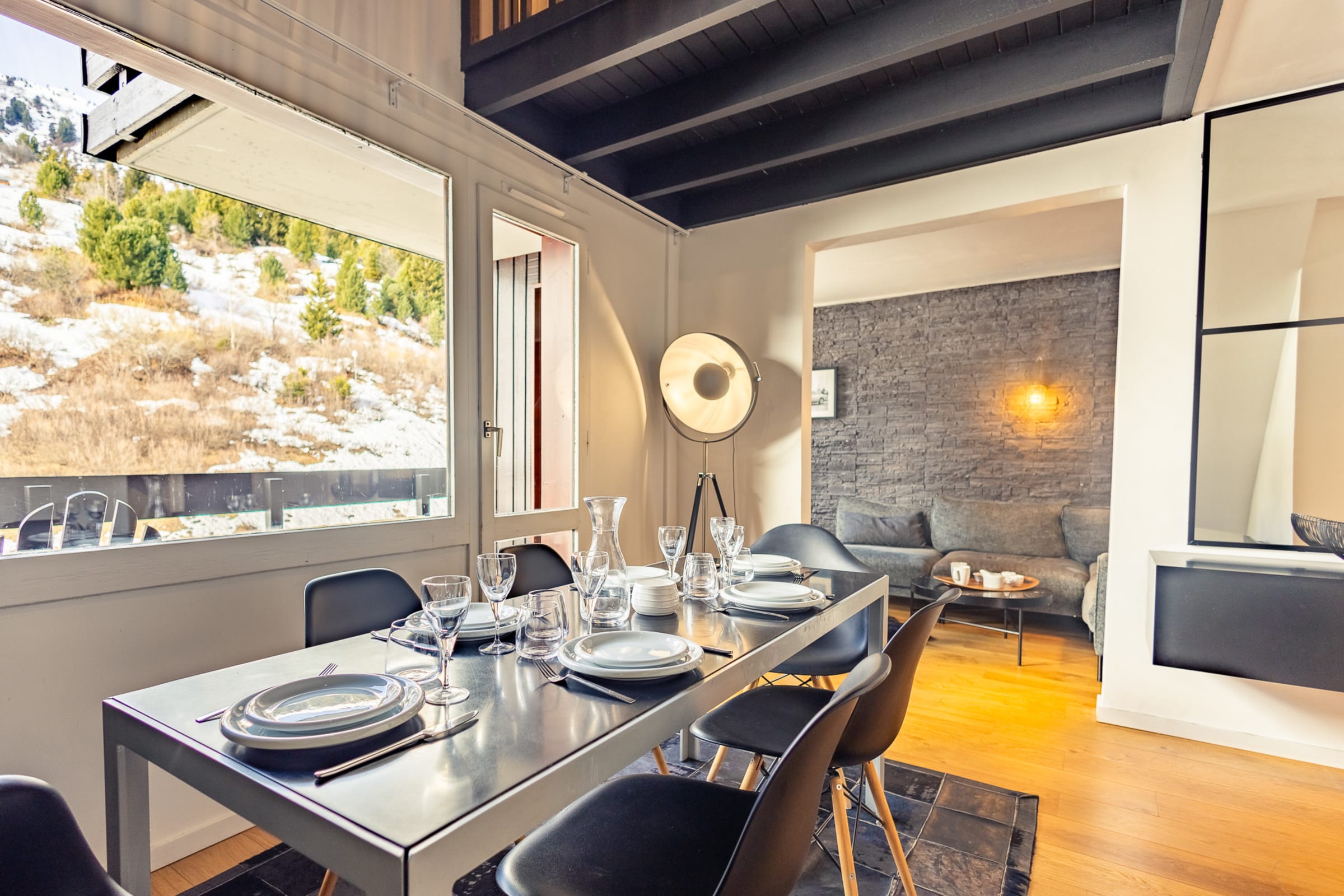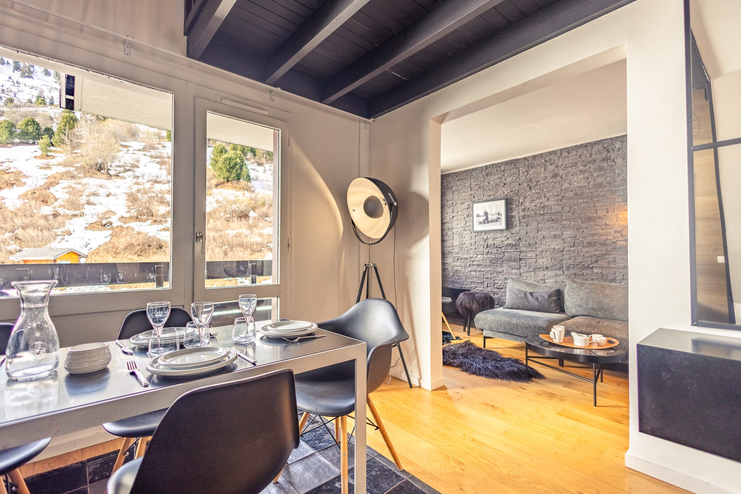 Le premier niveau comprend une belle pièce de vie avec une cuisine ouverte entièrement équipée (vaisselle, verres à vin, cafetière à filtre, plaques de cuisson, four, lave-vaisselle et grand réfrigérateur), une grande table à manger, un salon confortable avec canapé et télévision, une salle de bain avec douche, ainsi qu’un balcon exposé sud offrant une vue imprenable sur la piste Perdrix.
