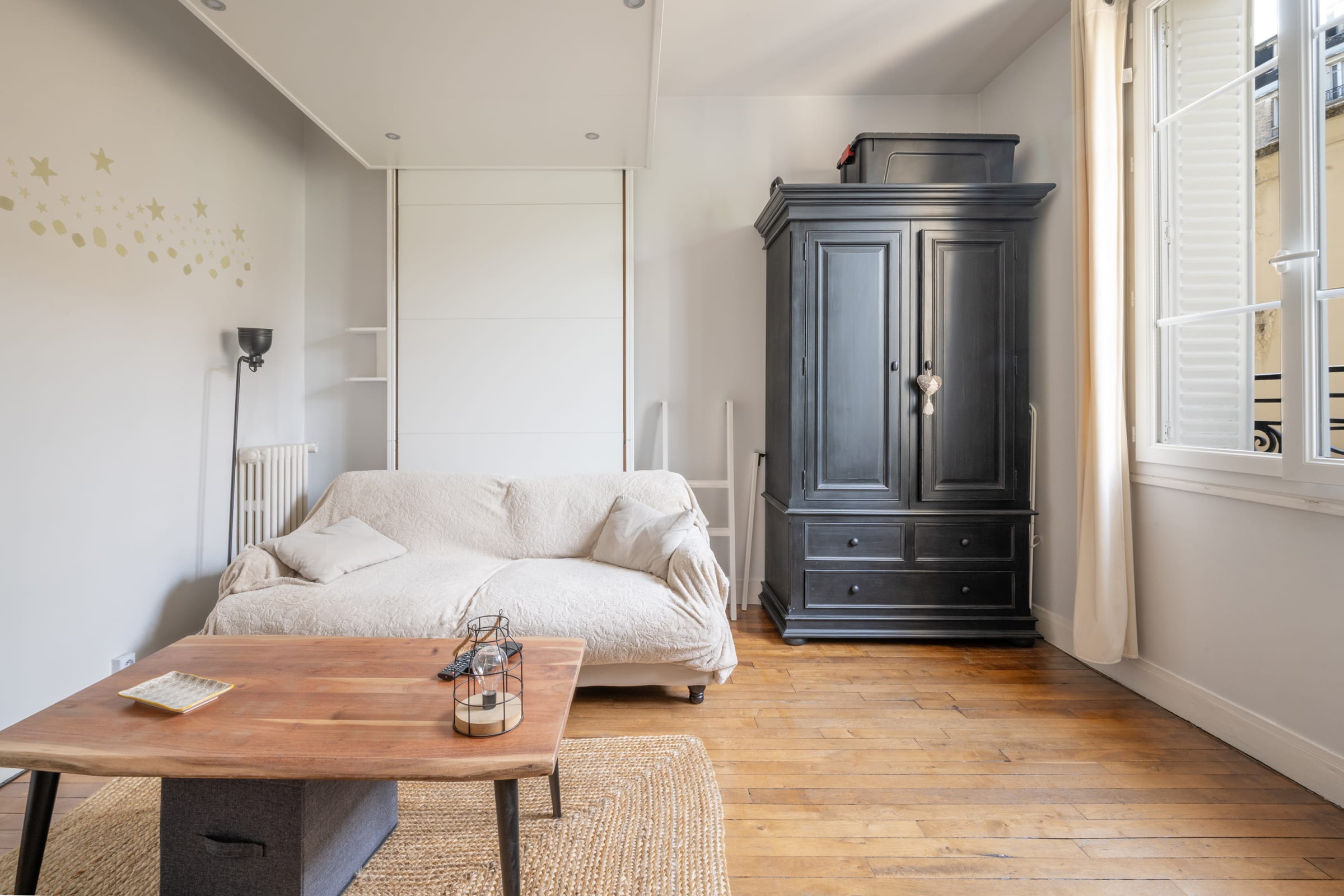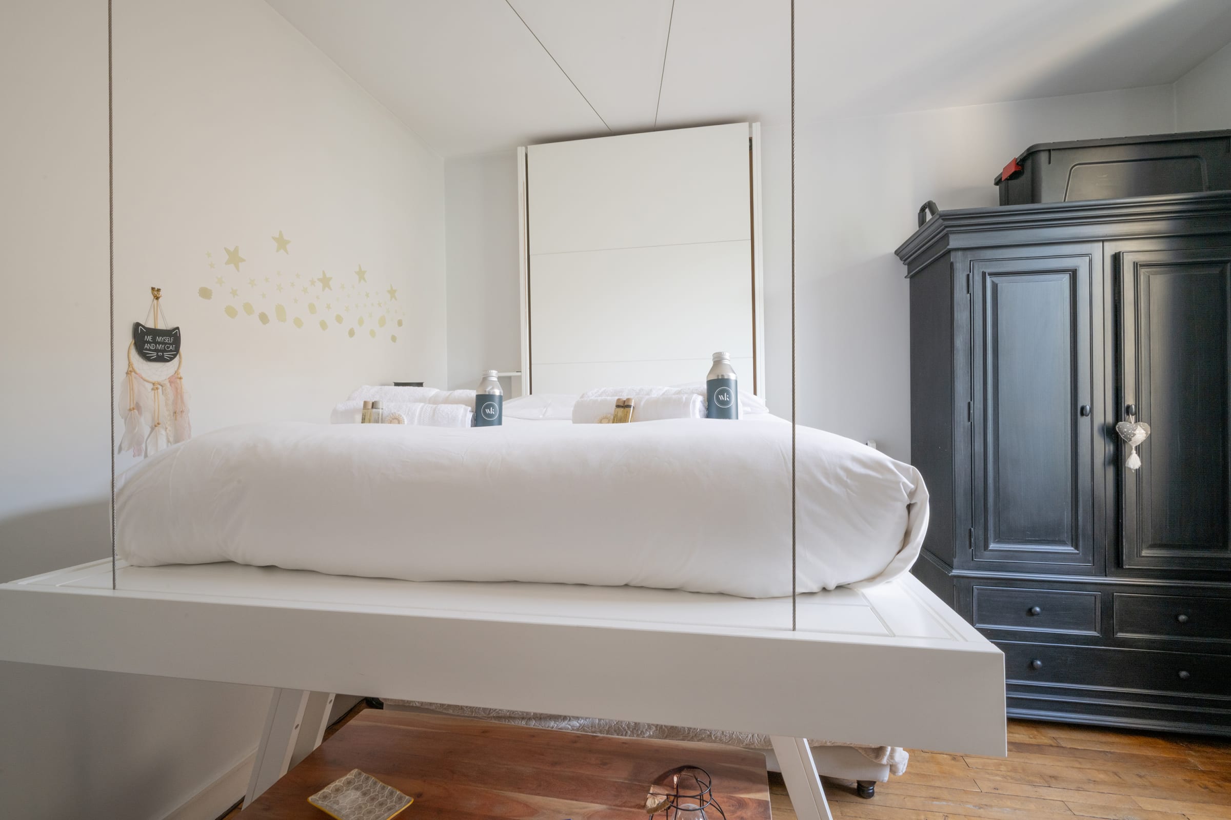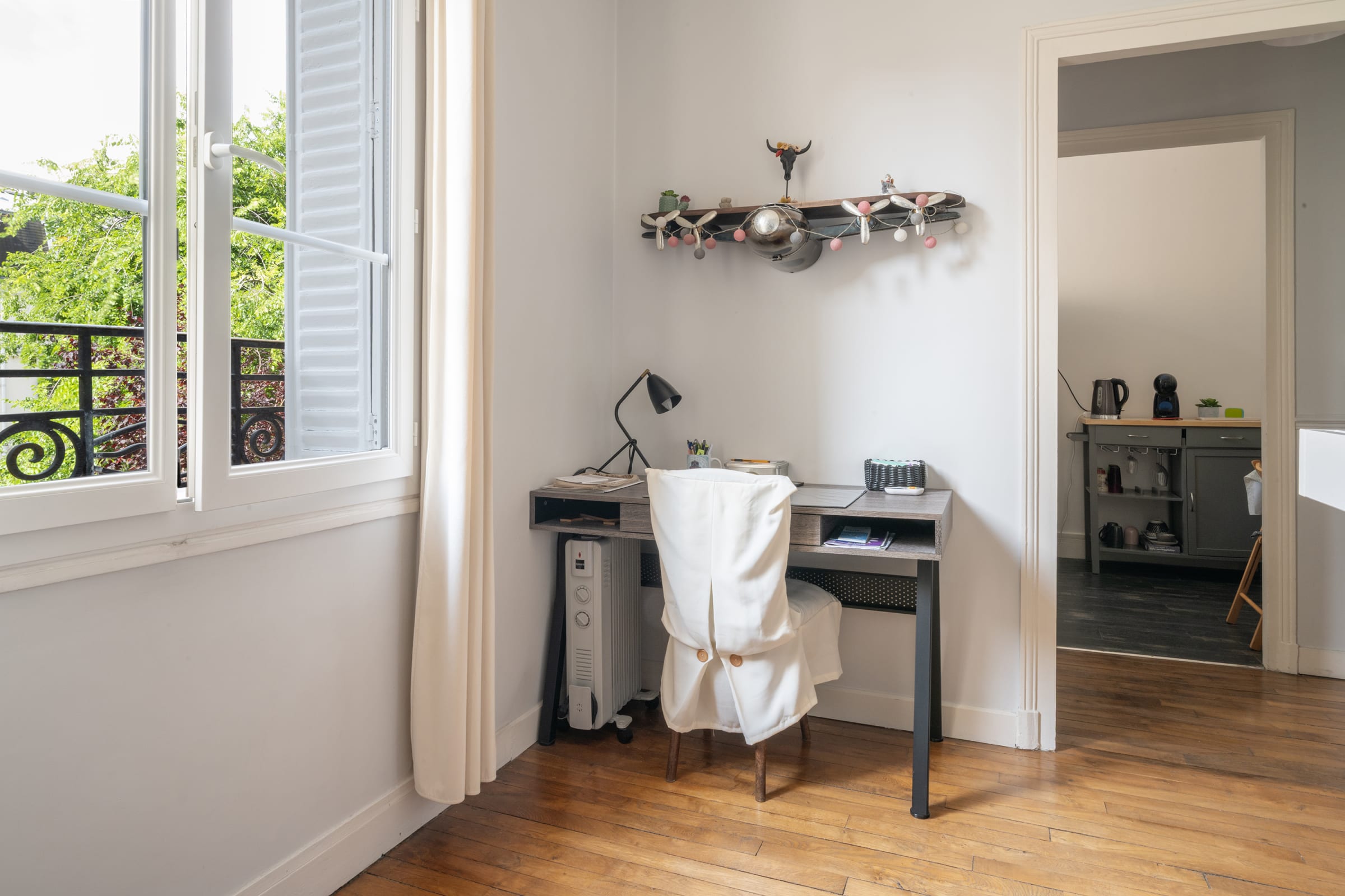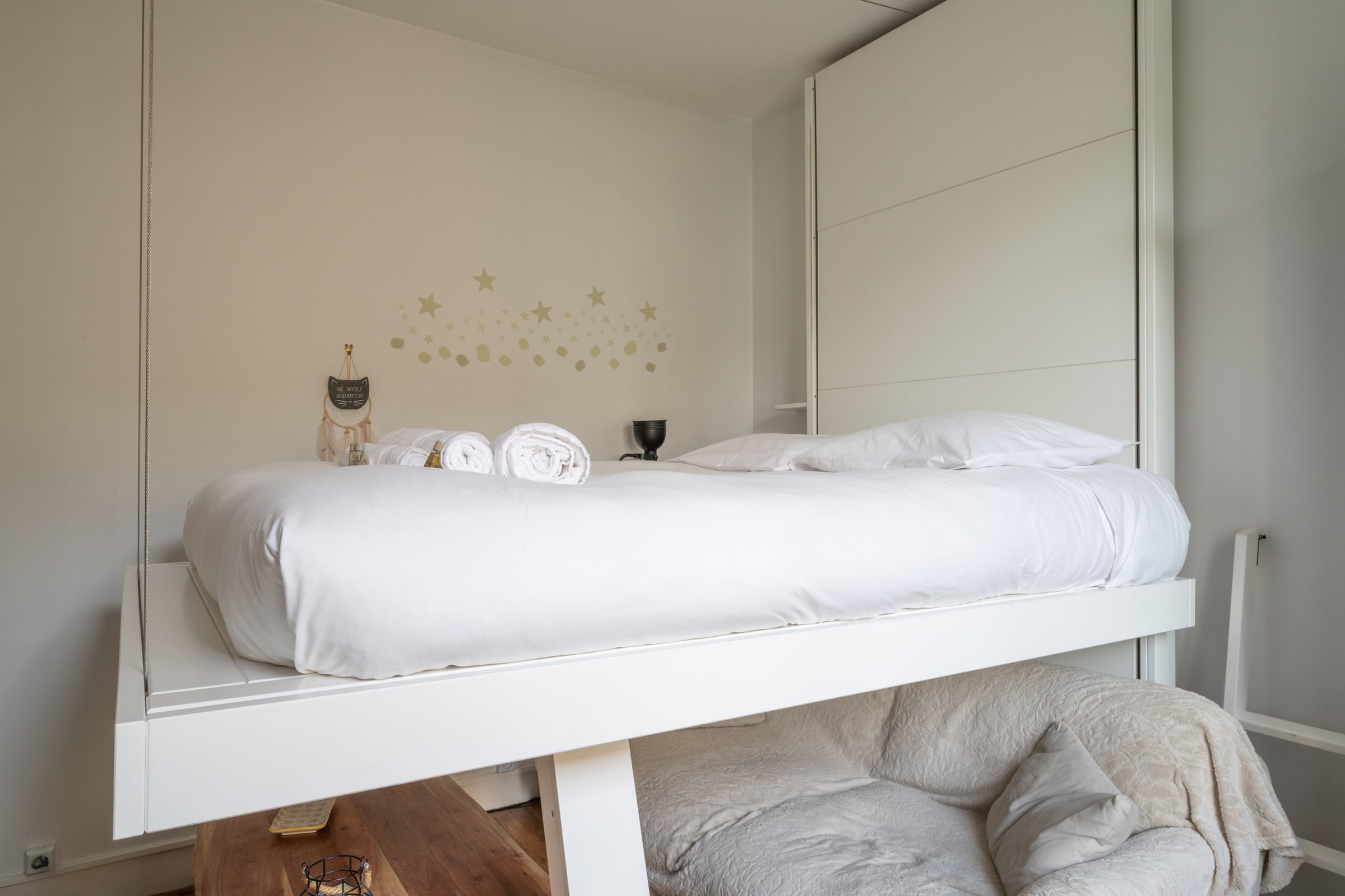 - une pièce principale lumineuse avec un bedup 140 × 190 cm et un coin bureau de travail,