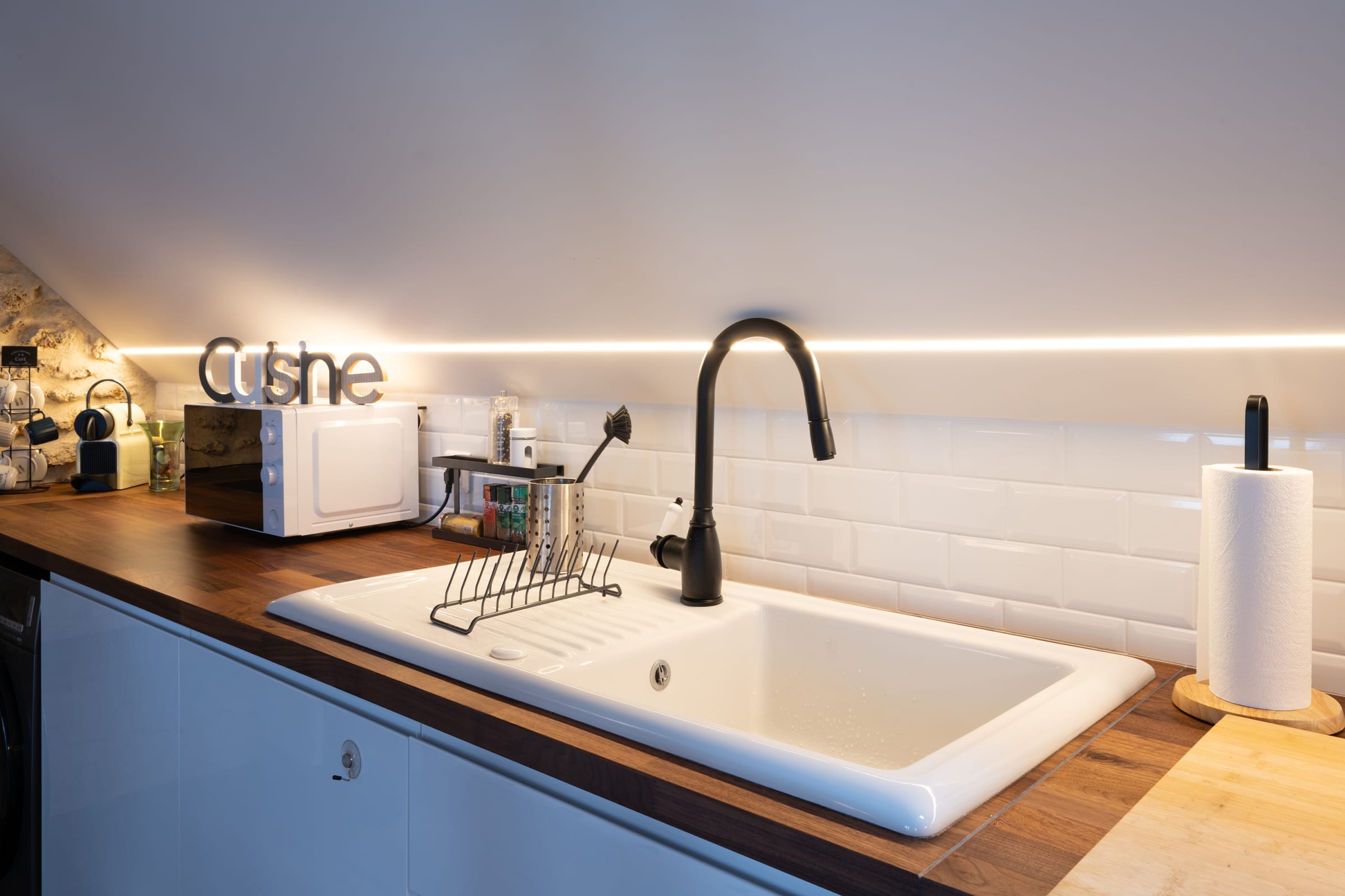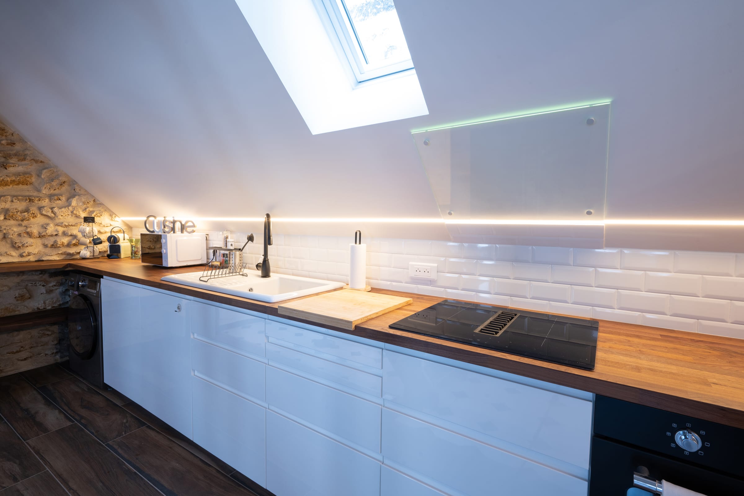 - une cuisine ouverte parfaitement équipée (machine à café, grille-pain, mixeur, bouilloire, four, micro-ondes, plaques de cuisson, lave-vaisselle, réfrigérateur, congélateur),