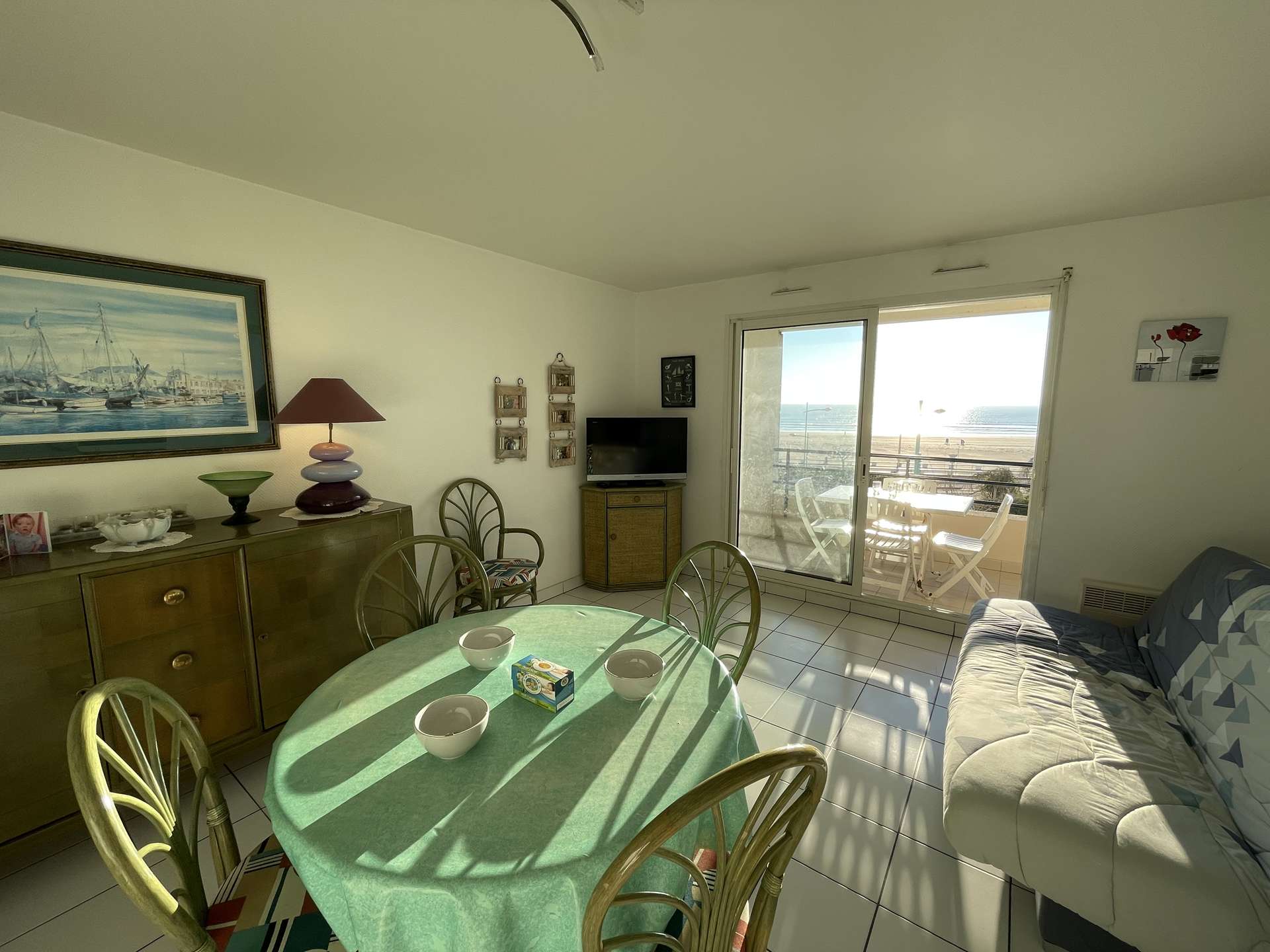 Cette location à la mer, située au 2ème étage avec ascenseur, comprend un séjour avec télévision et très belle vue imprenable sur la mer, un coin cuisine équipé (four électrique, micro-ondes, lave-vaisselle et plaque induction), une chambre avec un lit double 140, une chambre avec 2 lits simples 90, une salle de bains, un wc indépendant.
